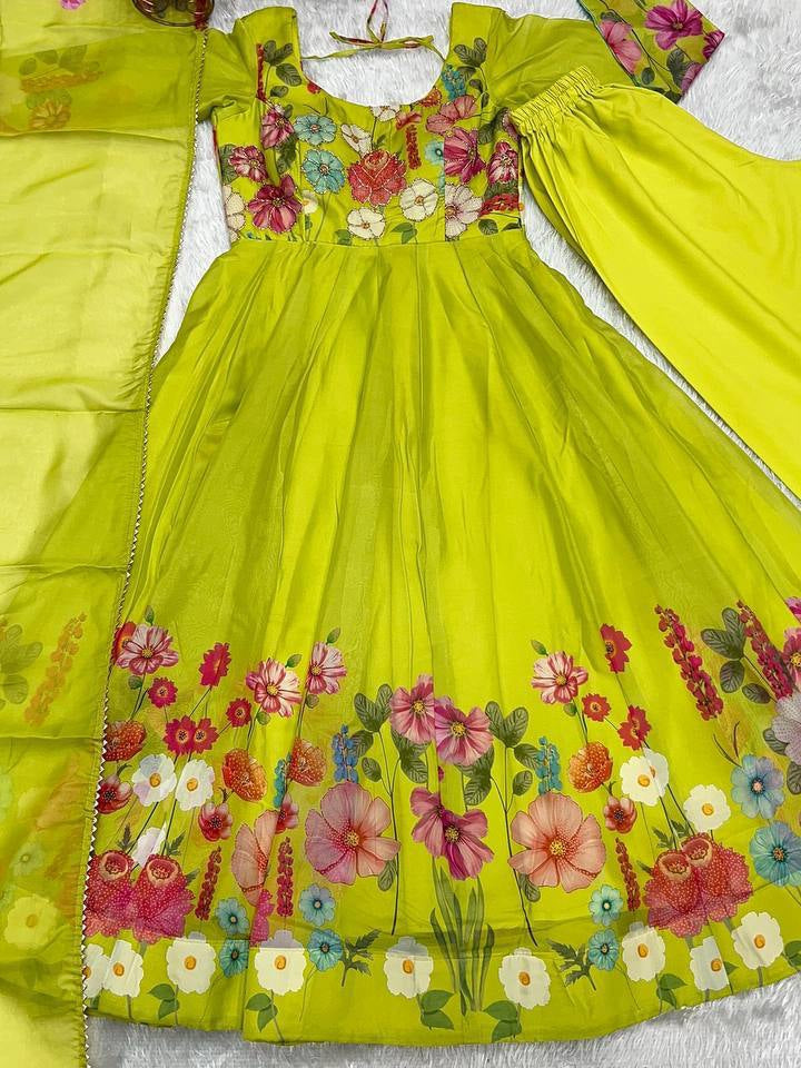 This Darshika Green Organza Floral Printed Anarkali Suit Set features pure soft organza silk fabric and beautiful printed and badla zari work. Crafted with expertise, this suit set offers both comfort and style. Elevate your wardrobe with this elegant and versatile piece.