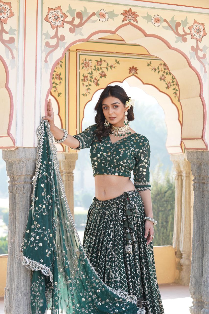 Get ready to make a statement with our Blooming Sequins Green-Colored Embroidered Lehenga Elegance! This stunning outfit features bold sequin details and intricate embroidery, perfect for adding a touch of elegance to any occasion. Stand out from the crowd and embrace your unique style with this one-of-a-kind lehenga.
