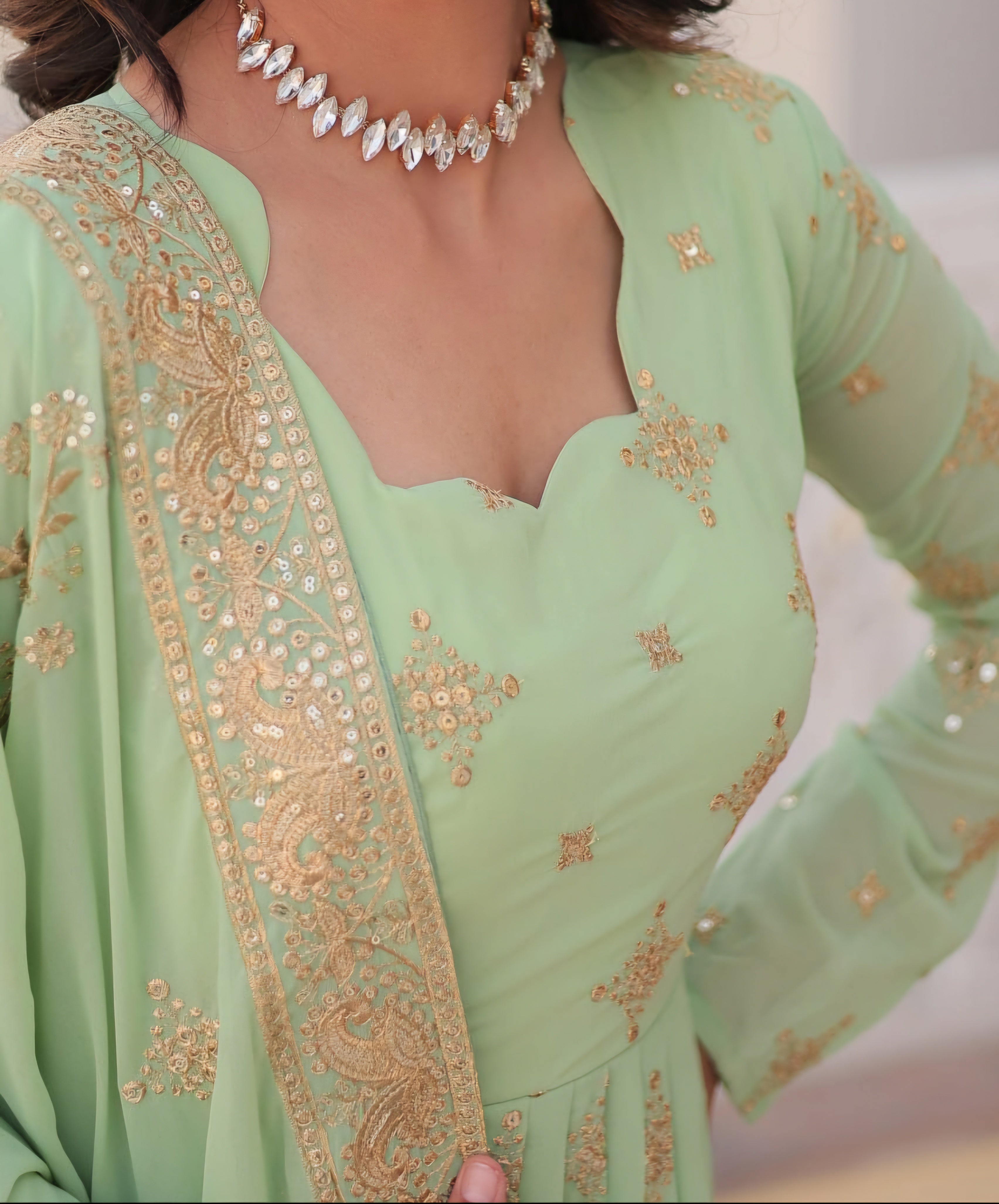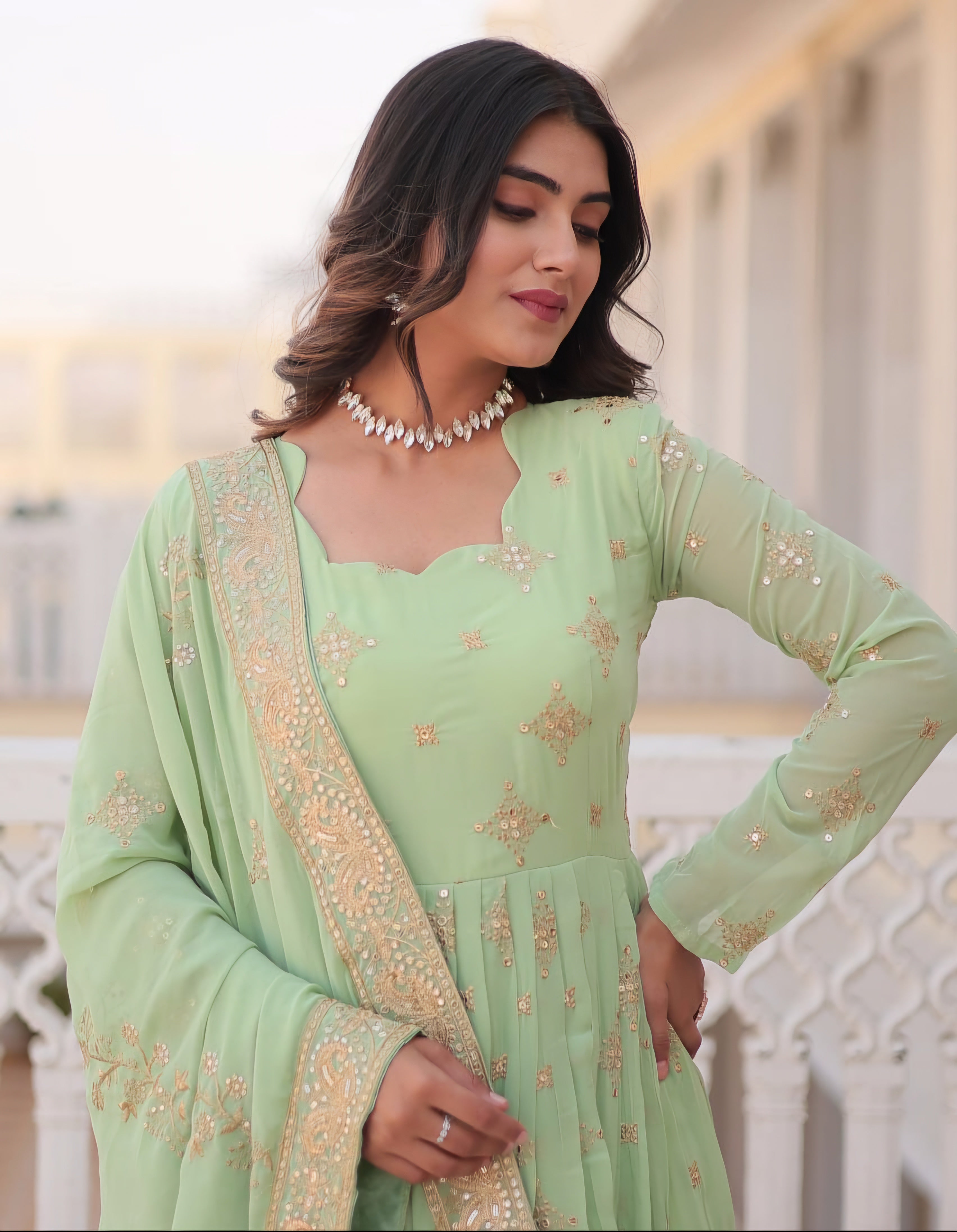 Elevate your ethnic look with Sevya Blue Georgette Embroidered Anarkali Gown Set. Crafted with a sky blue faux georgette gown and adorned with intricate sequins embroidery, it comes with a matching dupatta for a complete look. Stand out and make a statement at any occasion with this elegant ensemble.