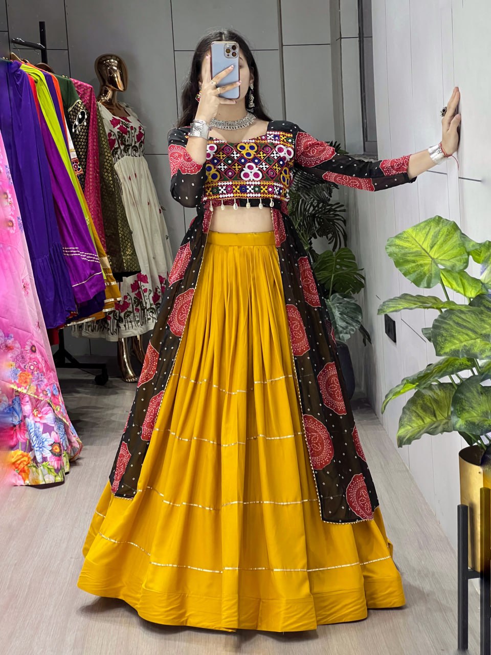 Mustard Yellow Rayon Bandhani Print Gota Patti Work Faux Georgette Kurti Lehenga