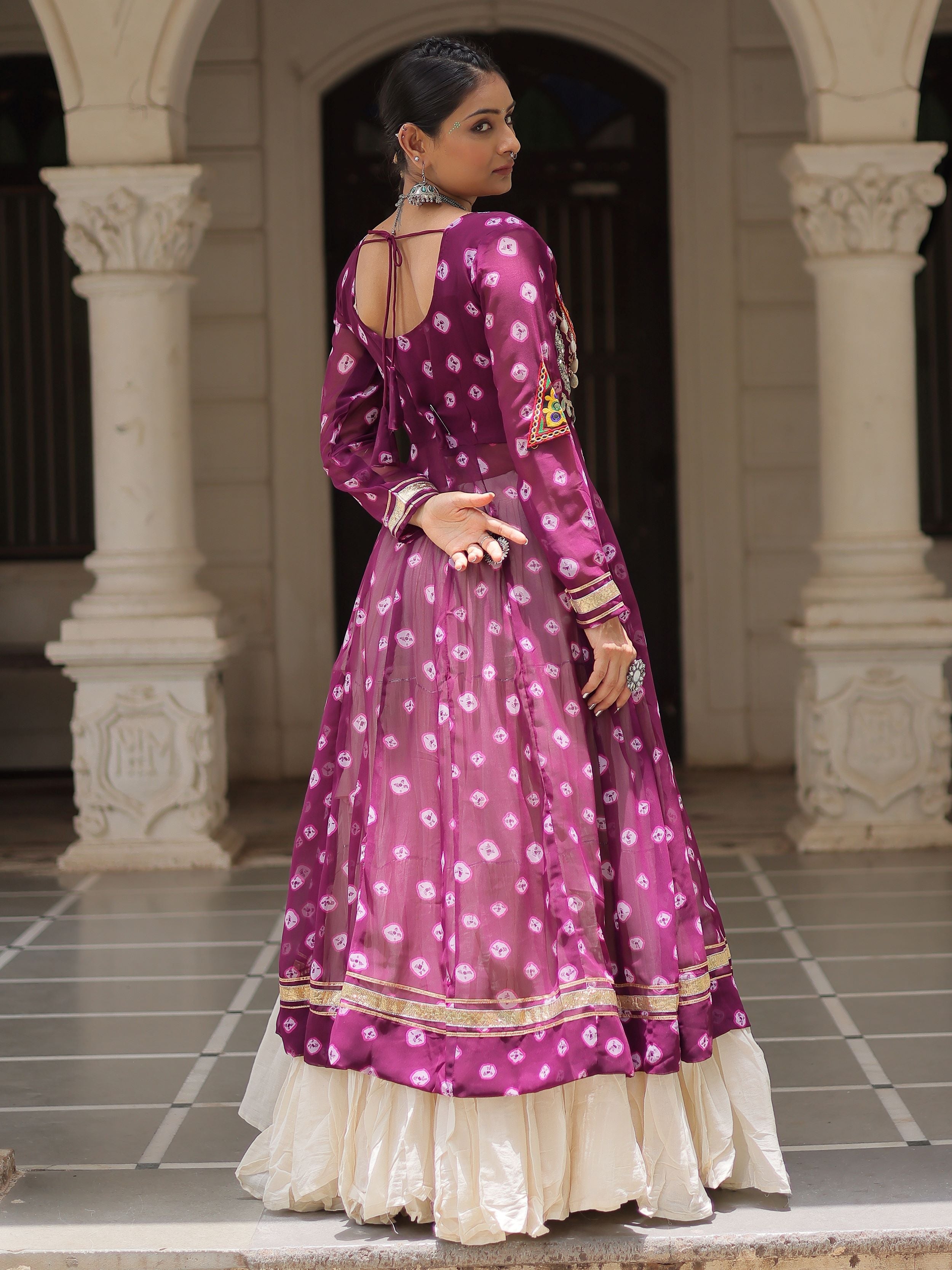 Purple Bandhani Print Kurti with Kutchi Patchwork Kora Cotton Lehenga