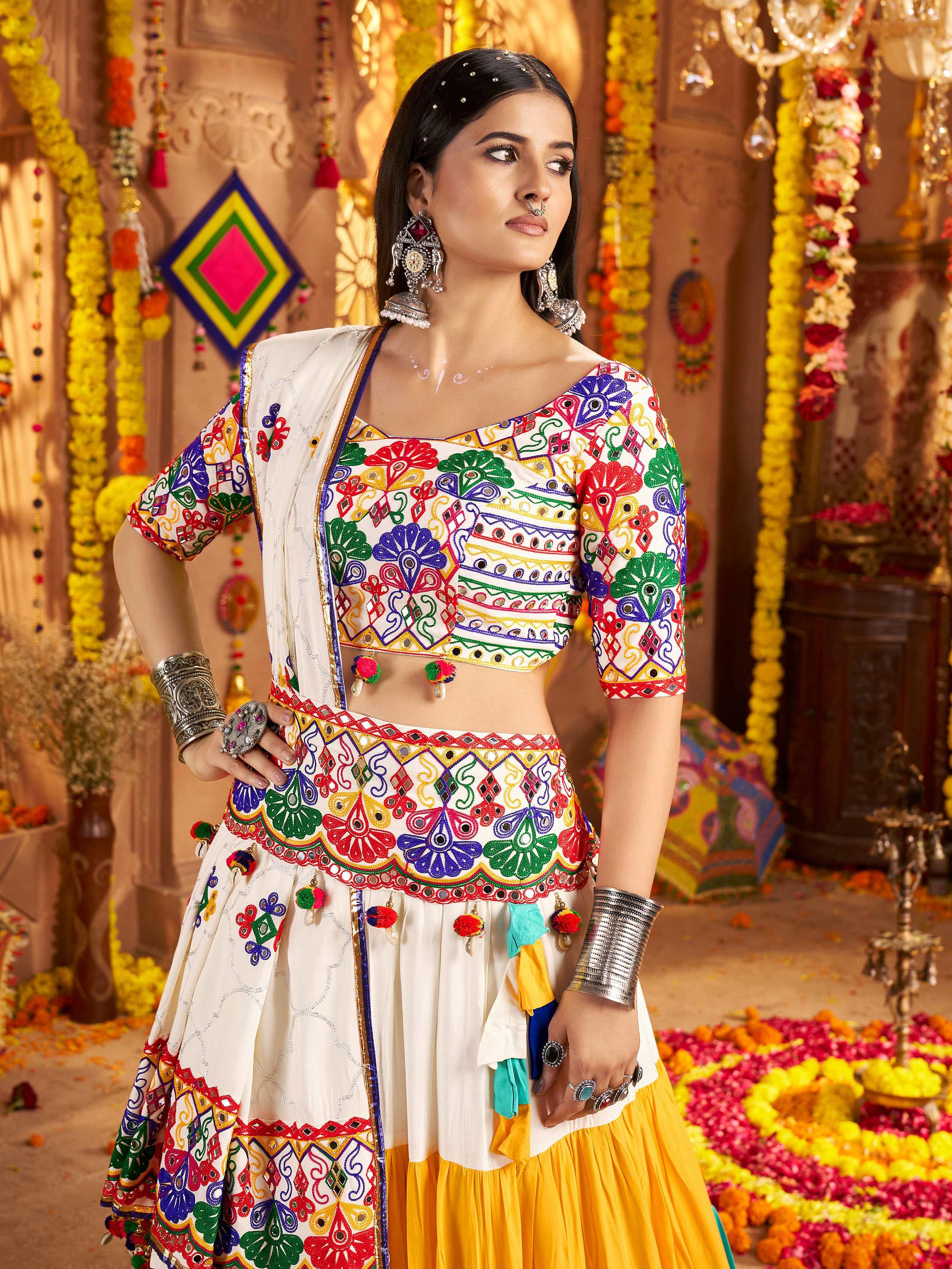 White Multicolor Viscose Cotton Mirror Embroidery Navratri Lehenga Choli