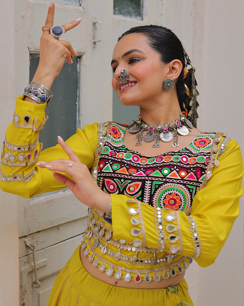 Yellow Roman Silk Gota Patti Lace and Kutchi Gamthi Embroidered Lehenga Choli