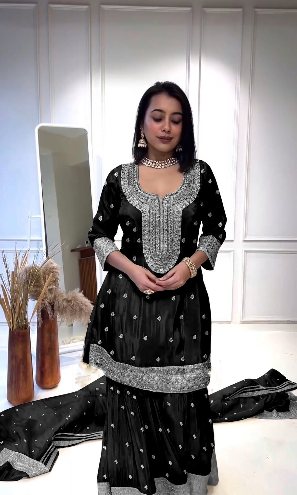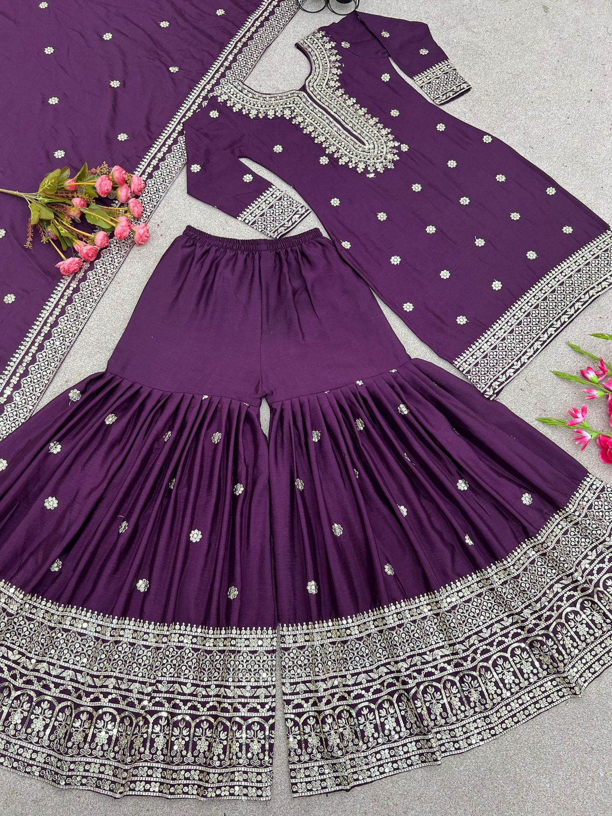 - Palazzo - Pure Heavy Chinnon Silk With 5mm Embroidery Sequence Work With Flair