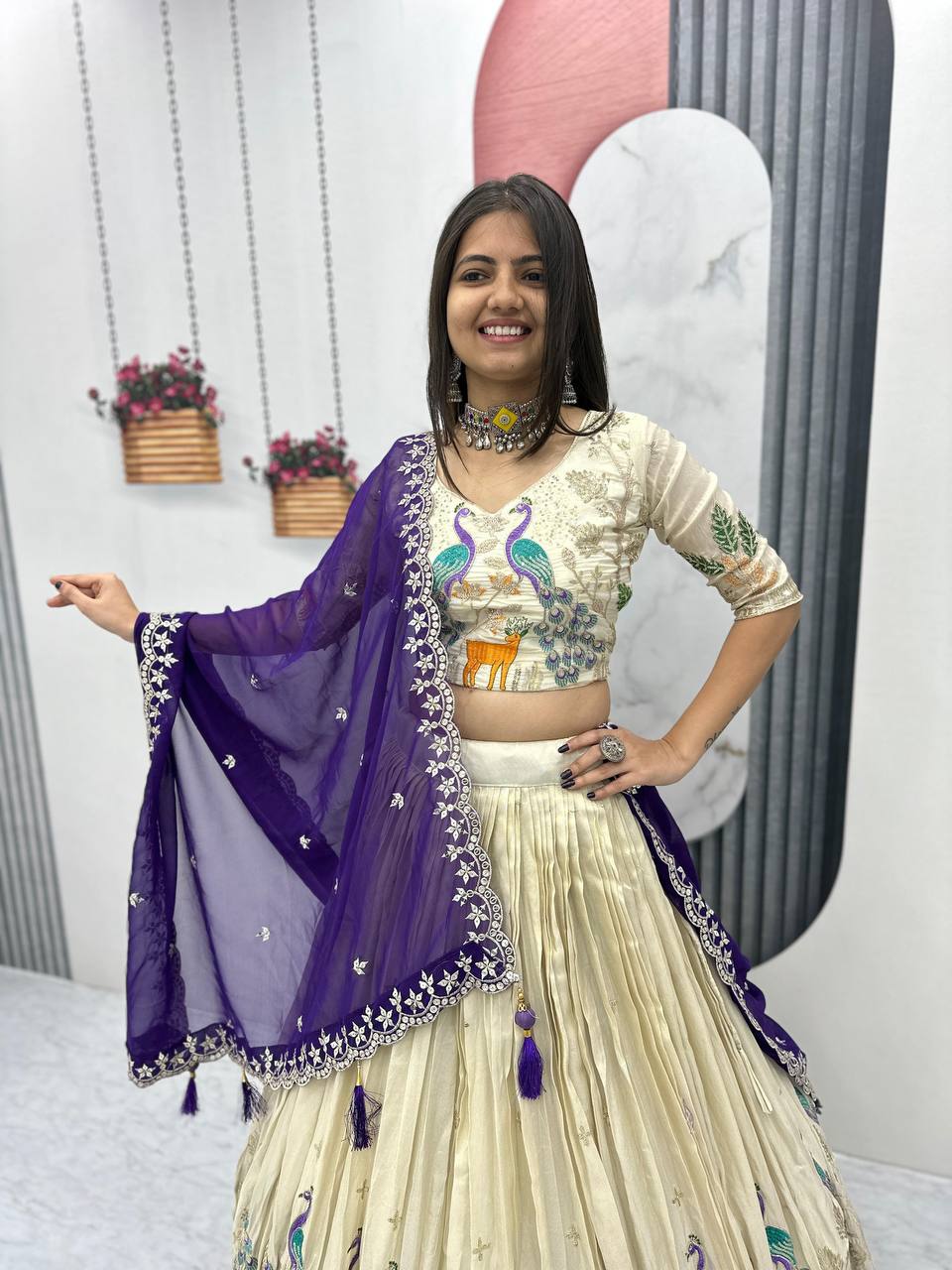 Make a grand statement at weddings and festive celebrations with the Tarini Purple Tissue Silk Embroidered Lehenga Choli. Designed with exquisite craftsmanship, this luxurious ensemble features heavy thread and sequins embroidery on premium pure tissue silk, giving it a regal and timeless appeal. The set includes a fully stitched choli, a stunning lehenga with canvas and cancan for added volume, and a beautifully embroidered dupatta with fancy latkans and cutwork detailing.