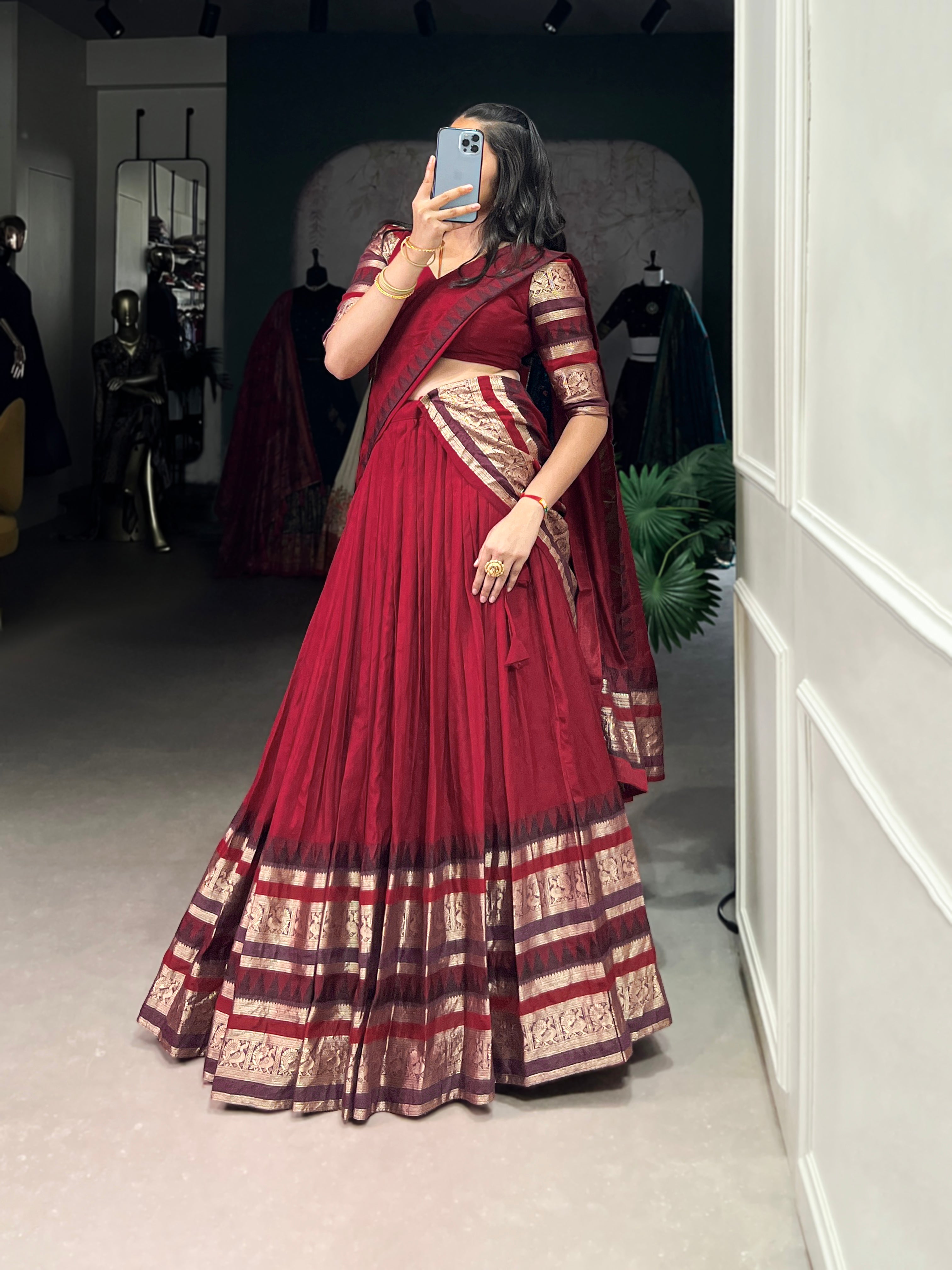 Rava Red Color Pure Chanderi Zari Weaving Half Saree Lehenga