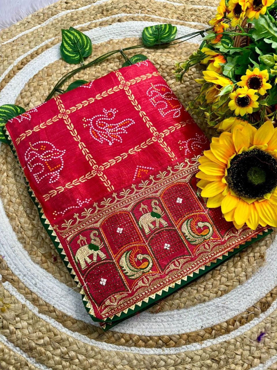 Vikatya red Jimmy Choo fabric saree with thread & sequin embroidery, unstitched blouse—perfect for weddings, parties & festive wear.