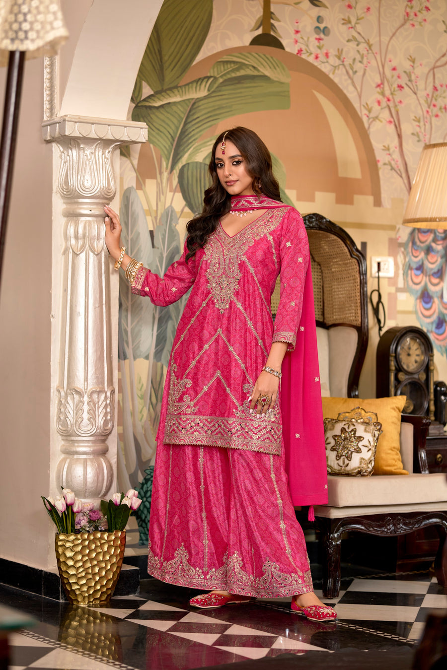 Elevate your festive look with the Meera Chinon Silk Embroidered Designer Kurti Sharara Set, a perfect blend of elegance and tradition. Featuring exquisite digital prints and intricate embroidery work, this ensemble is designed to make you stand out at any occasion. Crafted from premium Chinon silk, the set includes a beautifully embroidered kurti, a flowing sharara with front & back embroidery, and a matching embroidered dupatta for a complete regal appeal.