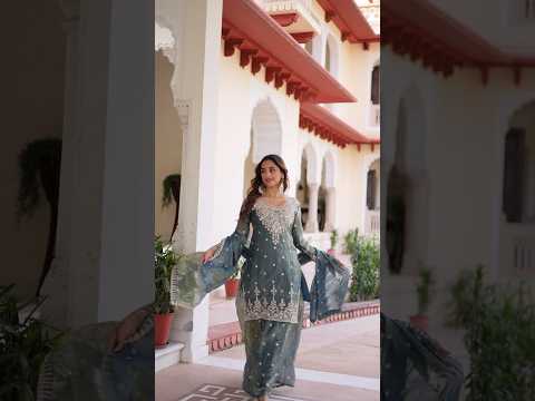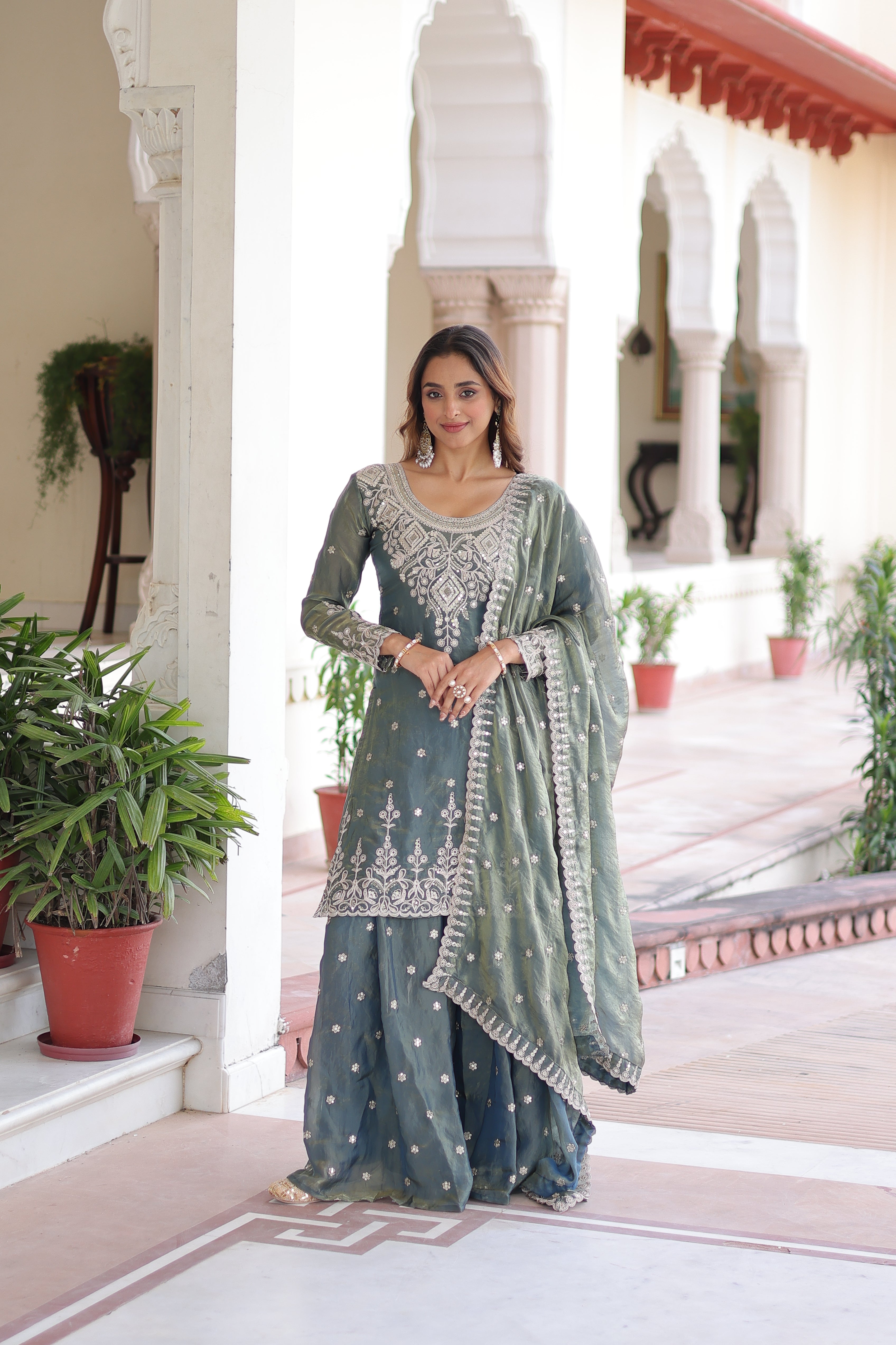 Pria Teal Green Fendi Silk Coding Sequins Embroidery Work Kurti Sharara Set