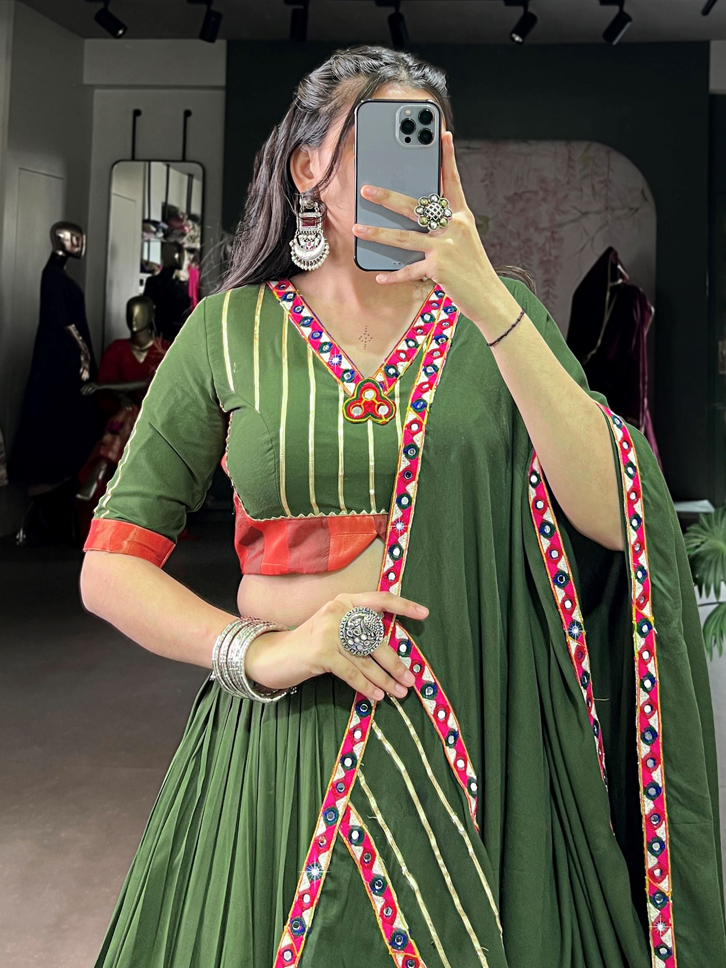 Step into the festive season with Trinari’s Premium Pure Rayon Lehenga Choli, beautifully handcrafted with authentic Mirror Gamthi embroidery and Gotta Patti lace work. With its royal flair and intricate detailing, this outfit is a perfect choice for Navratri Garba nights, traditional weddings, and festive occasions.