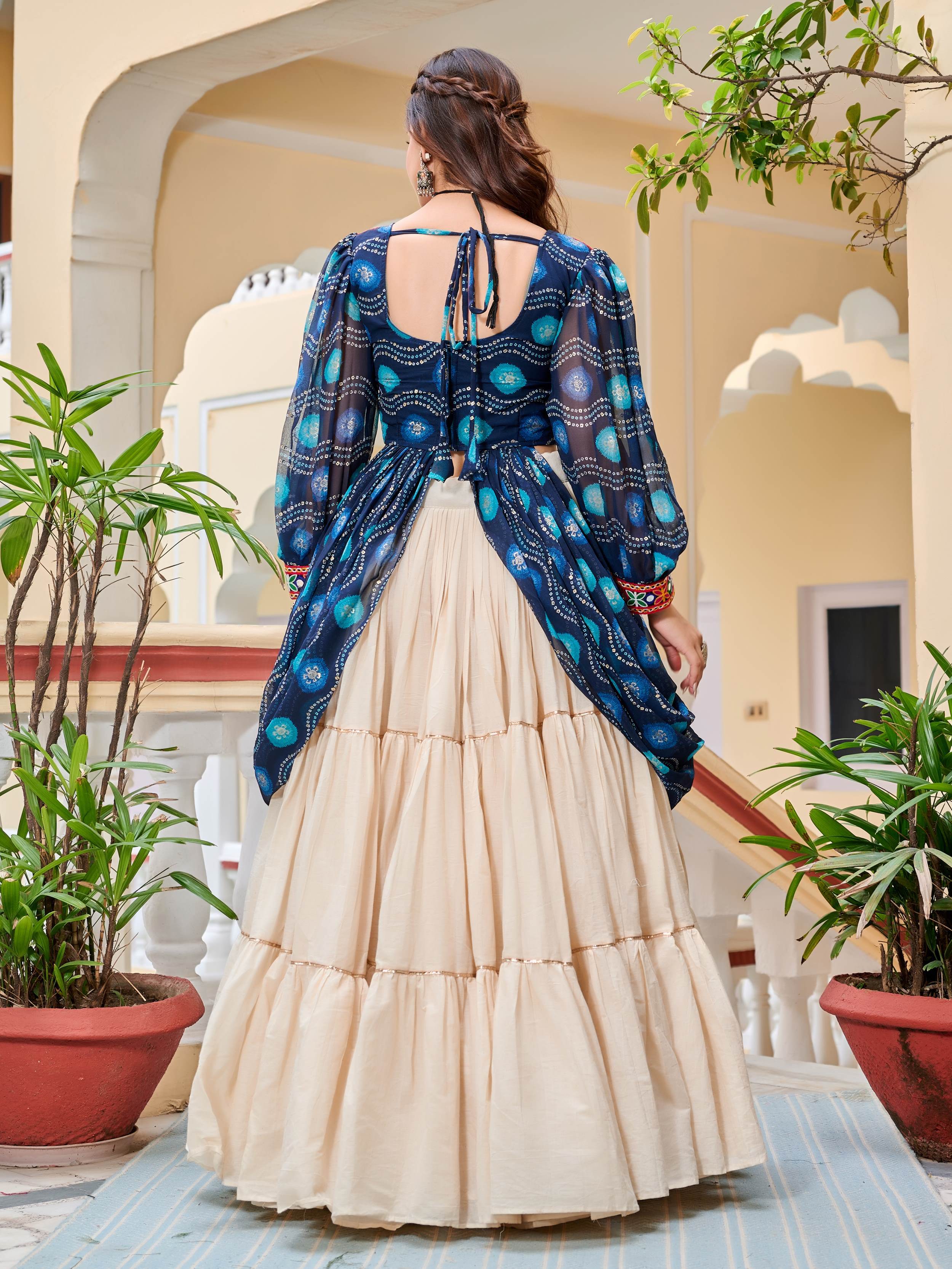 Make a bold statement this festive season with Trinari’s Cotton Lehenga Shrug Set, crafted with authentic Gamthi mirror work, ribbon lace, and Kodi lace accents. With its 9-meter grand flair, this set is perfect for Navratri Garba nights, weddings, and traditional celebrations.