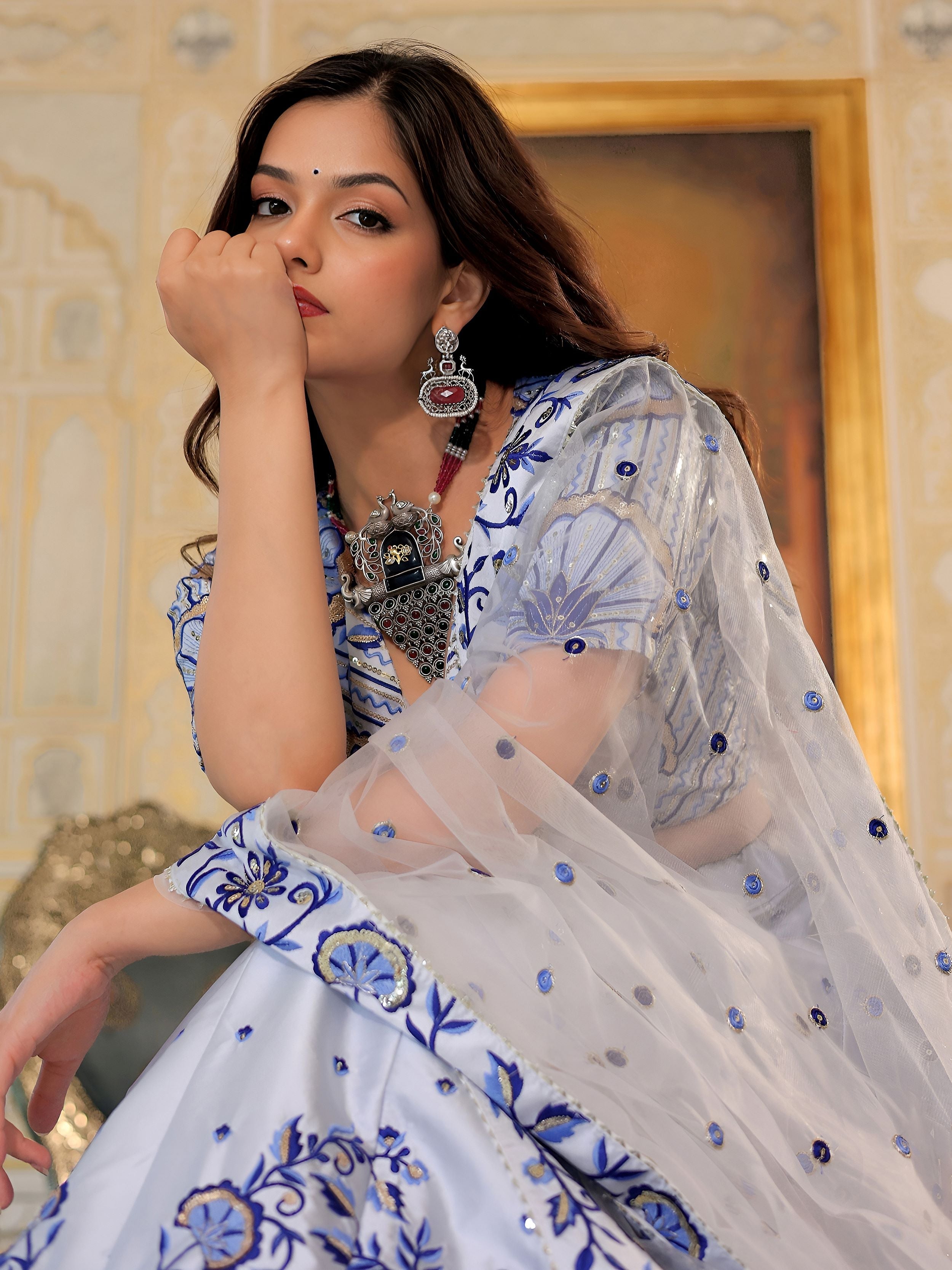 - Elegant blue satin lehenga with intricate thread & sequins embroidery