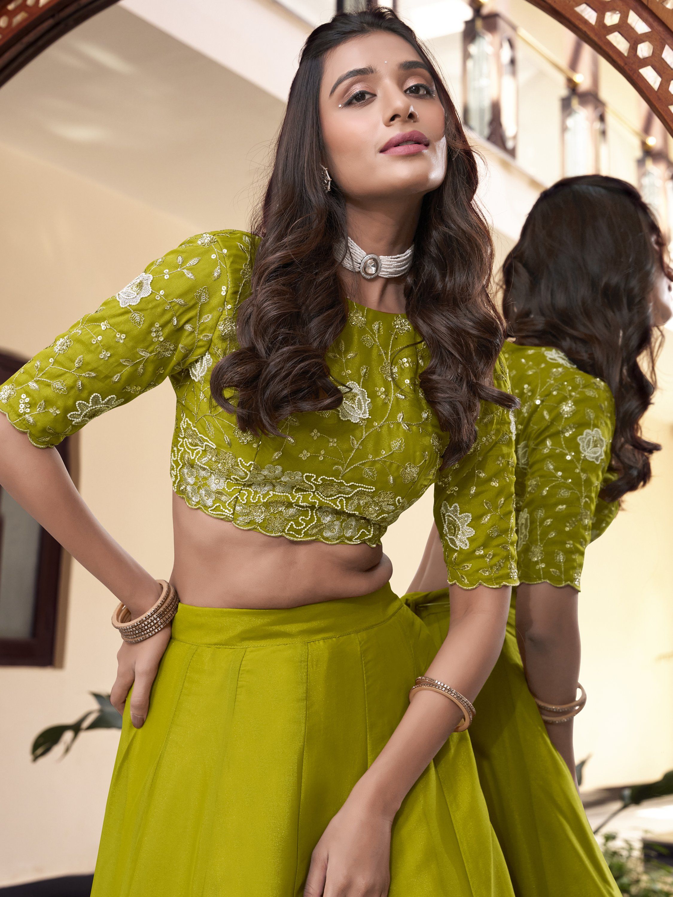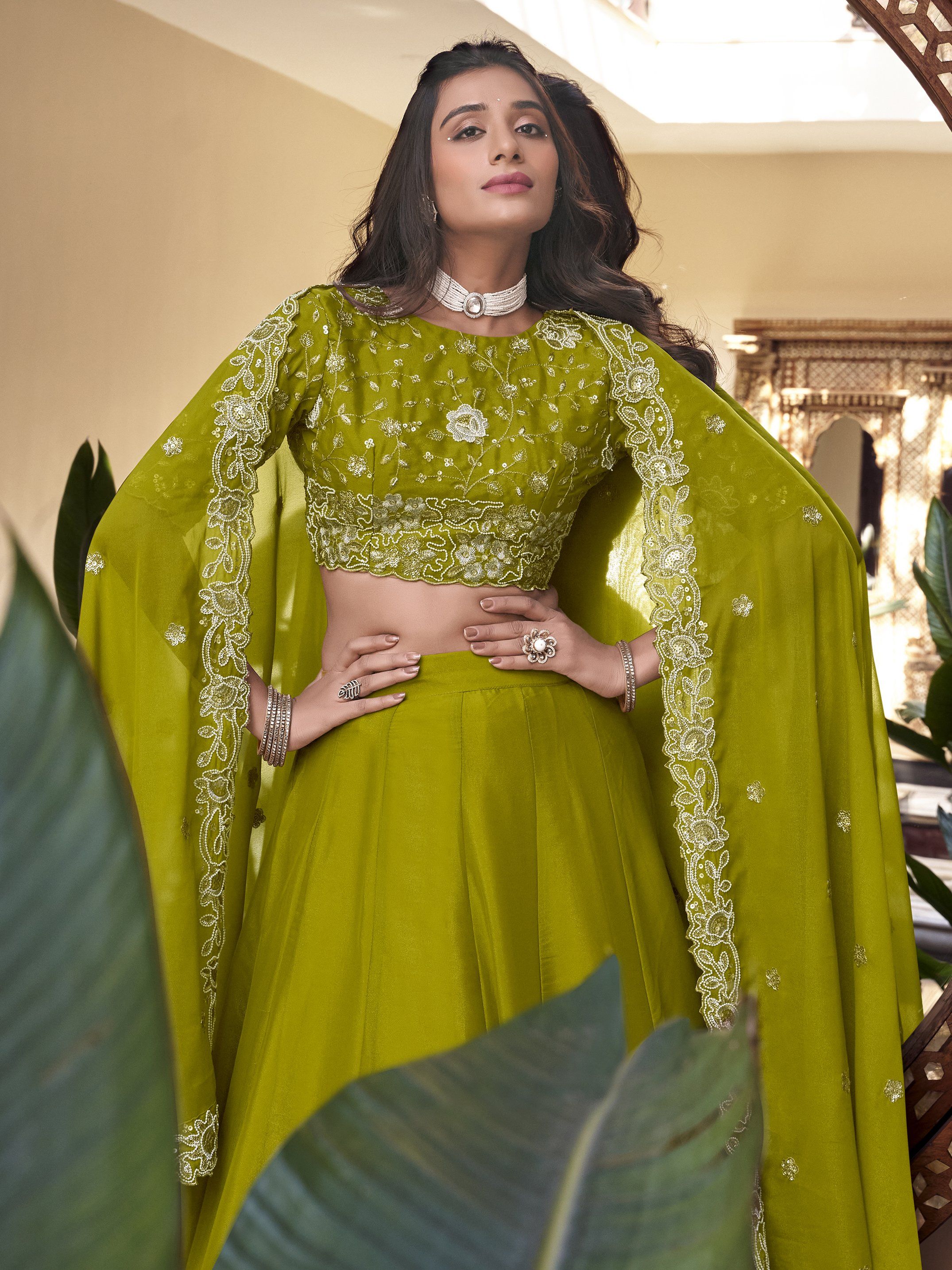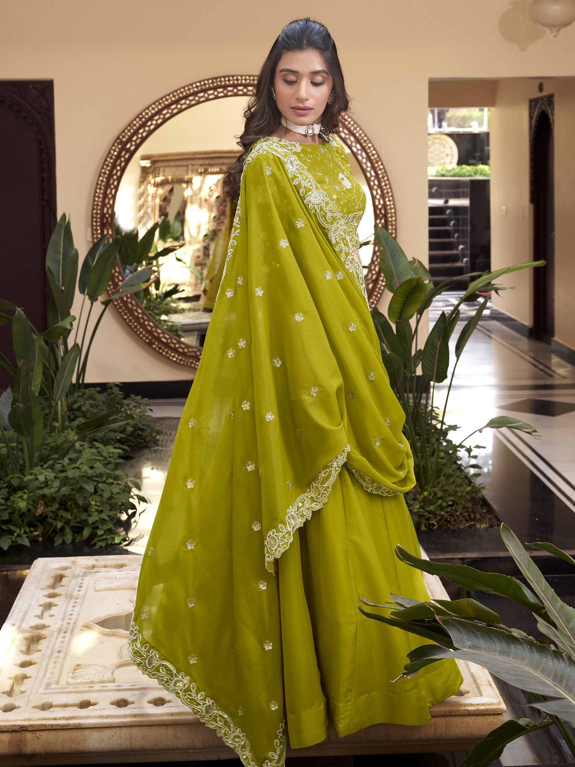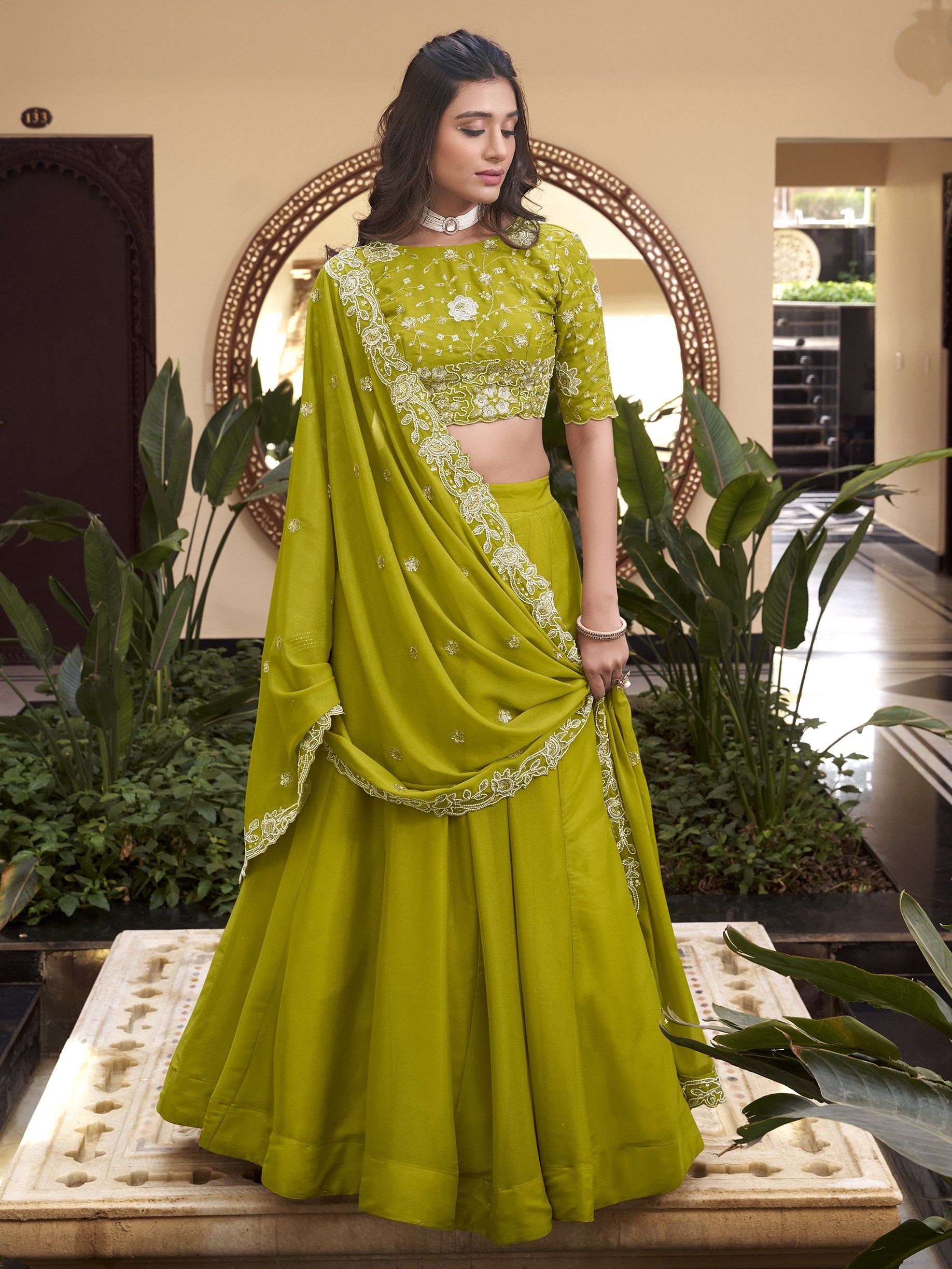 Elevate your festive wardrobe with the Green Star Georgette Lehenga Choli, featuring intricate pearl coding and sequins embroidery. Crafted from lightweight georgette, this ensemble offers graceful drape and comfort. The detailed embellishments add a sophisticated shimmer, perfect for weddings and special occasions. Designed to blend traditional artistry with contemporary style, this lehenga choli ensures you stand out with elegance and poise.