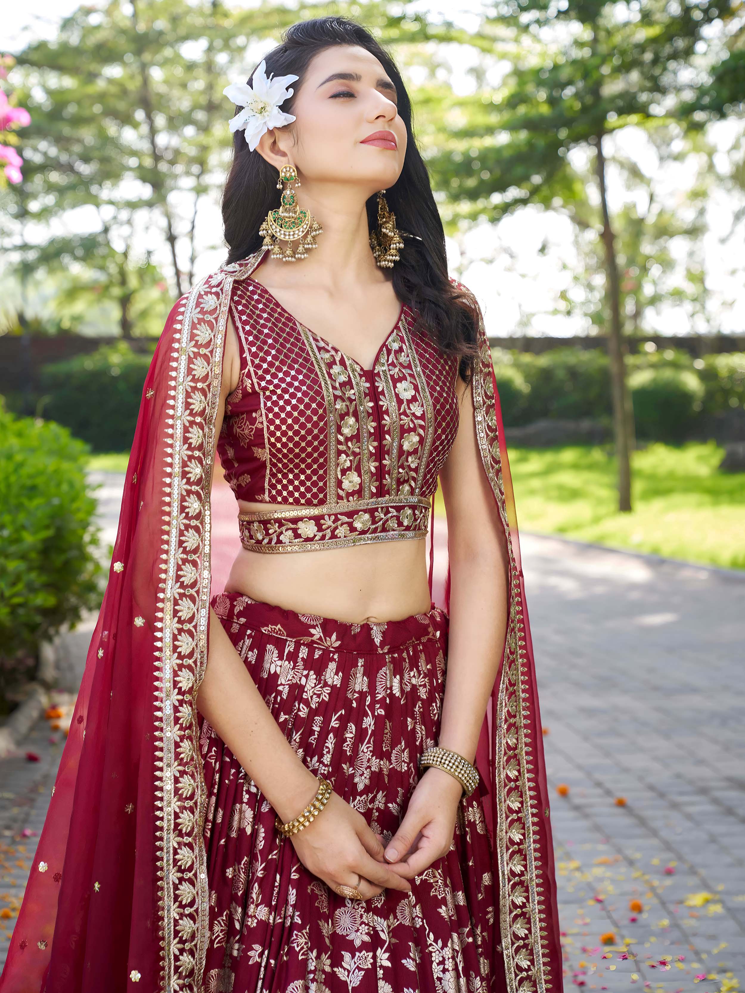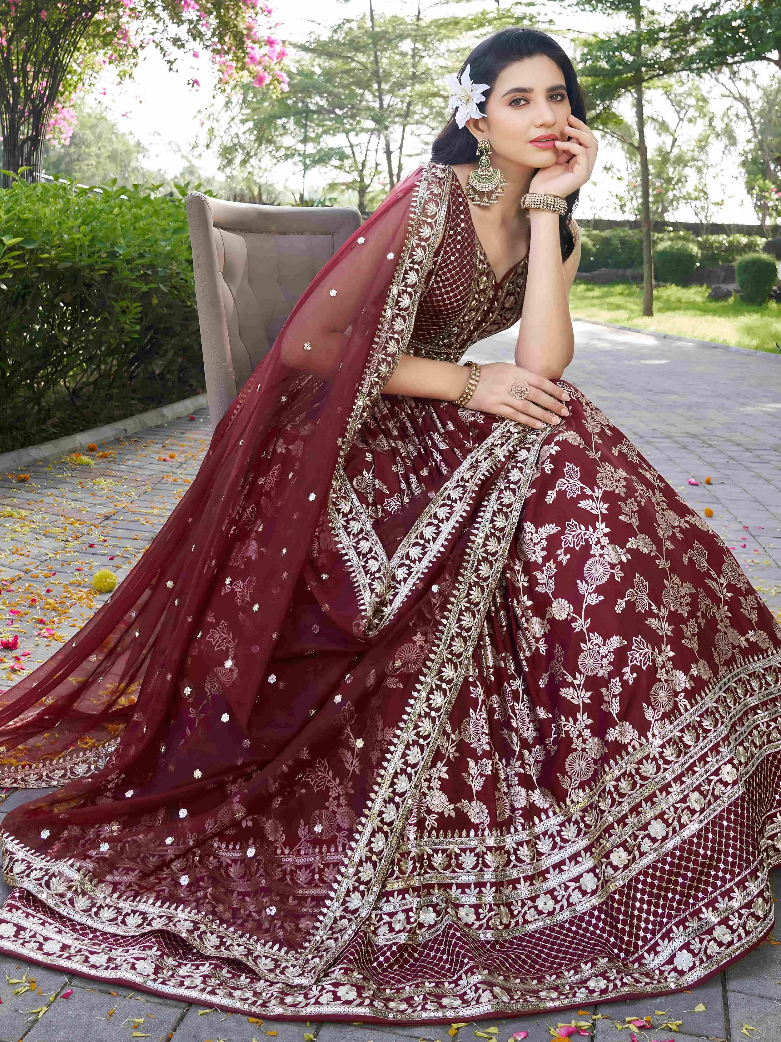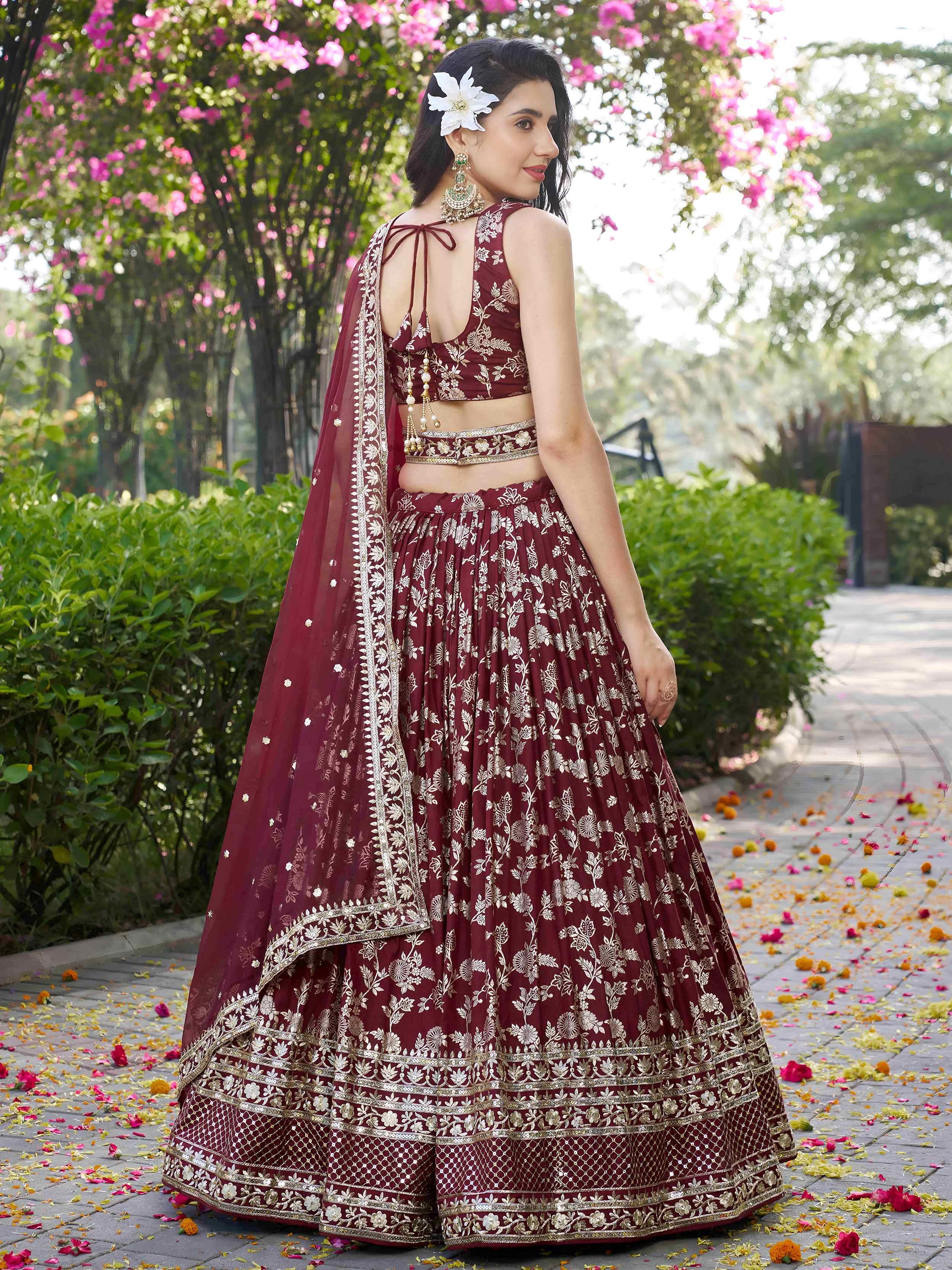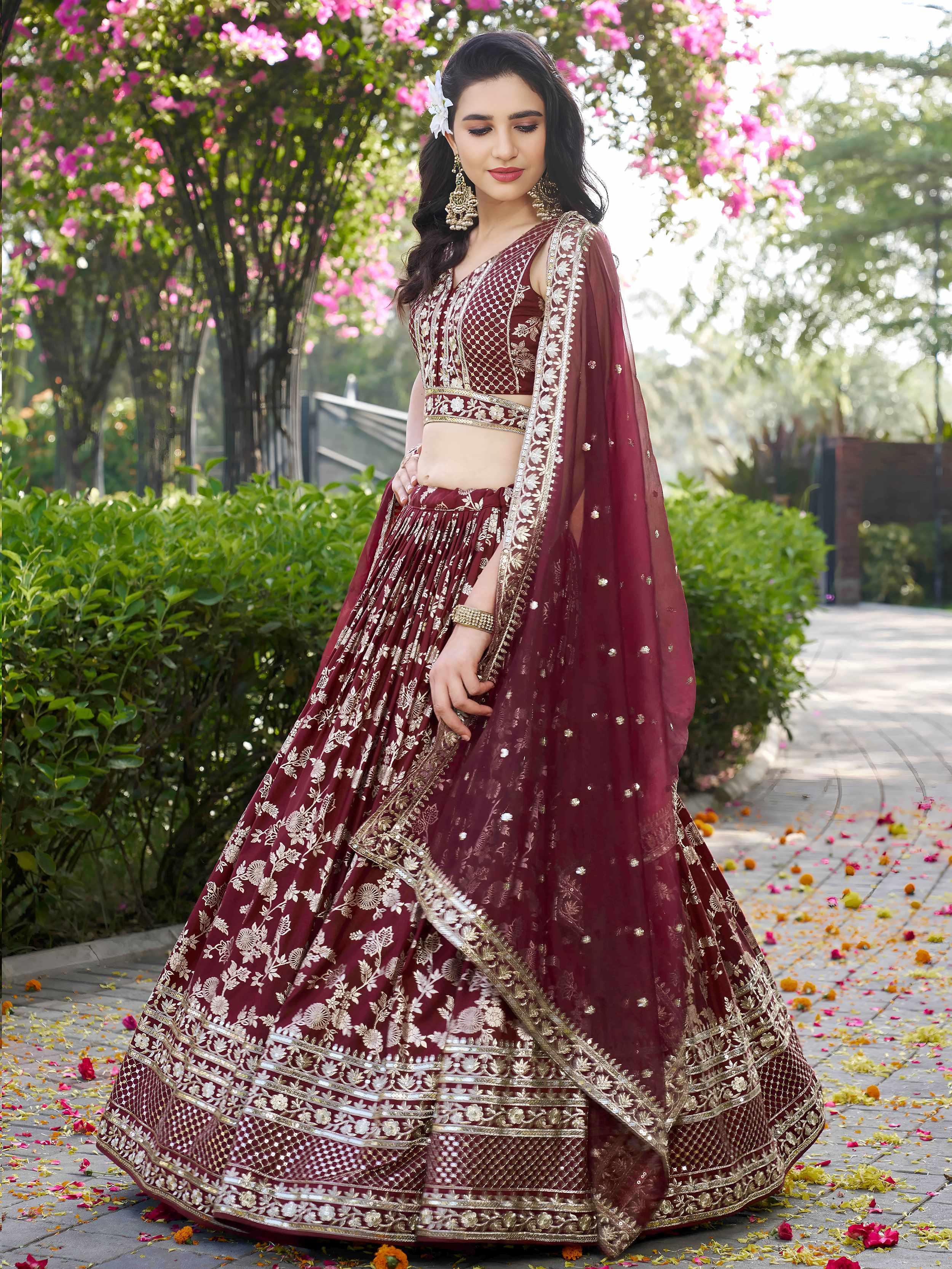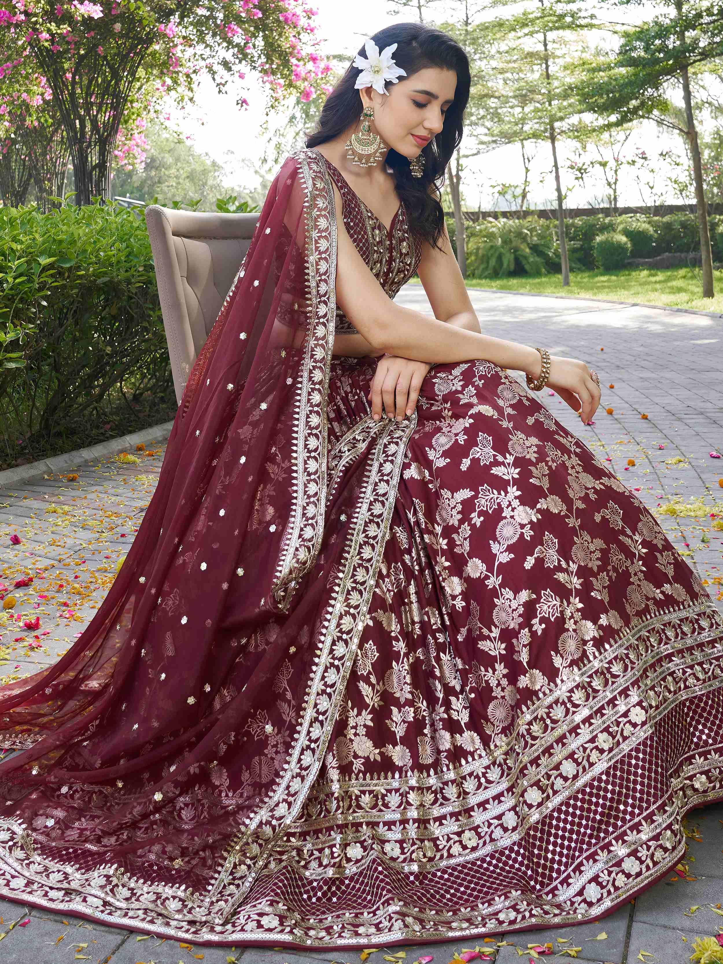 Maroon Dola Silk Jacquard Embroidered Lehenga Choli with Dupatta
