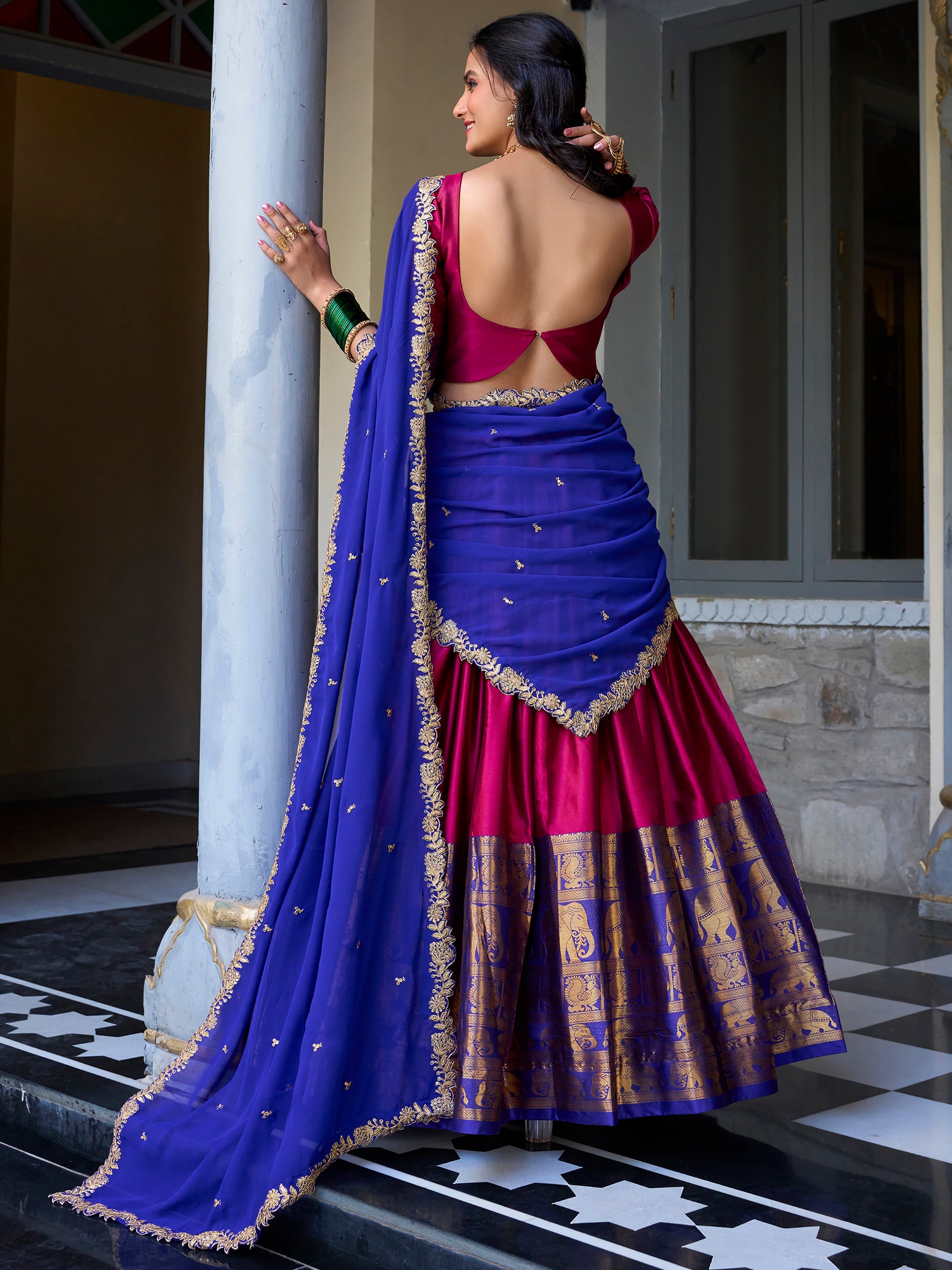Embrace the timeless elegance of South Indian tradition with this stunning Pink Narayan Pattu Silk Lehenga Choli Set. Expertly crafted with rich Zari Weaving Work, the lehenga radiates cultural grace, making it perfect for traditional weddings, festive rituals, or temple ceremonies.