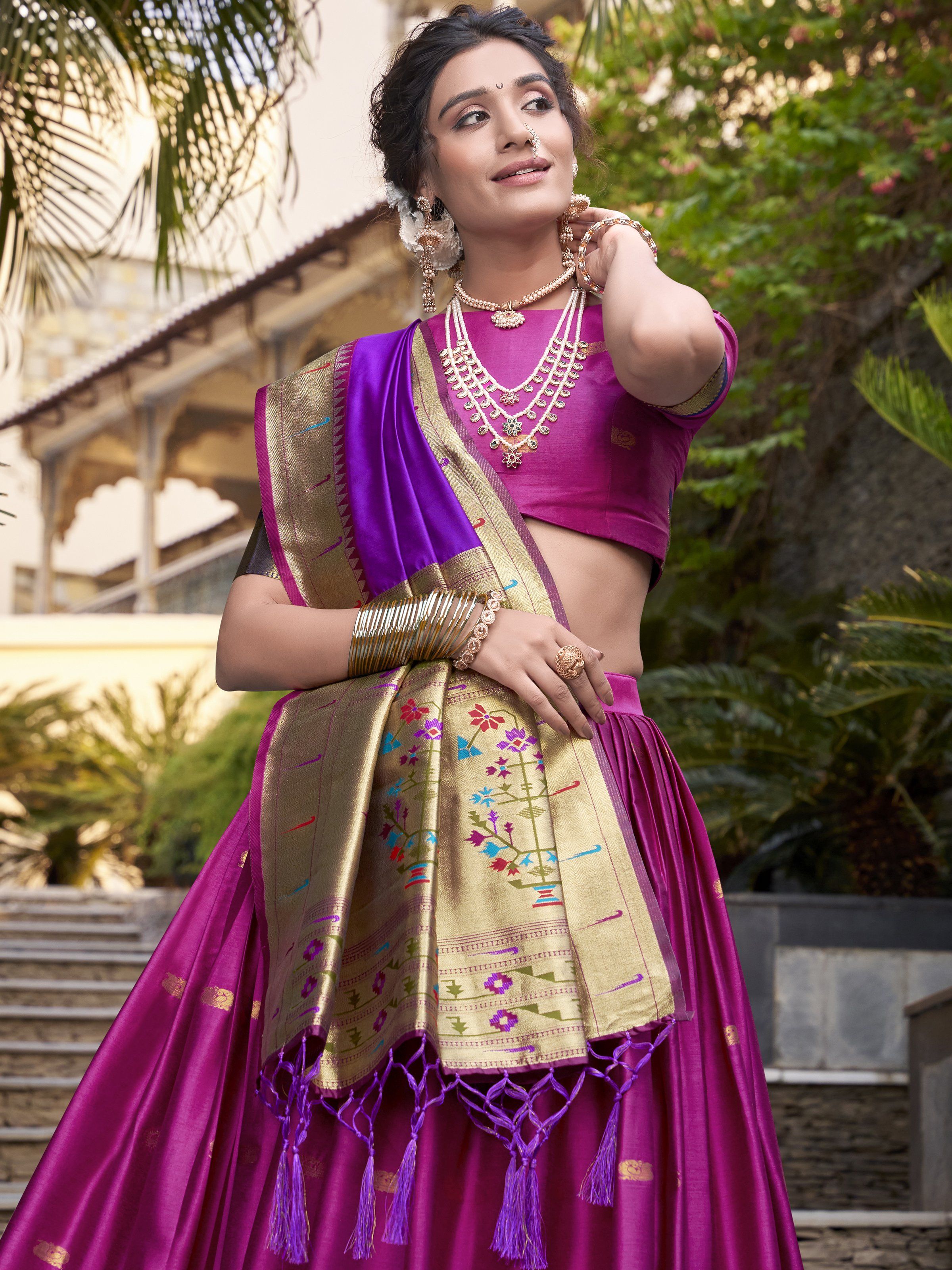 Embrace the elegance of timeless craftsmanship with this majestic pink lehenga choli set. Woven in Paithani-style Jacquard Silk and enriched with luxurious zari weaving, this ensemble blends royal tradition with contemporary flair – a perfect outfit for weddings, festivals, or cultural events.
