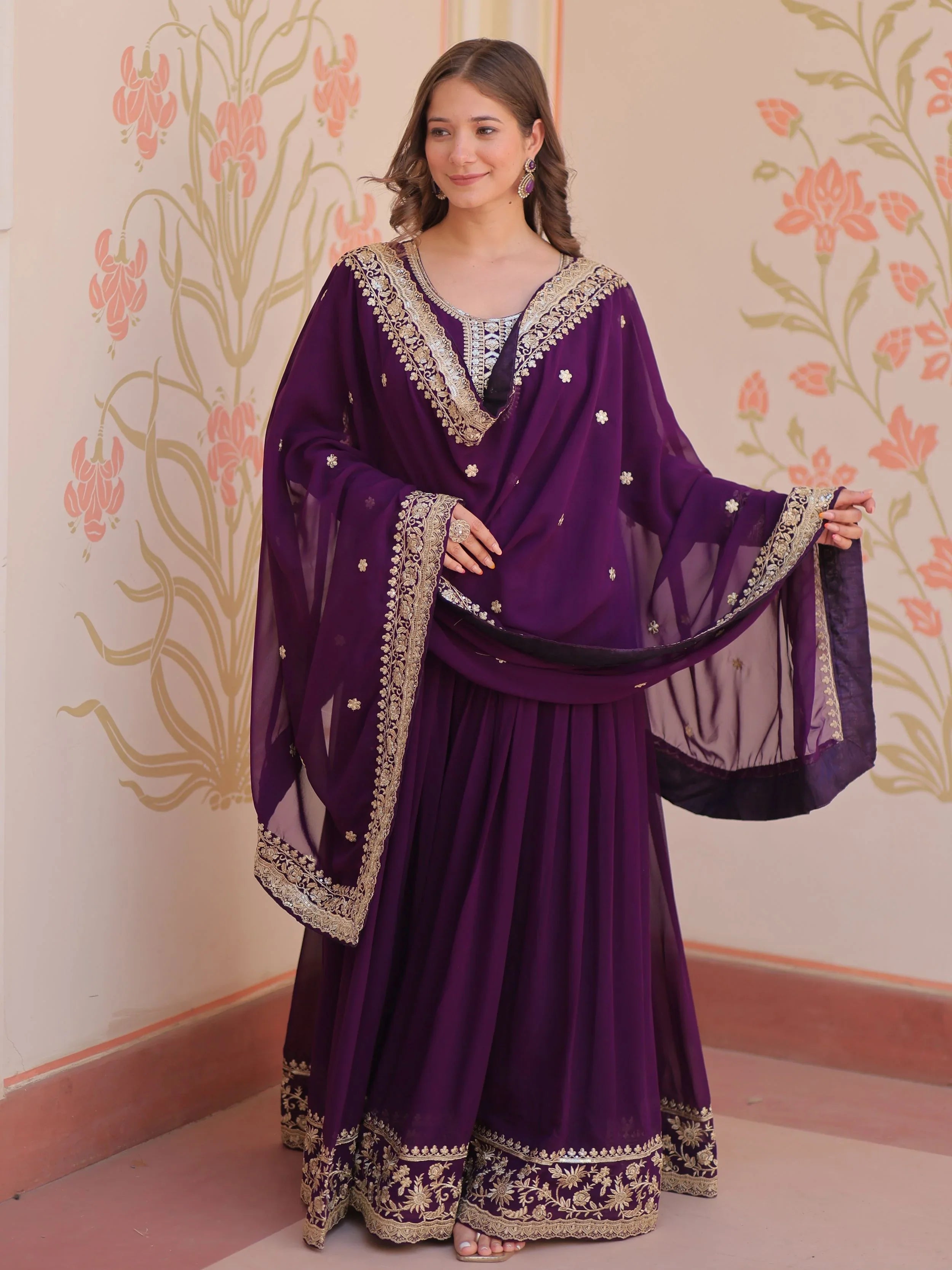 Crafted for the modern-day Sundar Naari, this elegant Designer Gown Set is a luxurious ensemble featuring rich Zari and Sequins embroidery on flowy Faux Blooming Georgette. Perfect for festive occasions, weddings, and evening parties, this ready-to-wear gown combines grandeur with grace.