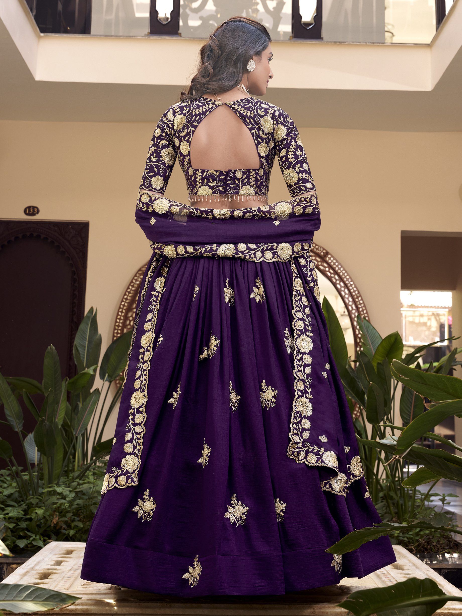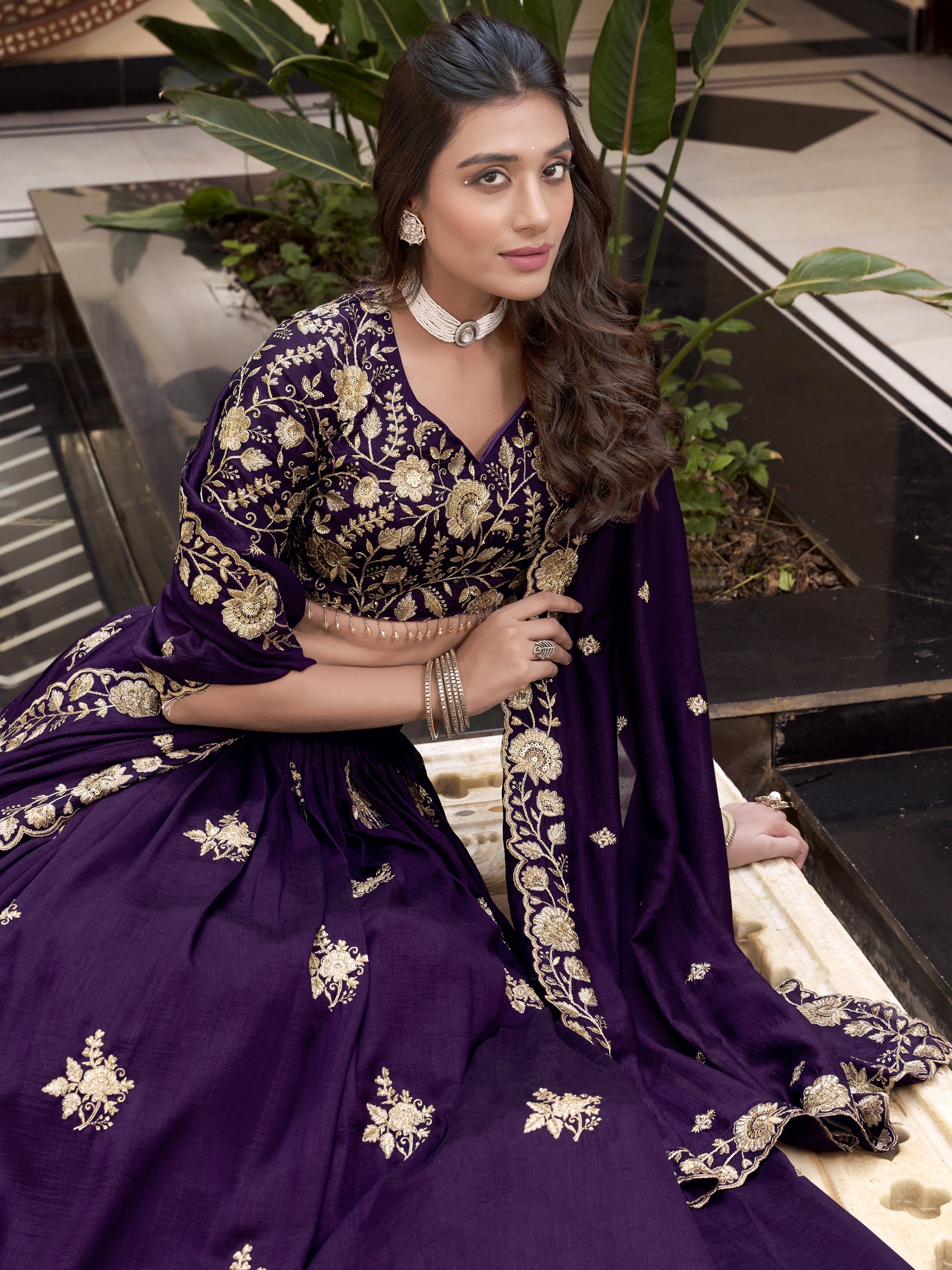 Step into regal elegance with this Purple Vichitra Silk Lehenga Choli, intricately adorned with pearl coding and sequins embroidery work. A graceful silhouette combined with exquisite craftsmanship makes this ensemble perfect for weddings, receptions, and festive occasions. The soft vichitra silk, stitched with canvas and cancan for a grand flare, brings together tradition and contemporary charm.