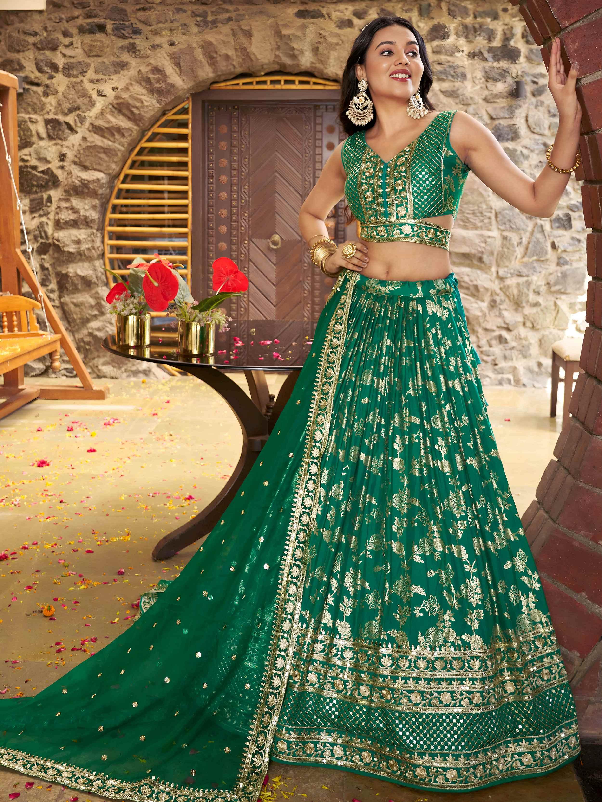 Command attention at every celebration with this Dola Silk Jacquard Lehenga Choli Set, intricately embroidered with Zari and Sequin Work. Paired with a delicate Organza Sequins Dupatta, this ensemble reflects timeless elegance—perfect for festive occasions, weddings, receptions, and grand cultural events.