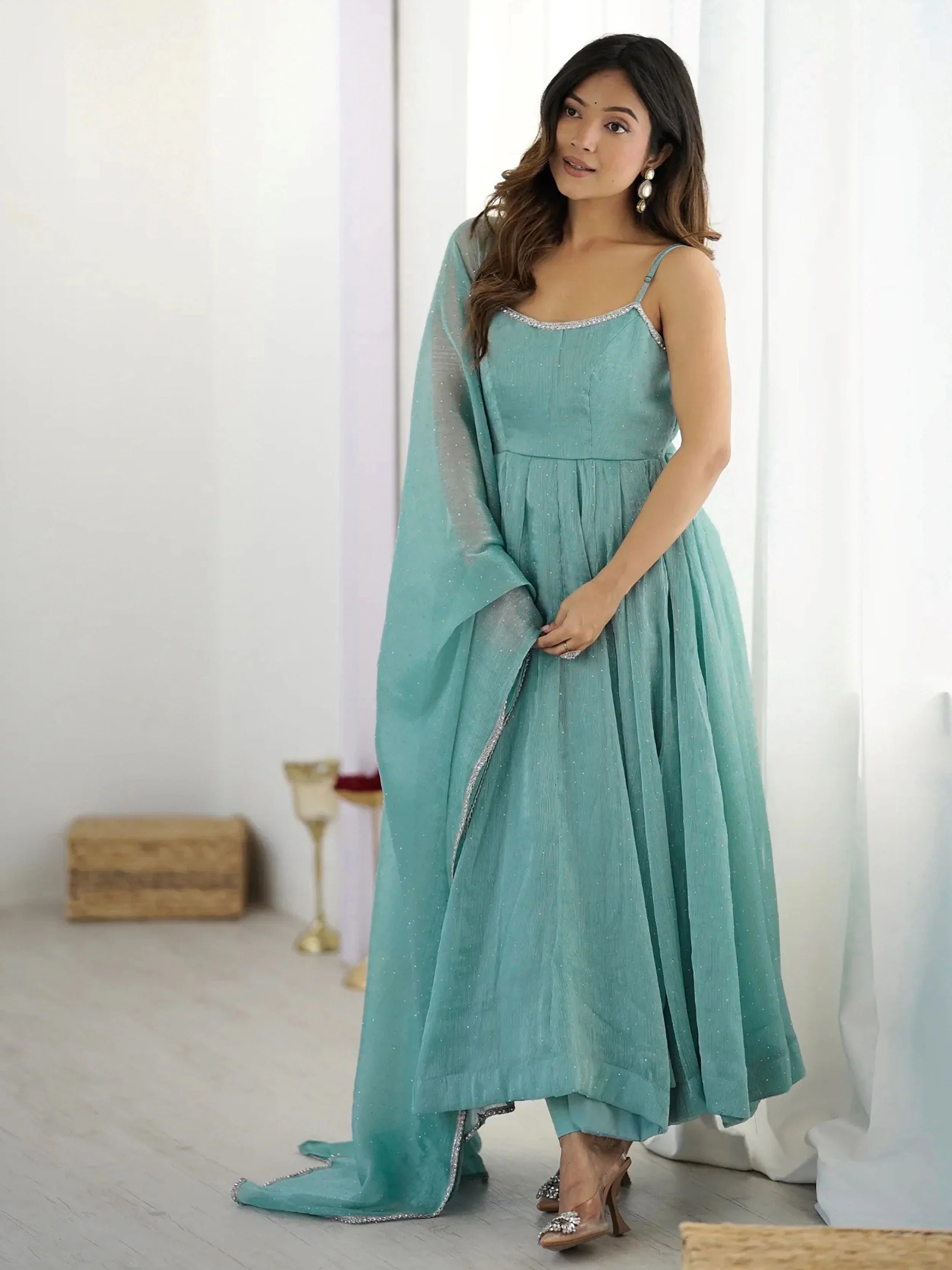Step into elegance with this Sky Blue Crunchy Silk Anarkali Suit, designed to bring grace and grandeur to every festive moment. Embellished with shimmering Sirozski embroidery, and paired with a statement flair and a luxe dupatta, this ensemble is perfect for weddings, parties, and cultural celebrations. Experience beauty, comfort, and timeless tradition – all in one look.