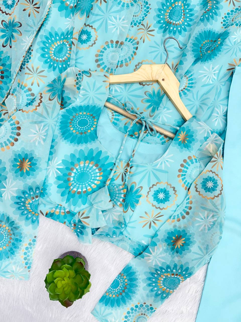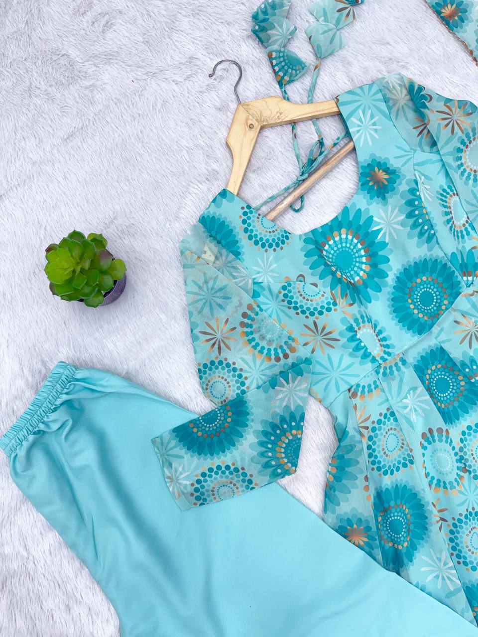 Elevate your ethnic style with this Sky Blue Floral Gown Set, crafted in Pure Soft Heavy Fox Georgette with micro cotton inner lining. Styled with a 4+ meter kali-cut flair, paired with cotton pants and a lightweight organza dupatta with lace border, this outfit is perfect for weddings, receptions, parties, and festive wear.