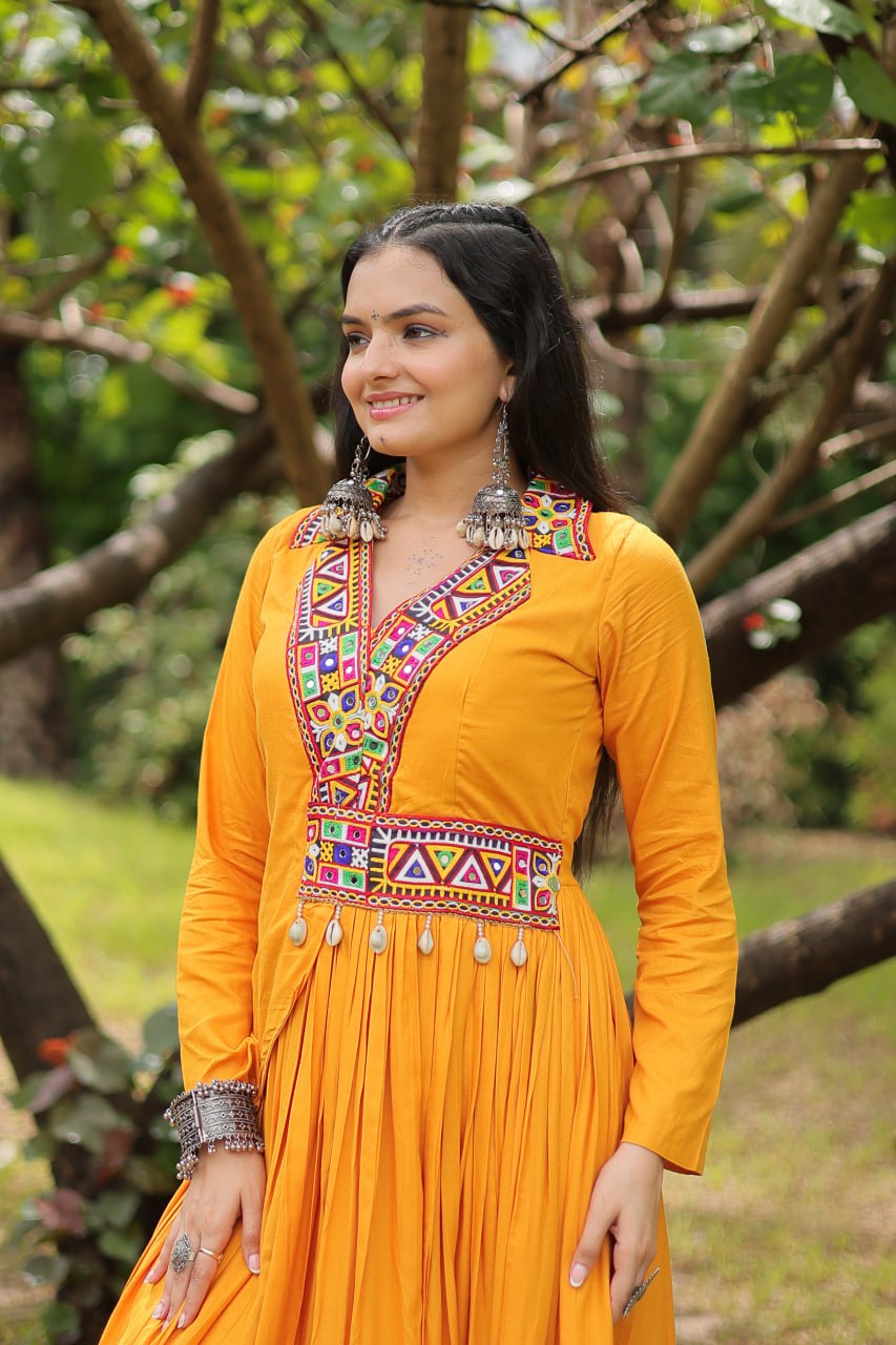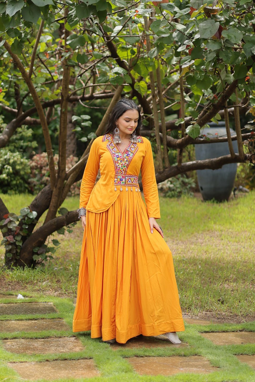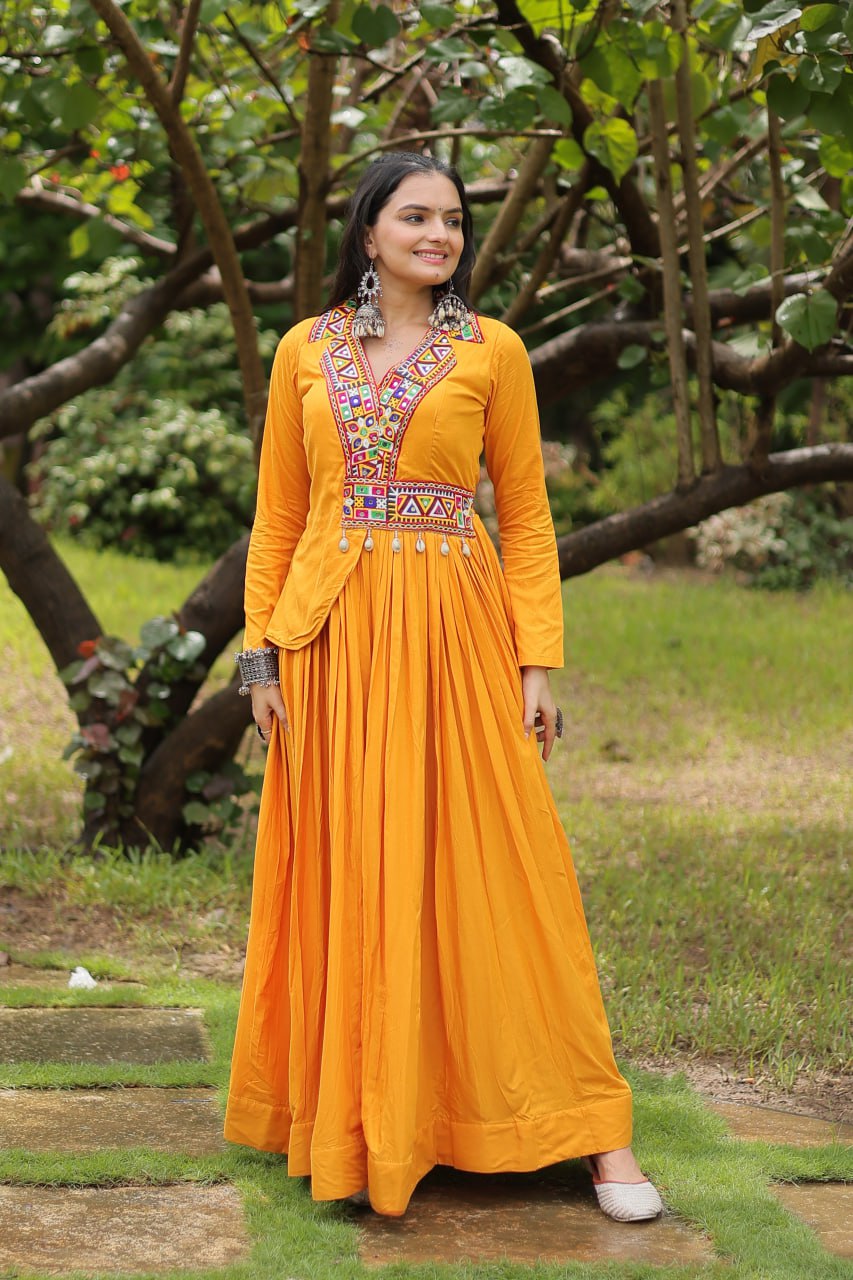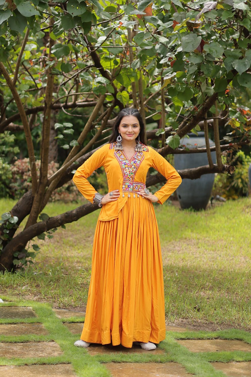 Experience the essence of traditional Kutchi Gamthi work with our Misty Yellow Rayon Navratri Gown. Made from high-quality rayon, this gown is perfect for celebrating the festive season with style and comfort. The intricate work and vibrant color make it a must-have for any special occasion.