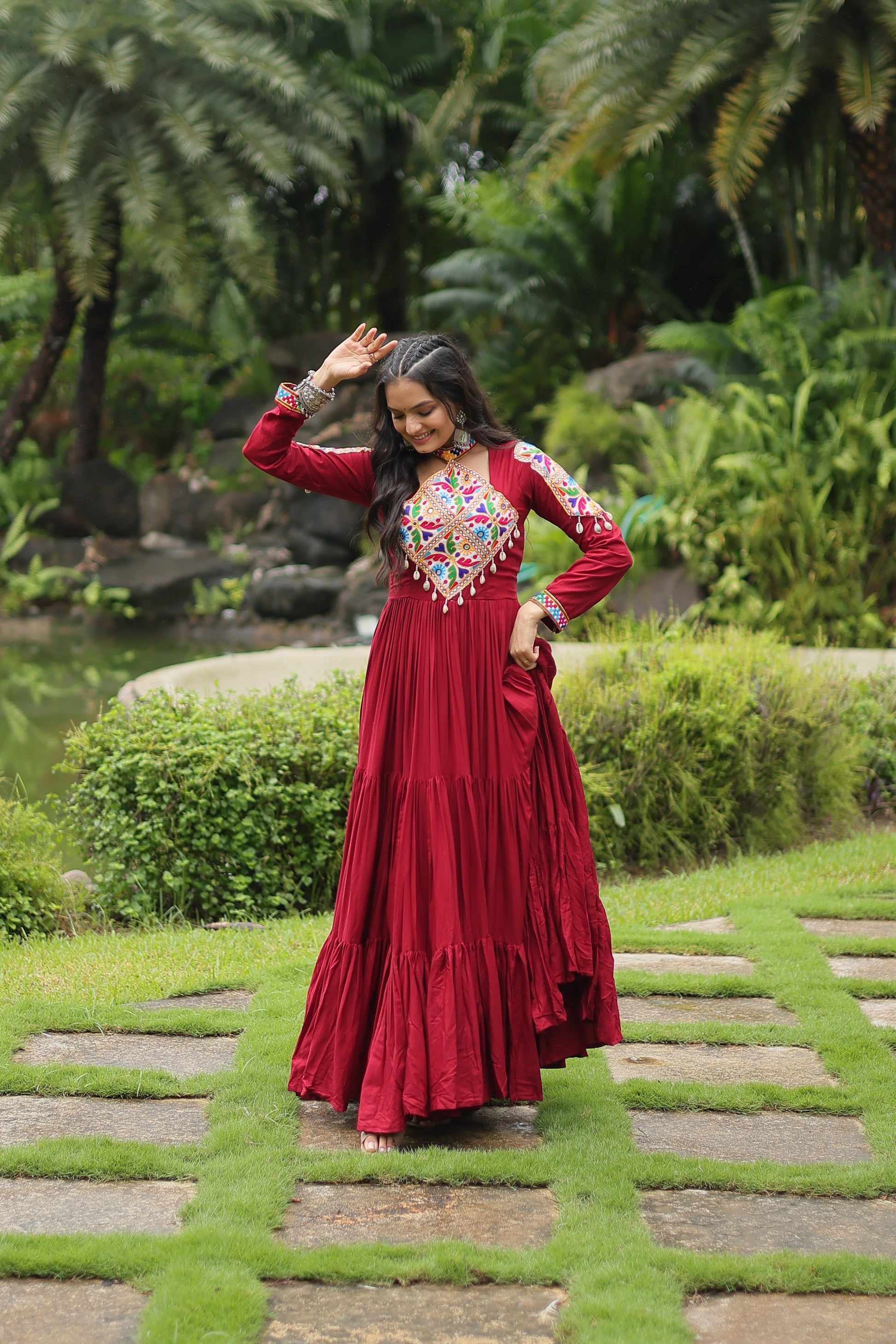 Aditri Maroon Pure Rayon Kutchi Gamthi Anarkali Gown