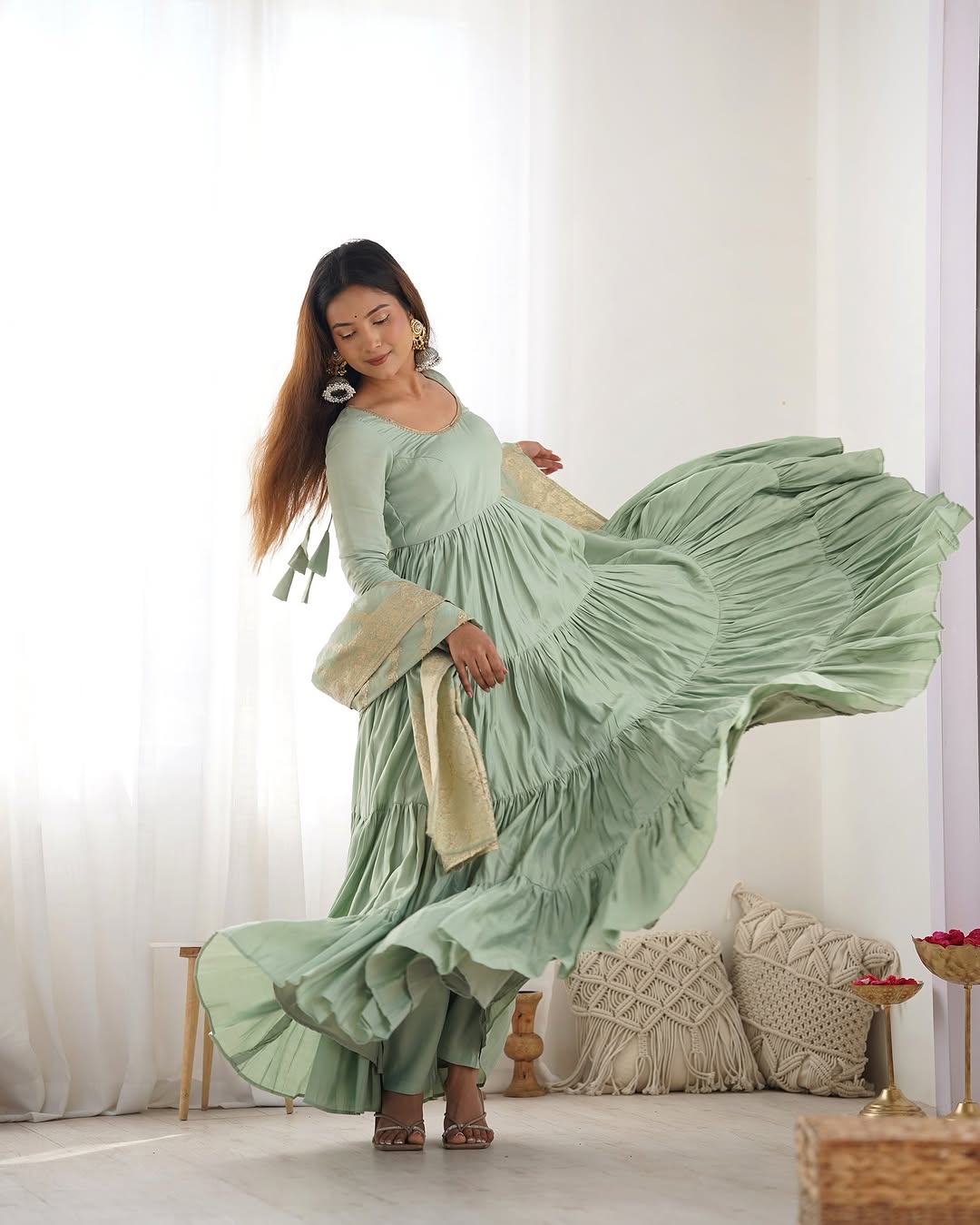 Elevate your style with our Ashika Pista Roman Silk Flared Anarkali Gown Set! Crafted from high-quality silk, this set features a flared anarkali gown that will make you feel like a regal goddess. Perfect for special occasions or a bold fashion statement. Take a risk and make a statement with Trinaari!
