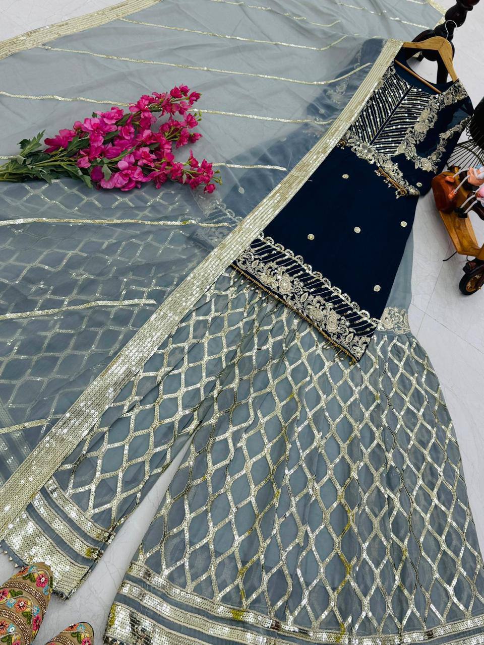Make a lasting impression with this Designer Top Palazzo Dupatta Set, featuring heavy coding embroidery with sequins work. Crafted in Faux Georgette fabric, this outfit blends rich tradition with contemporary elegance—perfect for Diwali parties, weddings, receptions, and festive celebrations.