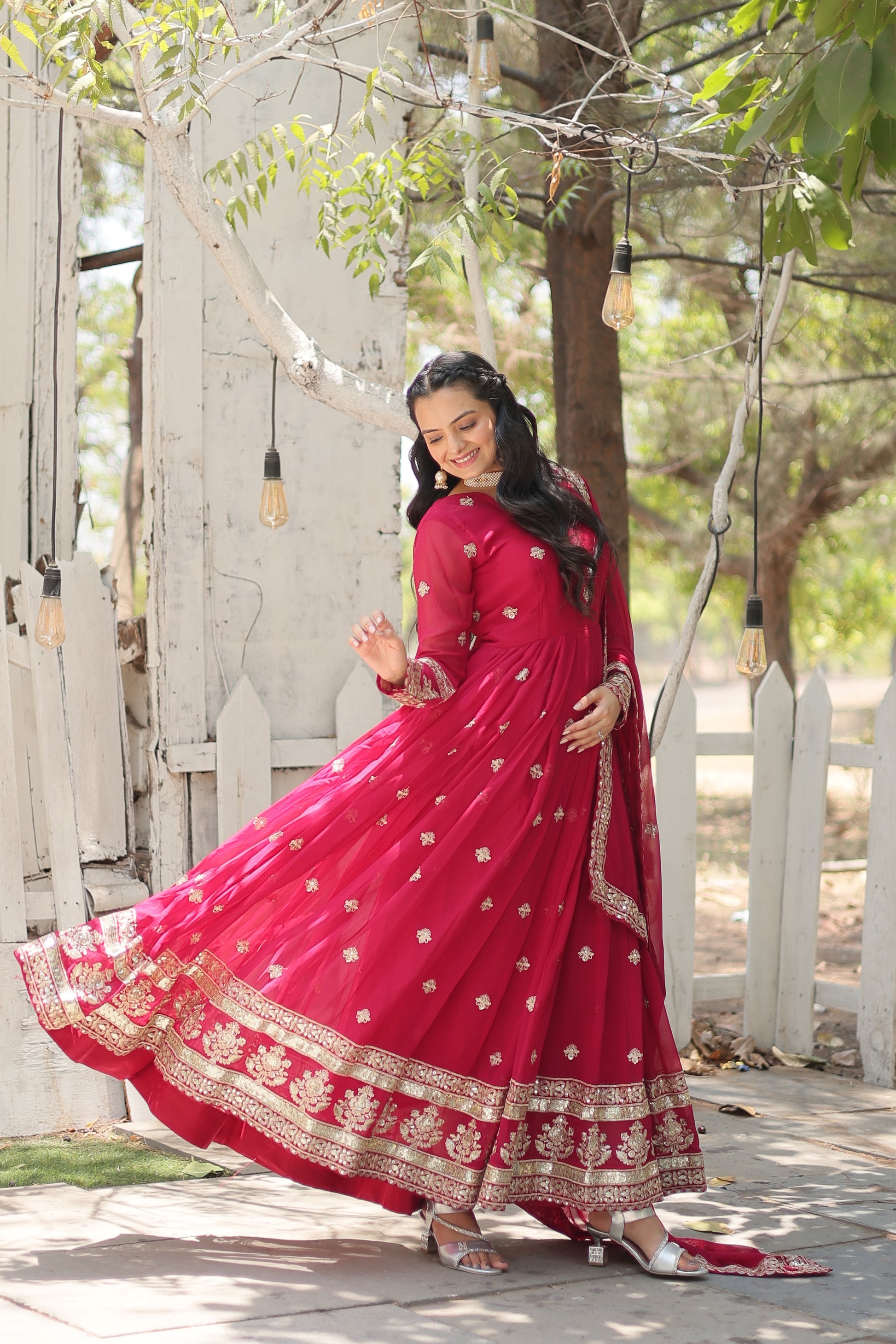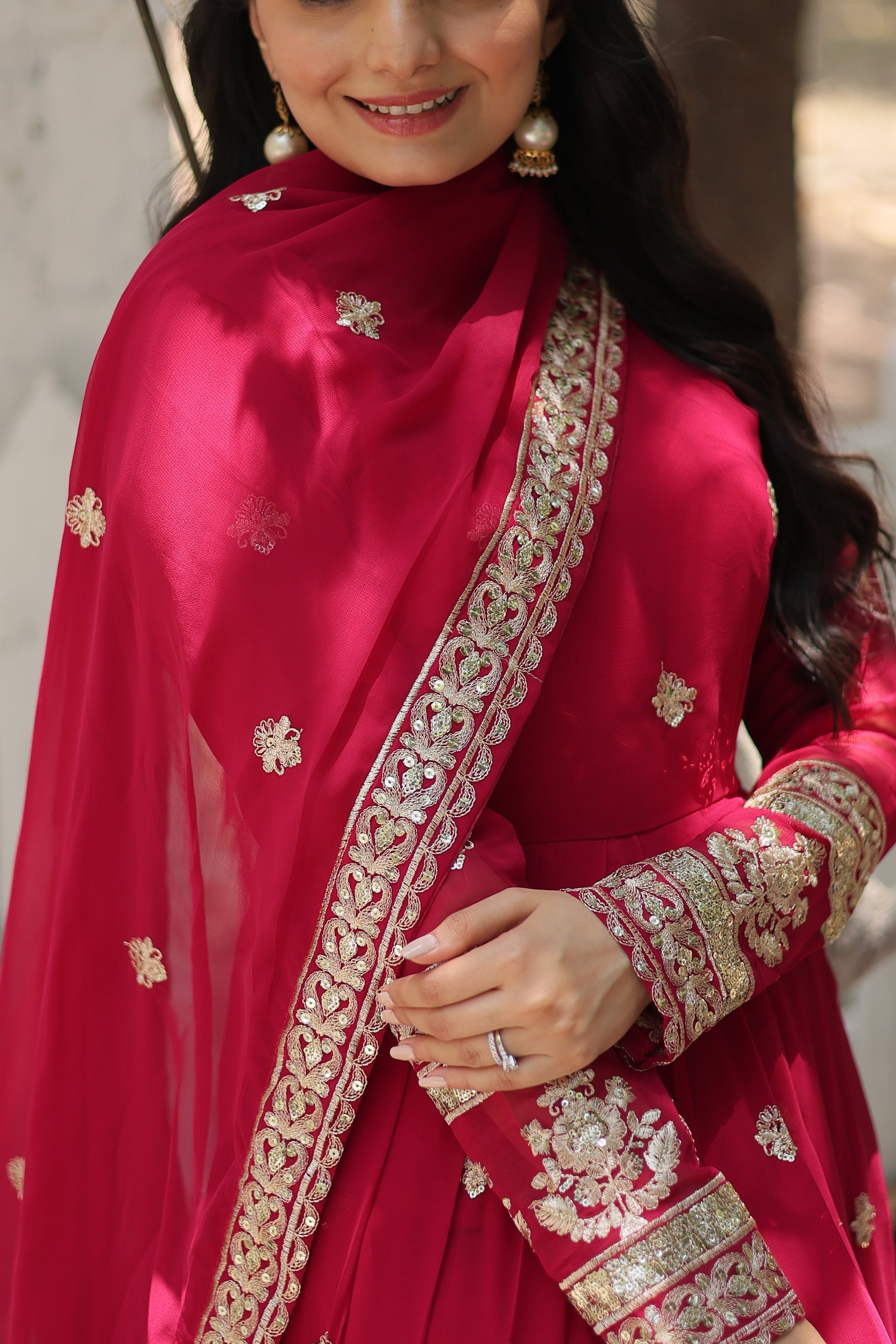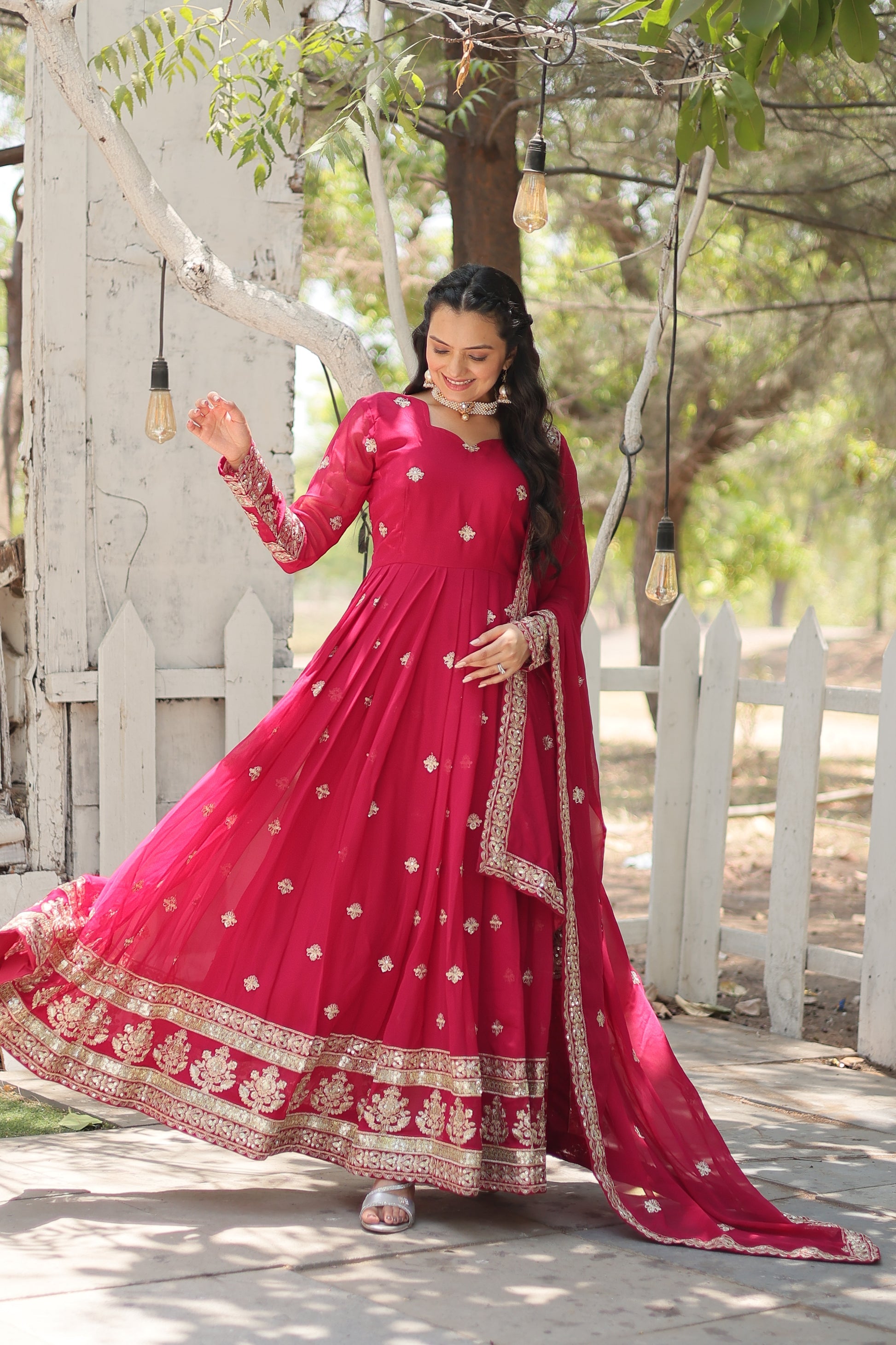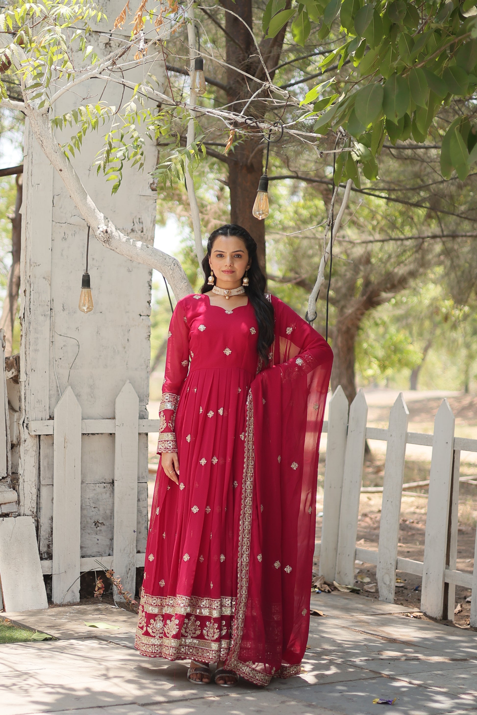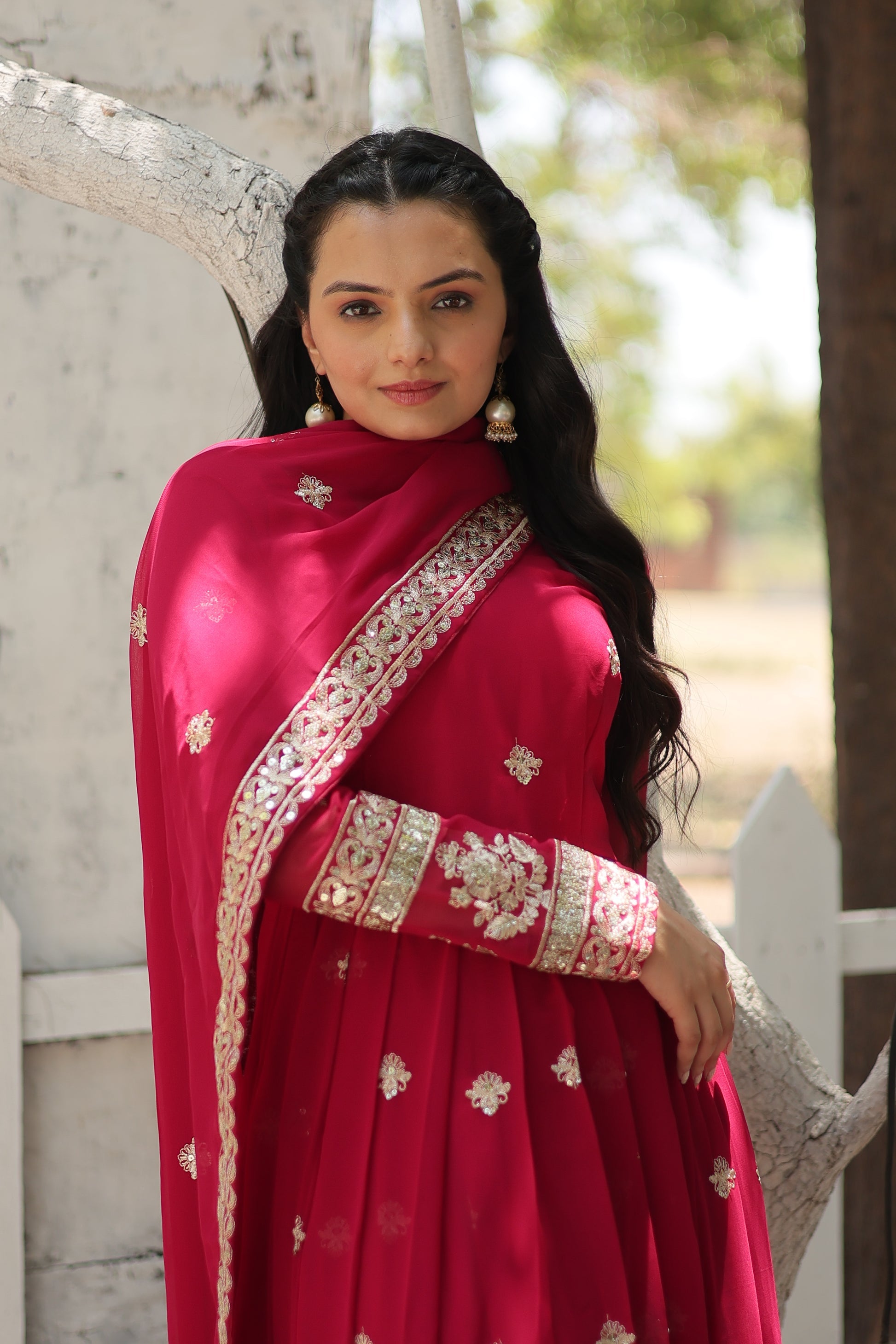 Expertly crafted with intricate pink embroidery, the Charvi Flared Anarkali Gown Set exudes elegance and grace. Made of high-quality materials, this gown set offers a flattering fit and comfortable wear. Perfect for special occasions, it will make you stand out from the crowd with its exquisite design and beautiful flared silhouette.