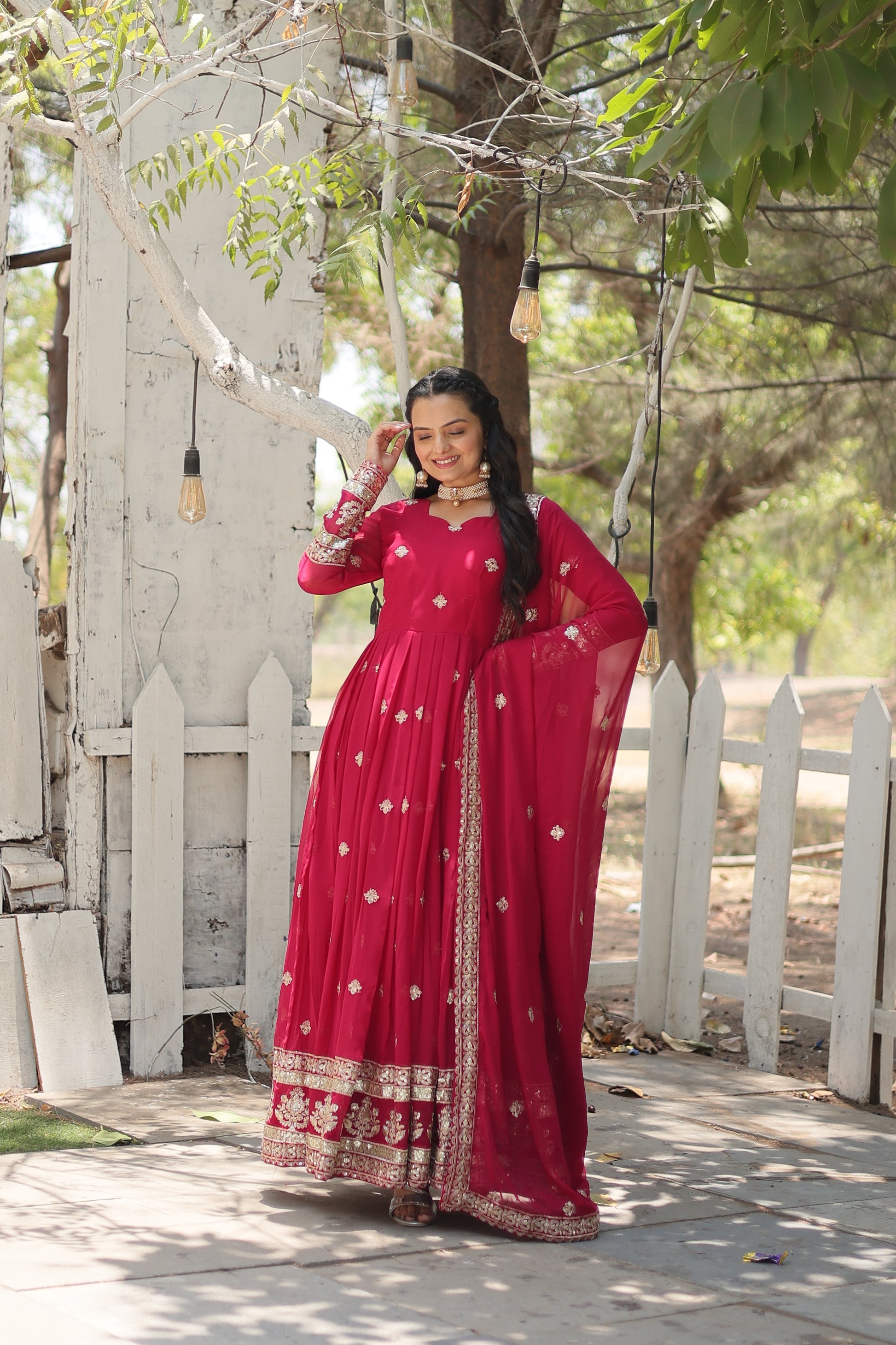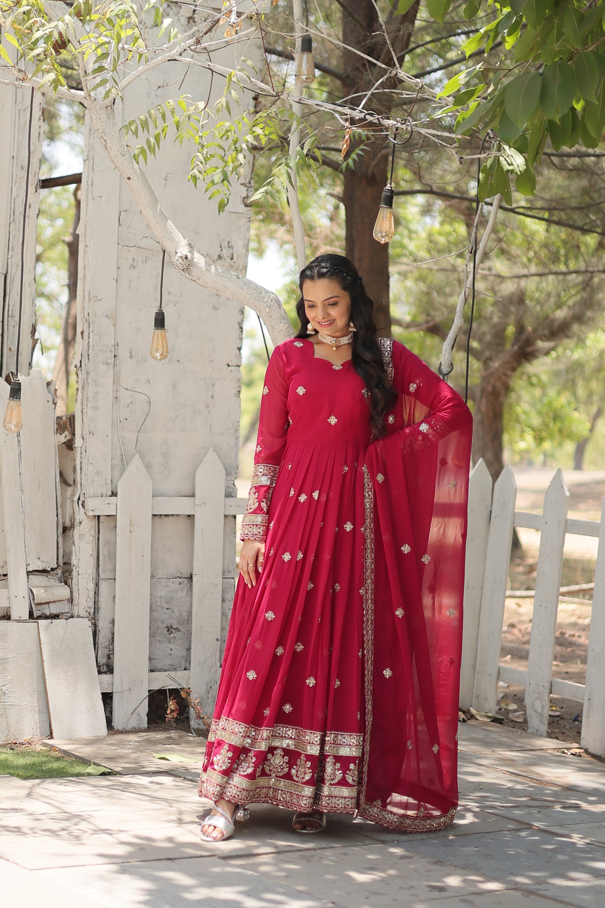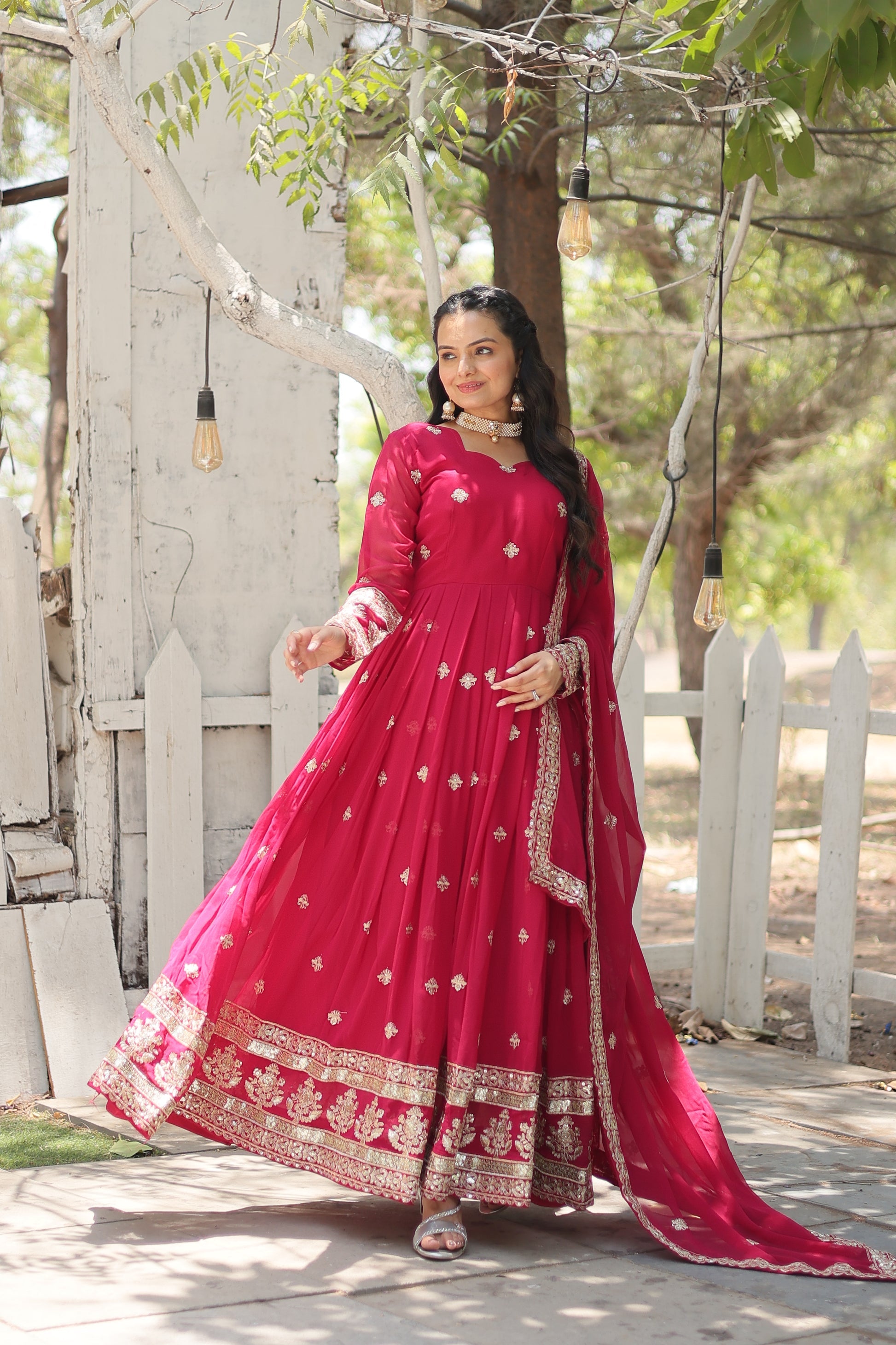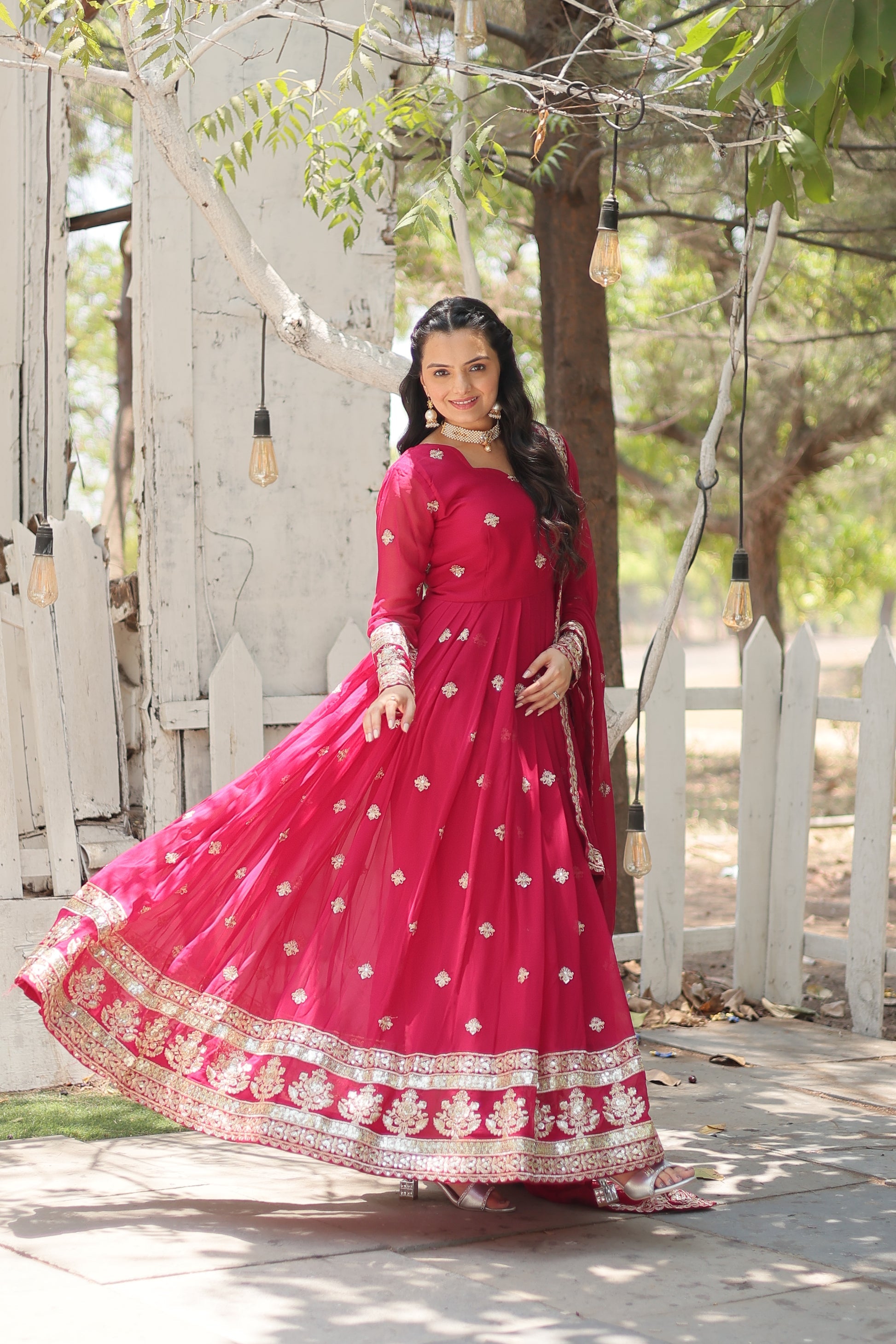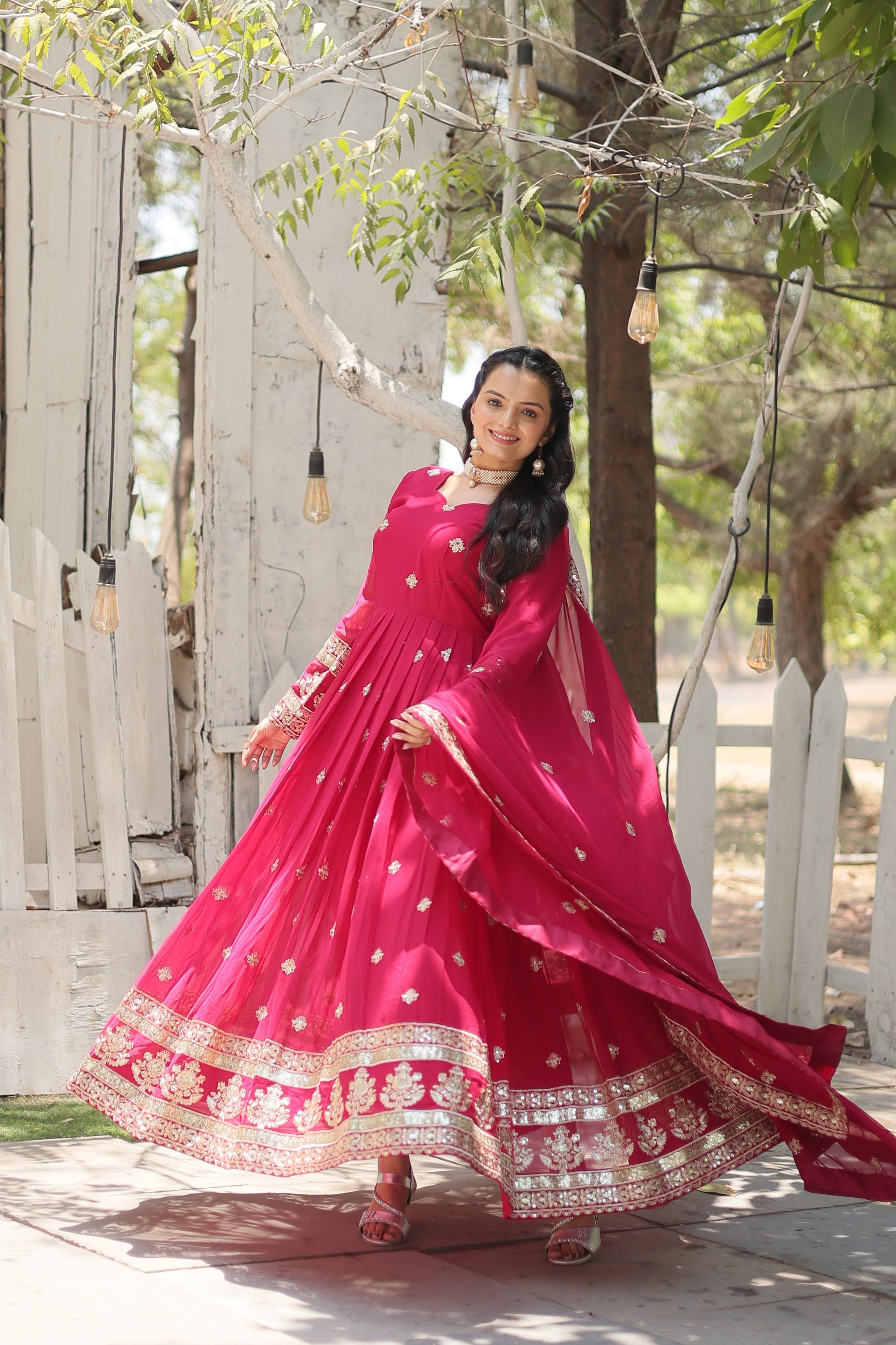Expertly crafted with intricate pink embroidery, the Charvi Flared Anarkali Gown Set exudes elegance and grace. Made of high-quality materials, this gown set offers a flattering fit and comfortable wear. Perfect for special occasions, it will make you stand out from the crowd with its exquisite design and beautiful flared silhouette.