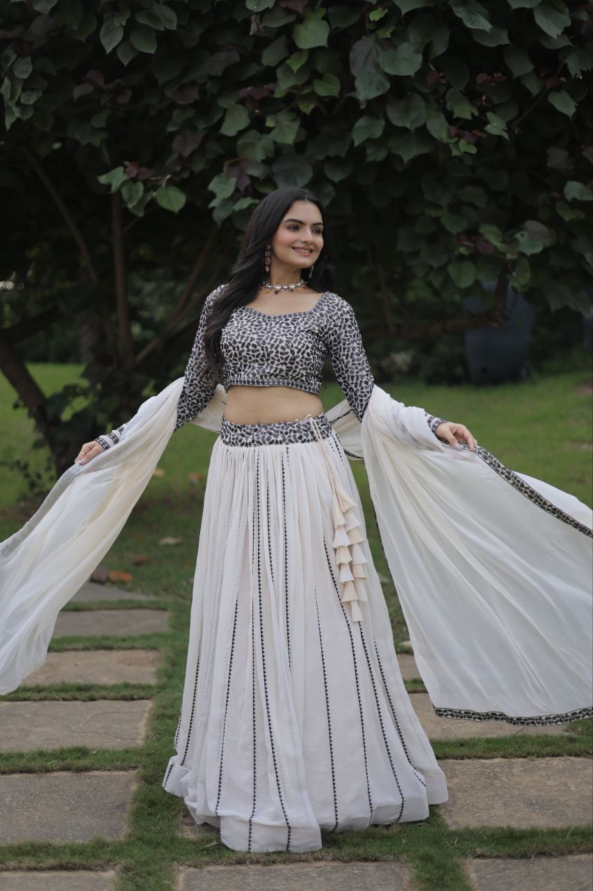Twirl and sparkle in this cream-colored georgette lehenga choli with delicate sequence work. Perfect for any party, it comes with a dupatta to complete the look. Be the center of attention with this designer piece.