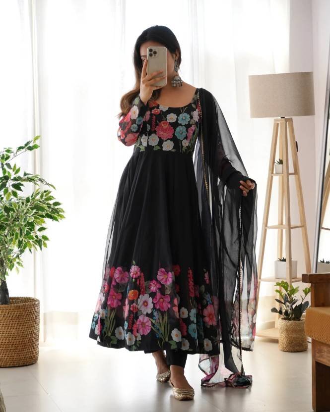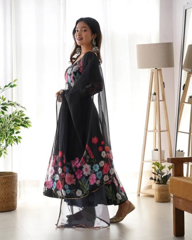 Expertly crafted with the finest quality organza fabric, the Darshika Black Anarkali Suit Set features a stunning floral print design. This traditional yet modern suit set is both sophisticated and comfortable, perfect for any occasion. Elevate your style with this elegant and timeless piece.