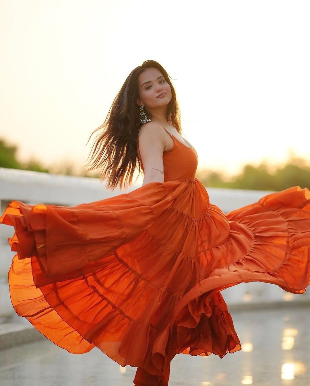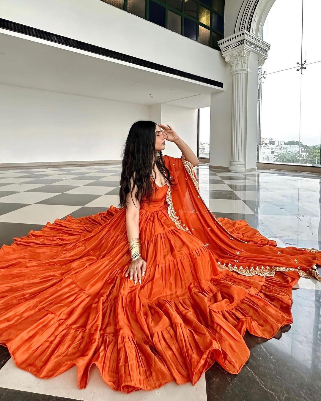 Embrace the thrill of the unknown with our Devayani Orange Georgette Anarkali Gown Set. Made with high-quality georgette fabric, this set exudes boldness and elegance. Perfect for those who love to take risks and stand out from the crowd. Upgrade your wardrobe and conquer the unpredictable with this stunning gown set!