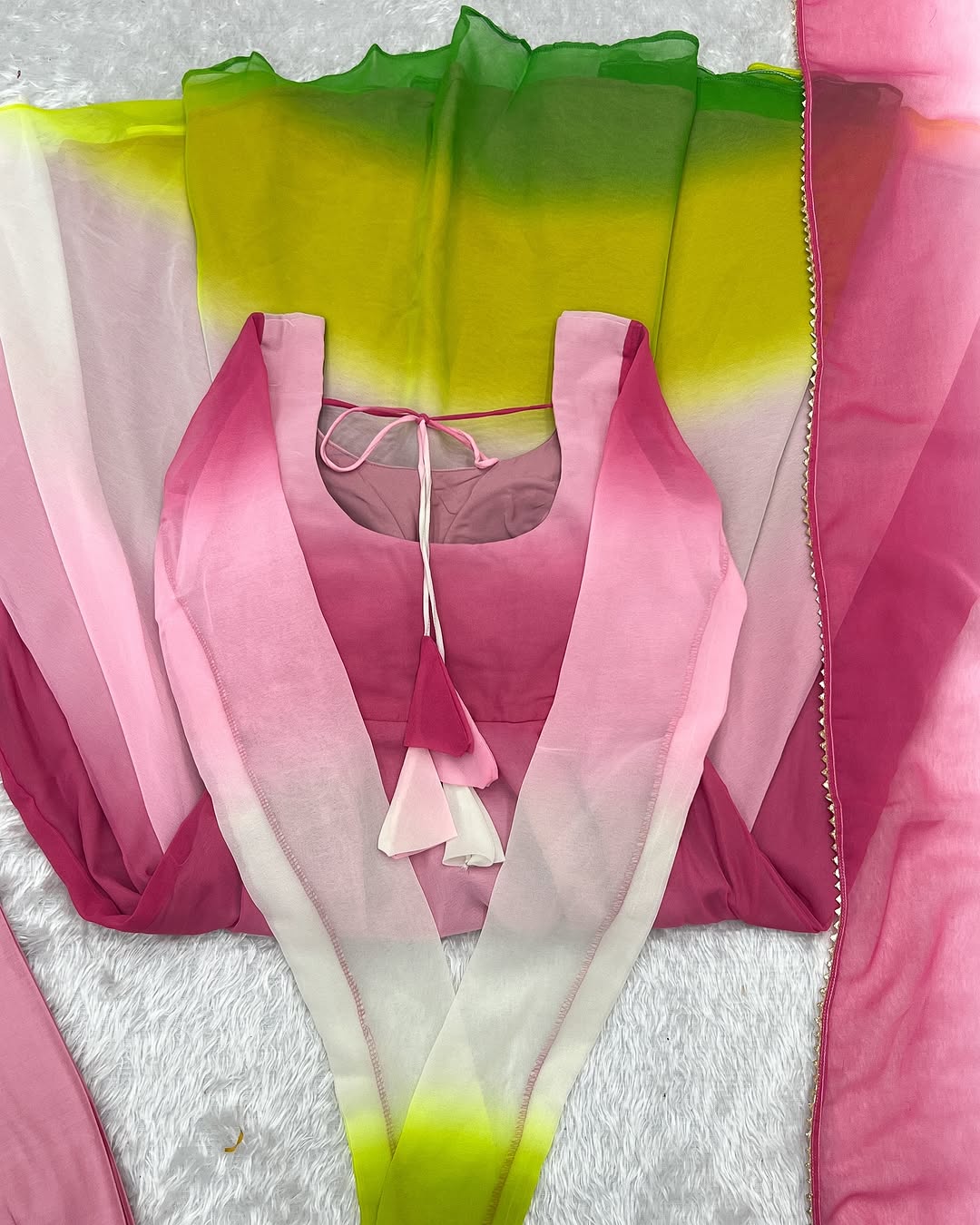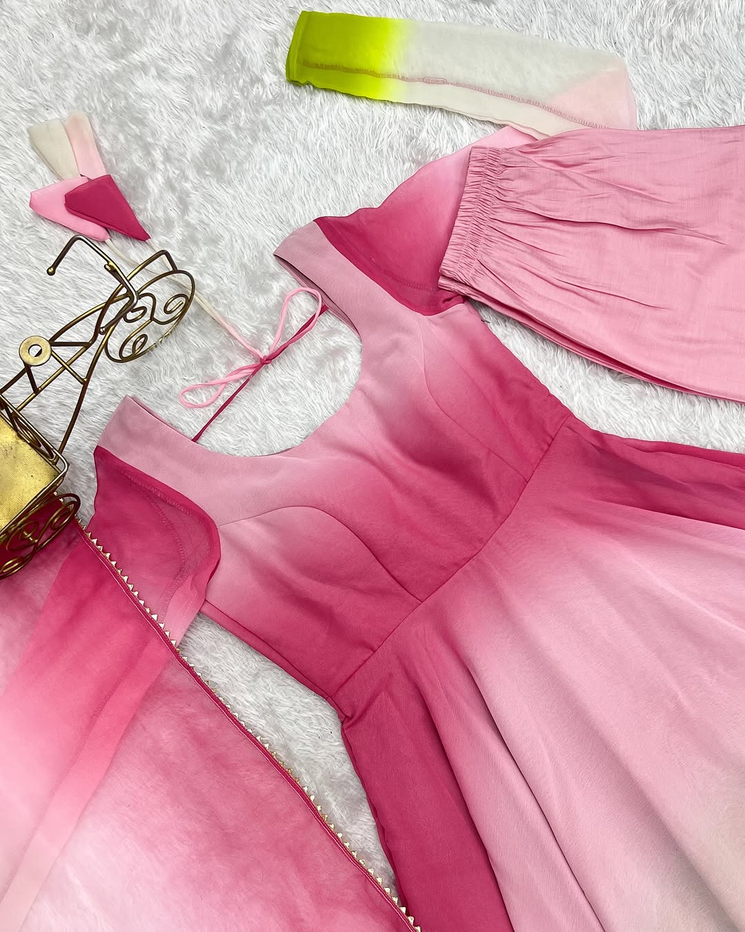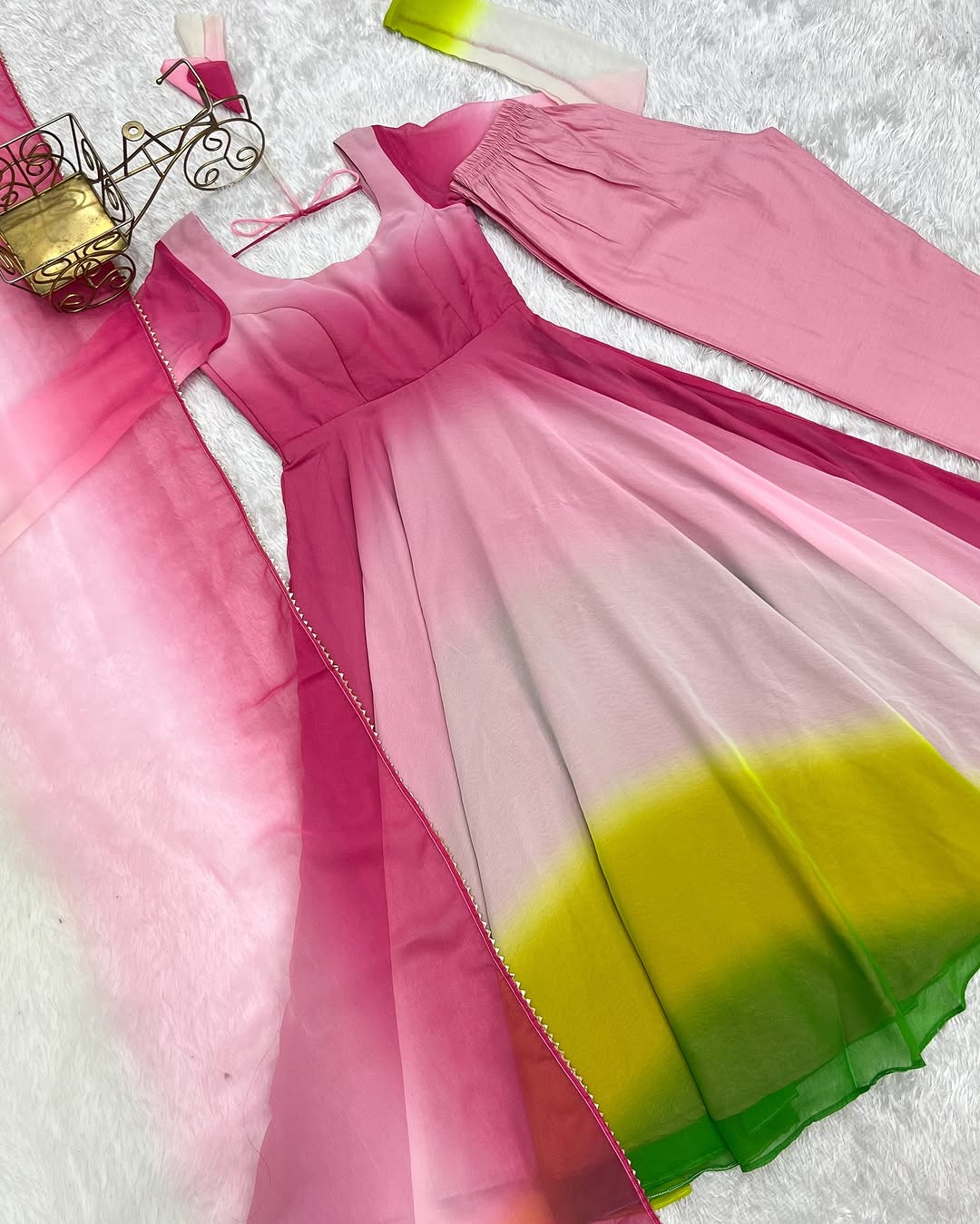 Introducing the Devika Multi Pink Flair Georgette Anarkali Gown Set, crafted with pure soft fox georgette to provide a luxurious feel. With a huge flair and included dupatta and pant, this set is perfect for any occasion. Elevate your style with this elegant and comfortable gown set.