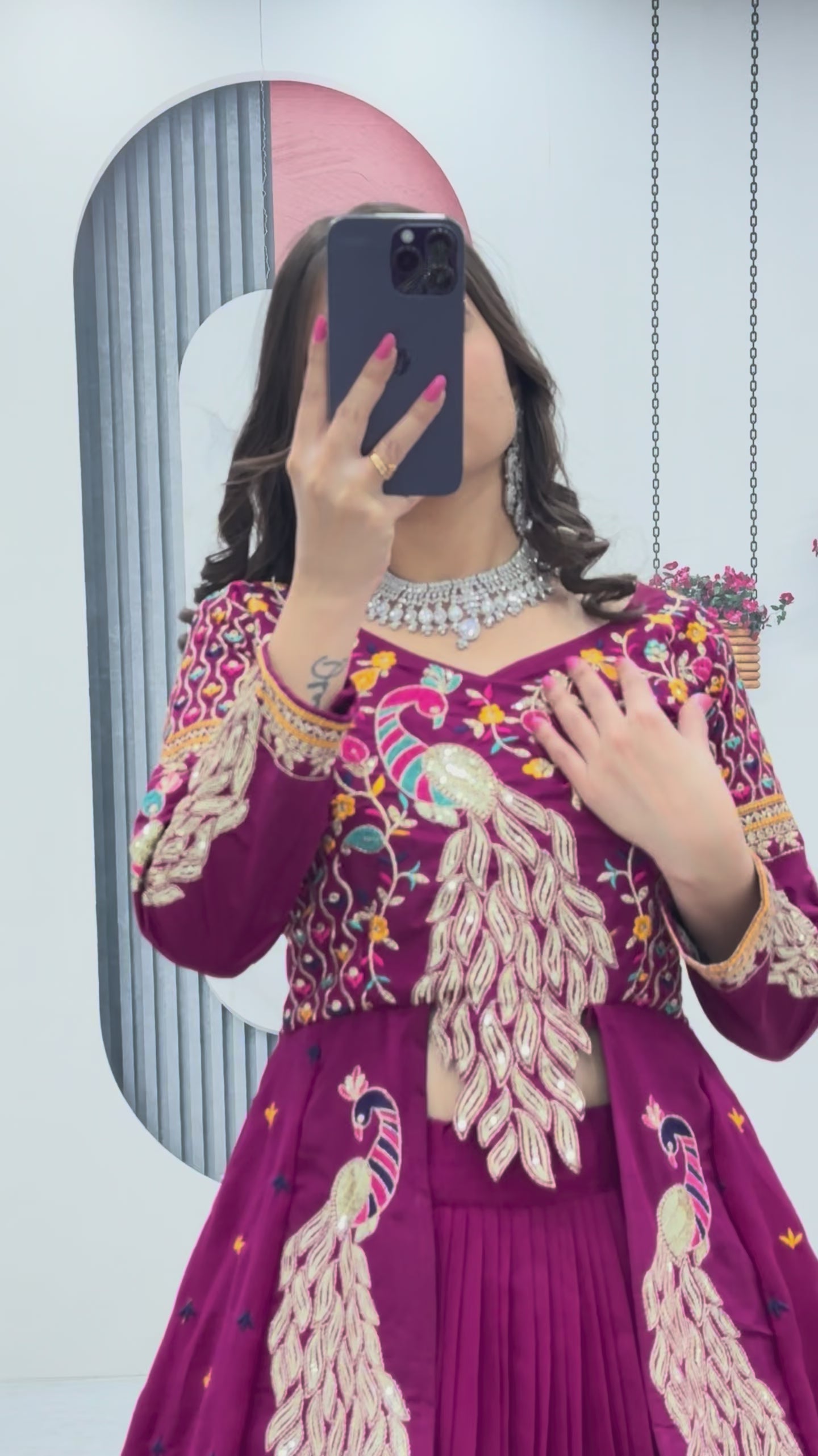 Experience the elegance of our Magneta Color Vichitra Silk Crop Top Peacock Design Lehenga with Embroidered Shrug. Made from high-quality vichitra silk, this crop top lehenga features intricate peacock design and embroidery, exuding sophistication and grace. Perfect for weddings or any special occasion, elevate your style with this stunning ensemble.