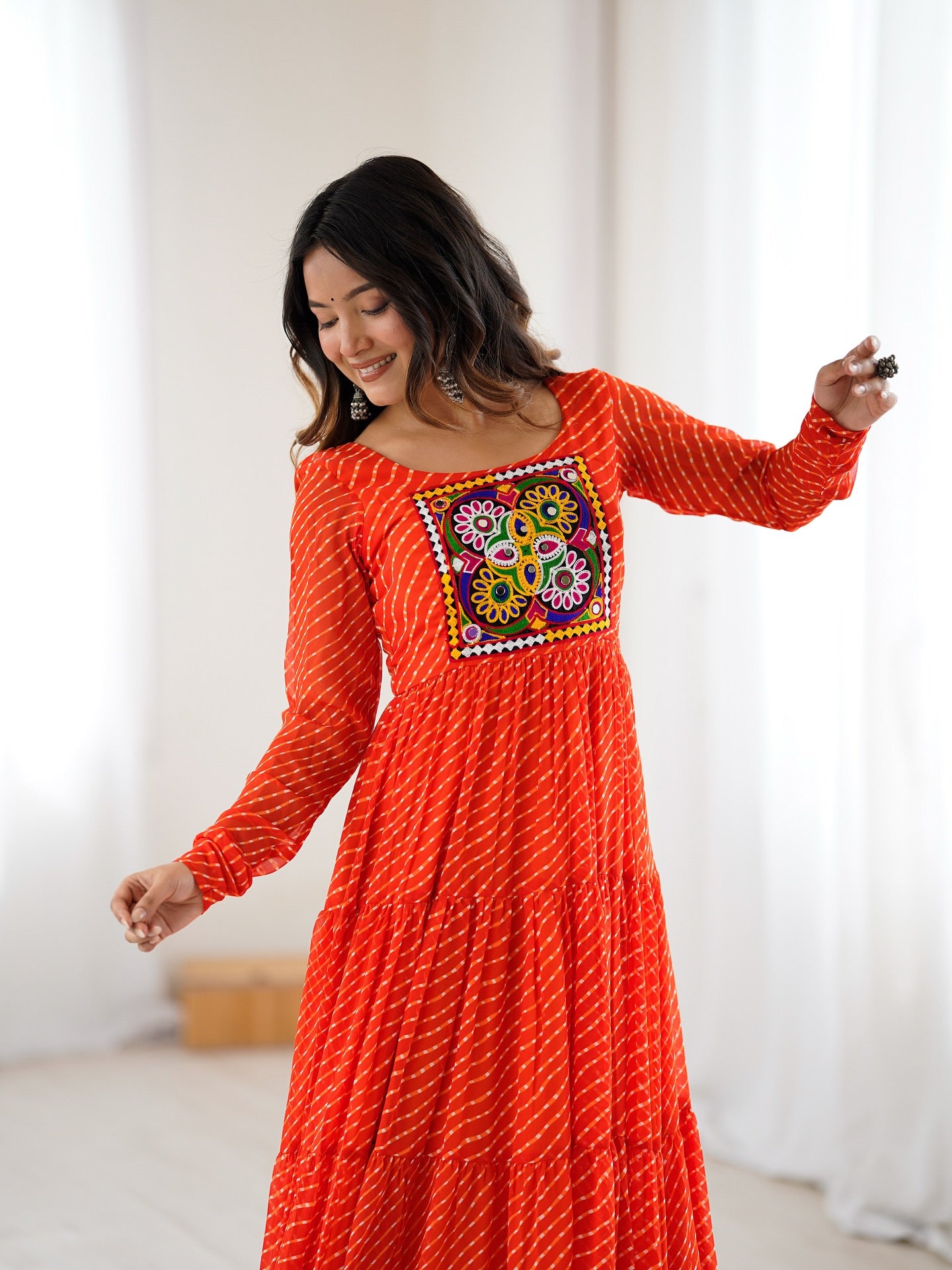 Experience elegance and style in our Manvitha Georgette Leheriya Printed Navratri Gown. Made from high-quality georgette fabric, this gown features a beautiful leheriya print and is designed specifically for the festive season. Add a touch of tradition to your wardrobe and make a statement at any Navratri celebration.
