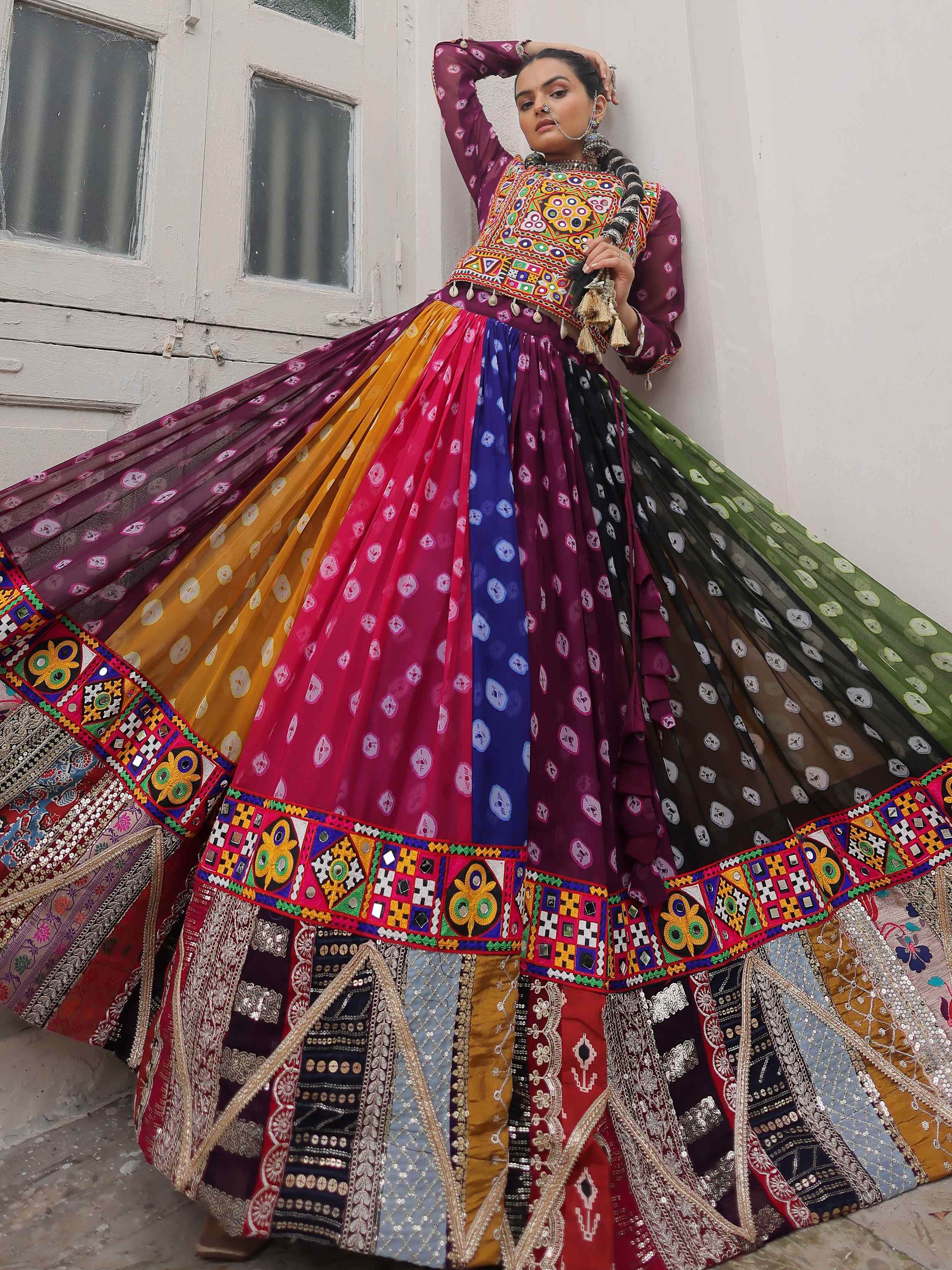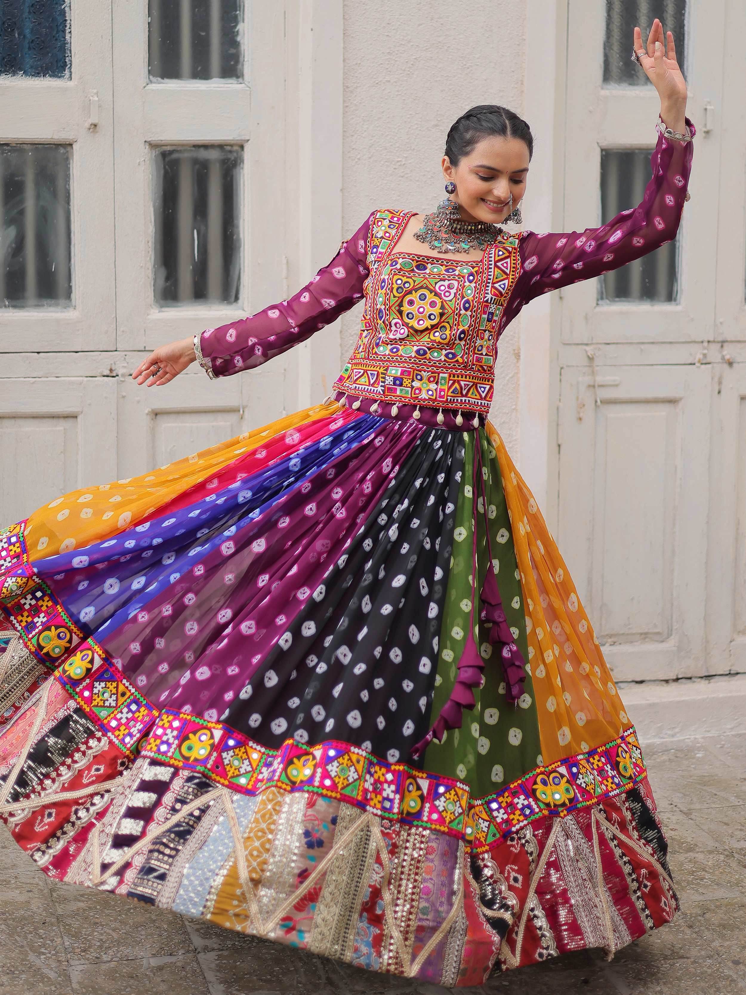 Bring festive elegance to life with Trinaari’s Multicolor Georgette Lehenga Choli, featuring an exquisite blend of traditional prints, vintage artistry, and Gamthi embellished work. With a graceful 5-meter flair and a soft cotton lining, this lehenga ensures both style and comfort for Navratri nights, Garba celebrations, weddings, and festive gatherings.