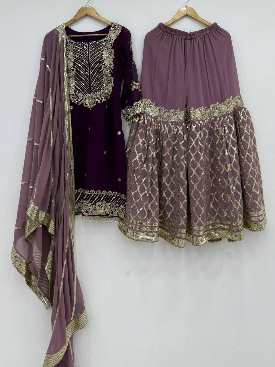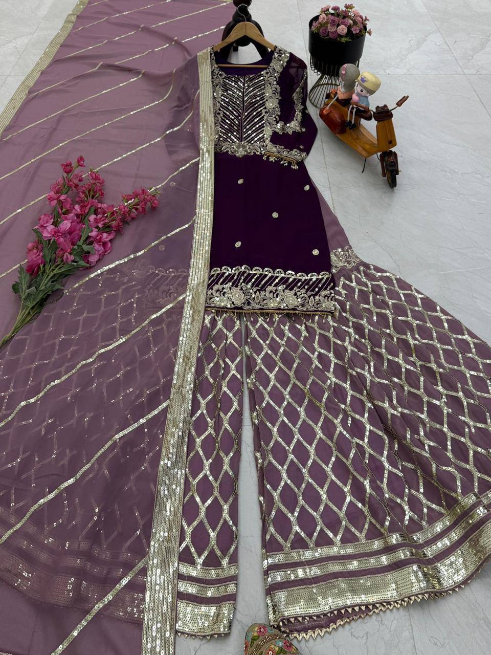Purple Color Fox Georgette Embroidered Heavy Sequence Work Kurti Palazzo Set