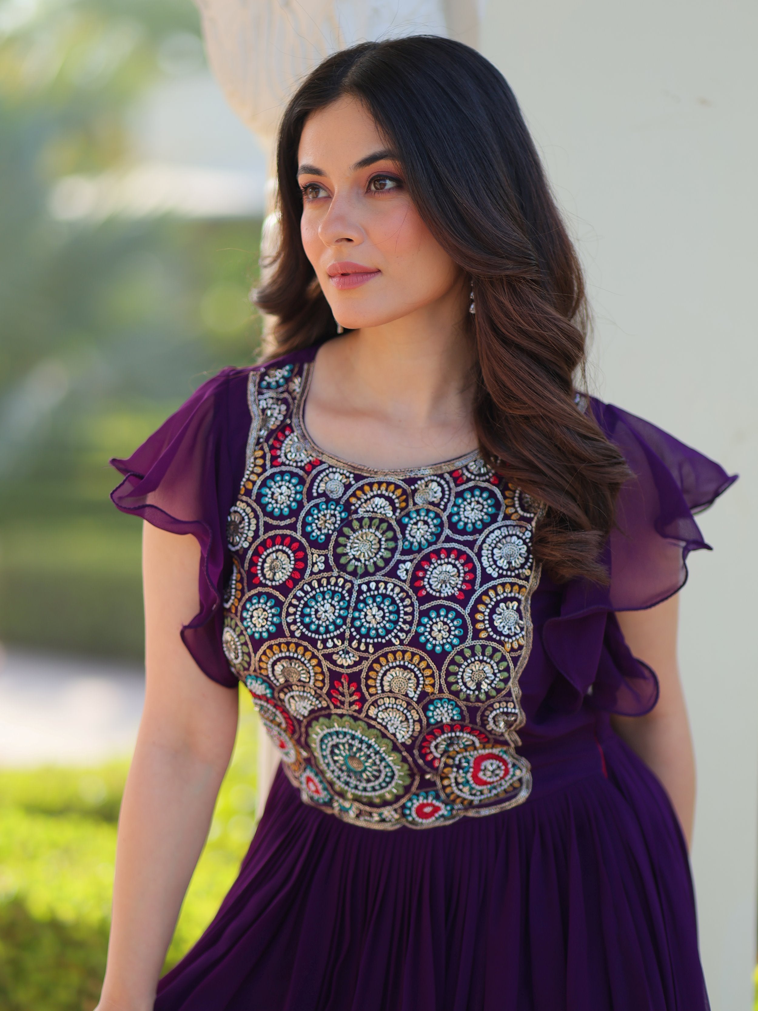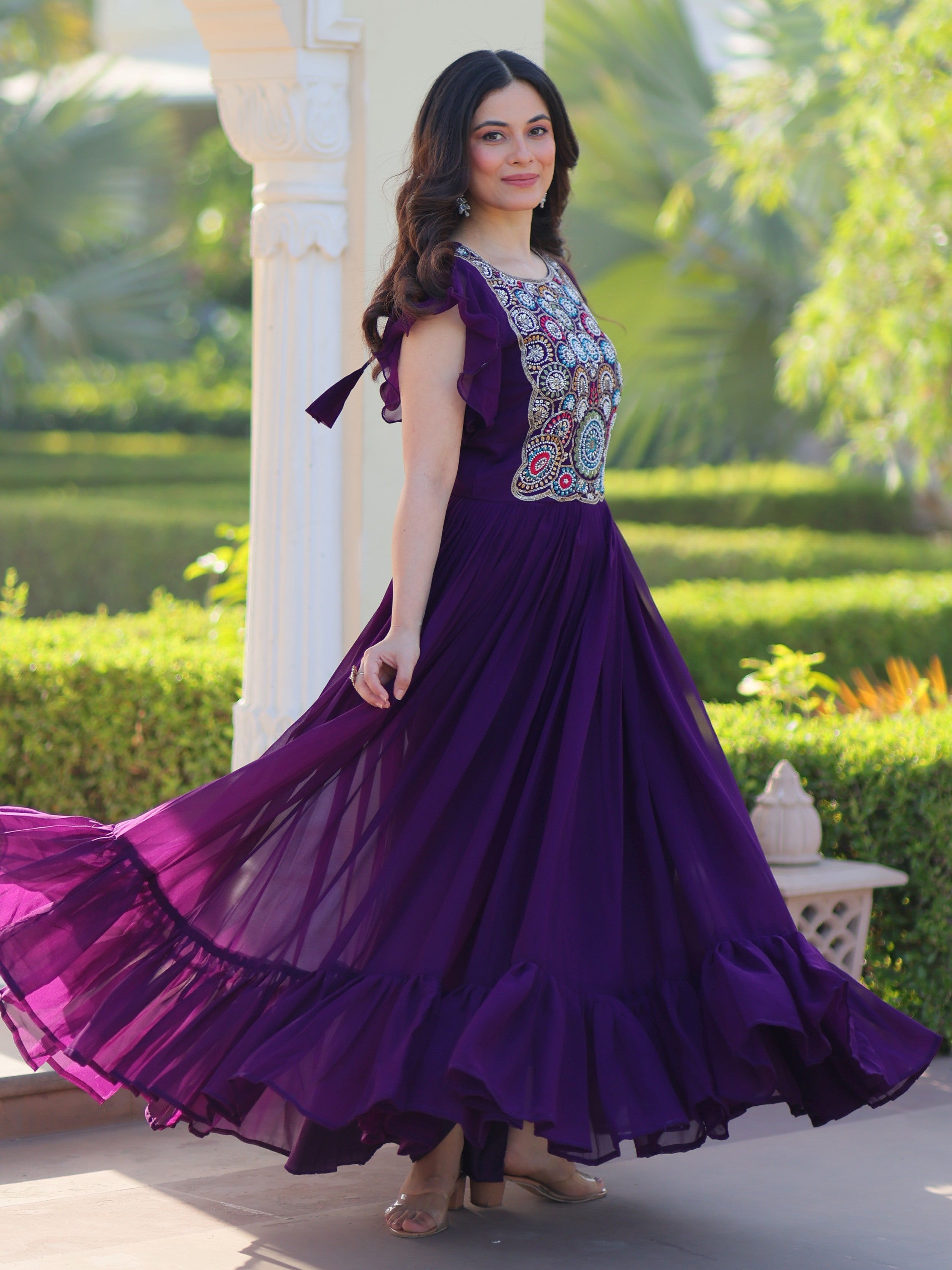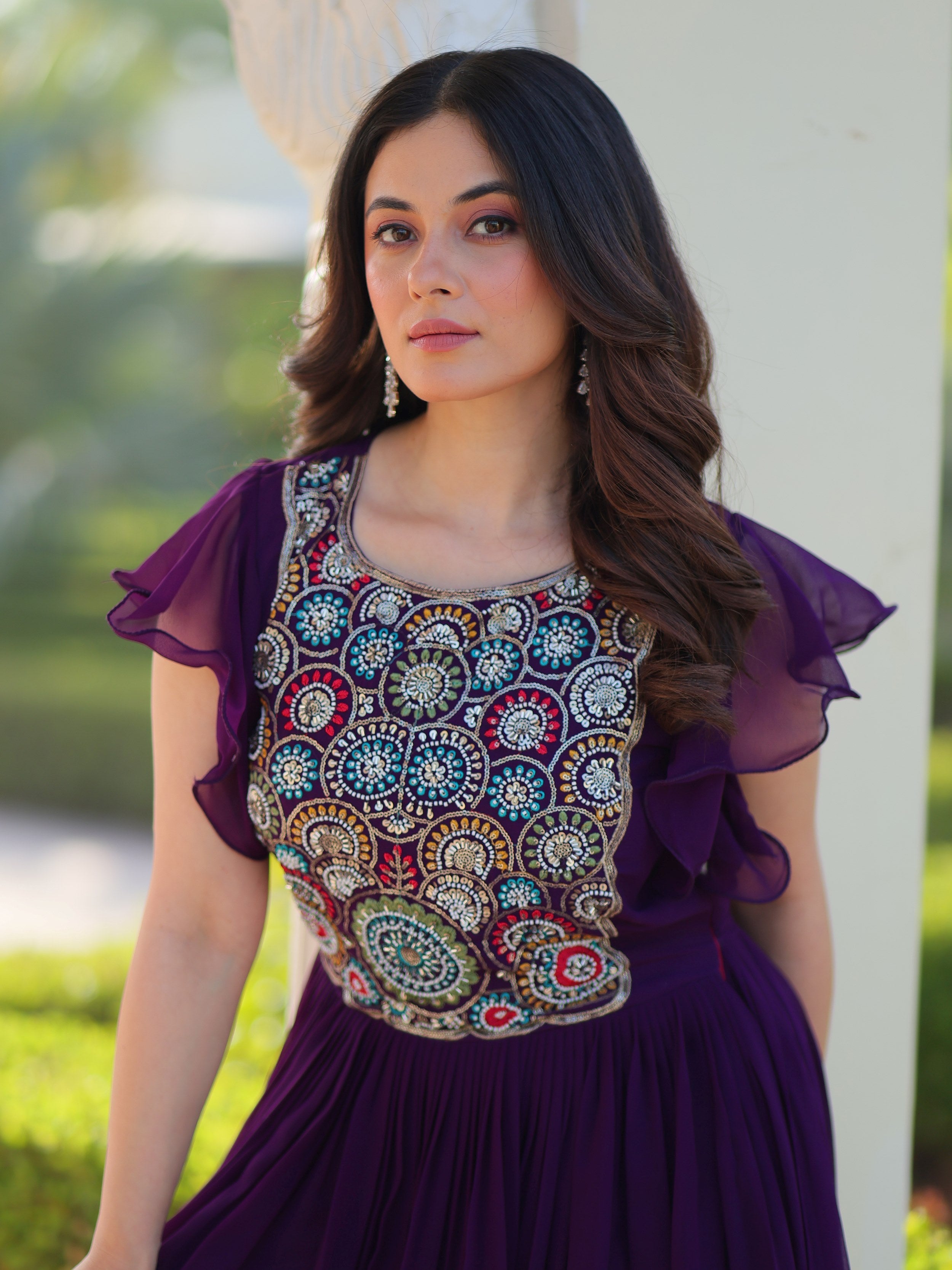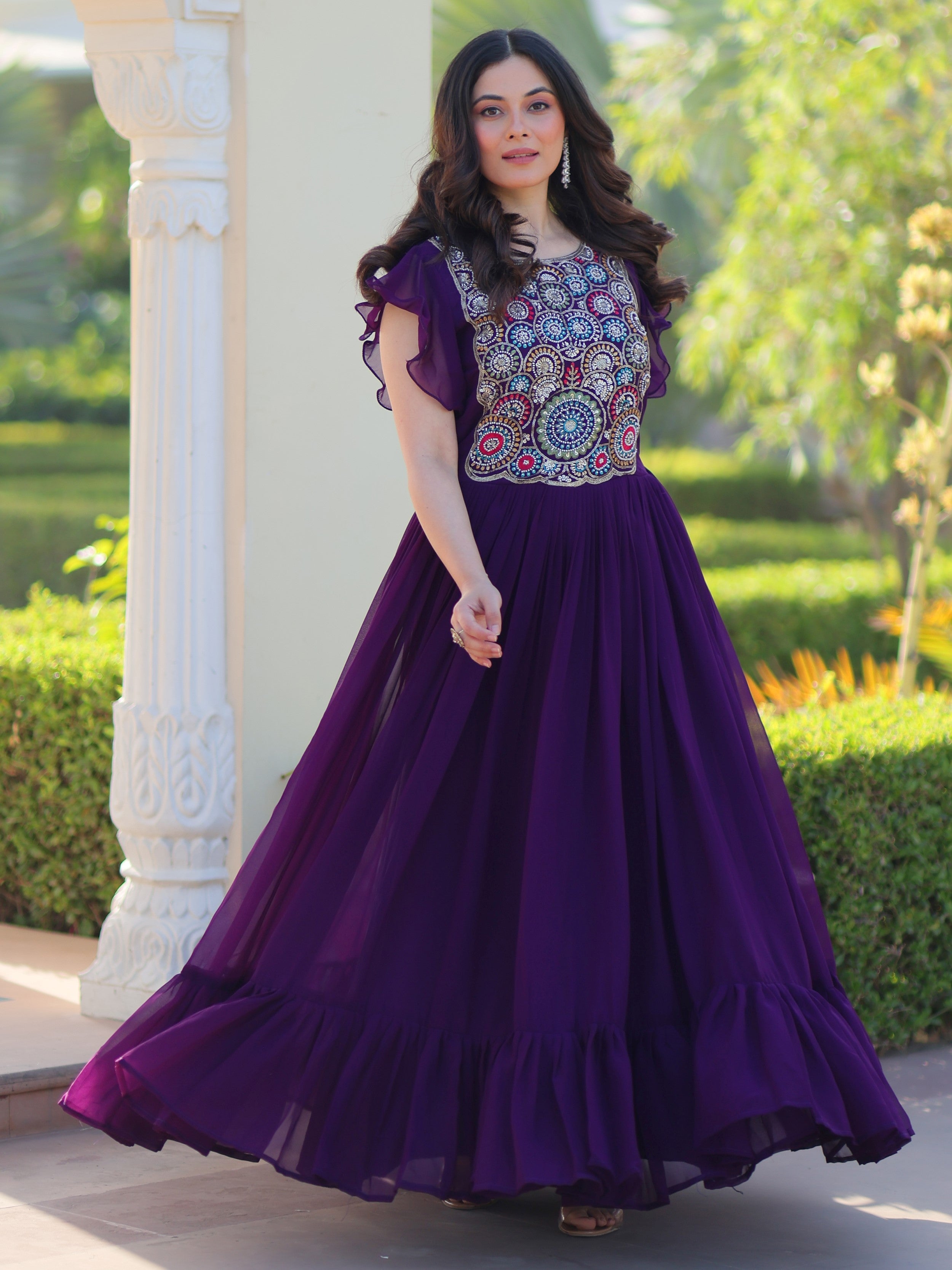 Grace meets grandeur in this Purple, beautifully designed with intricate multithread embroidery, shimmering sequins, and beadwork that lend a festive radiance to your look. Crafted for occasions that call for effortless elegance, this gown is a perfect pick for wedding functions, evening receptions, or traditional celebrations.