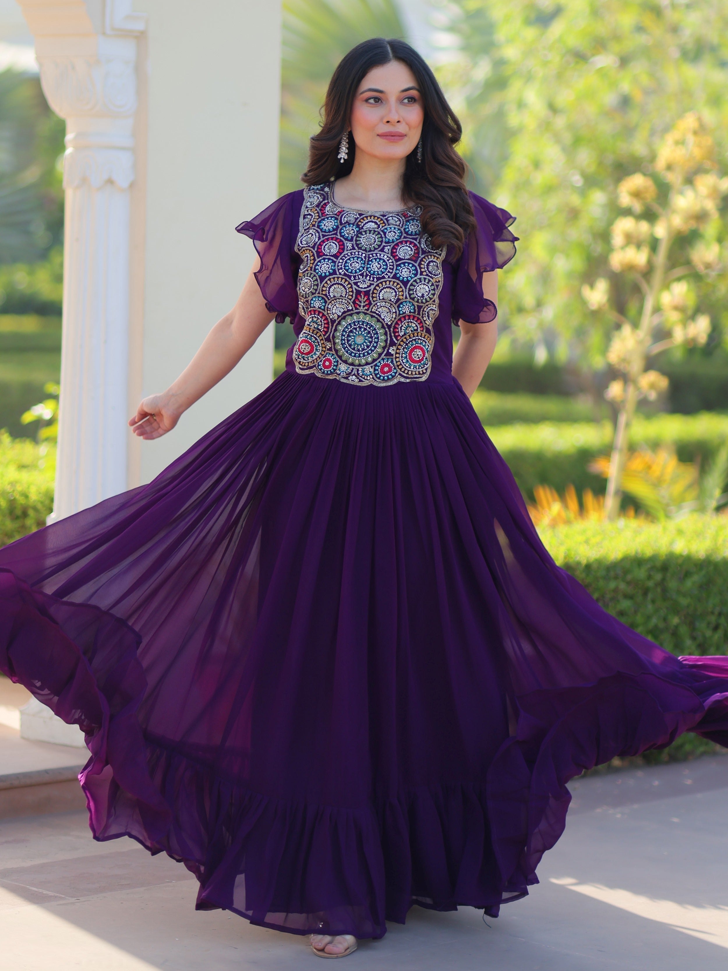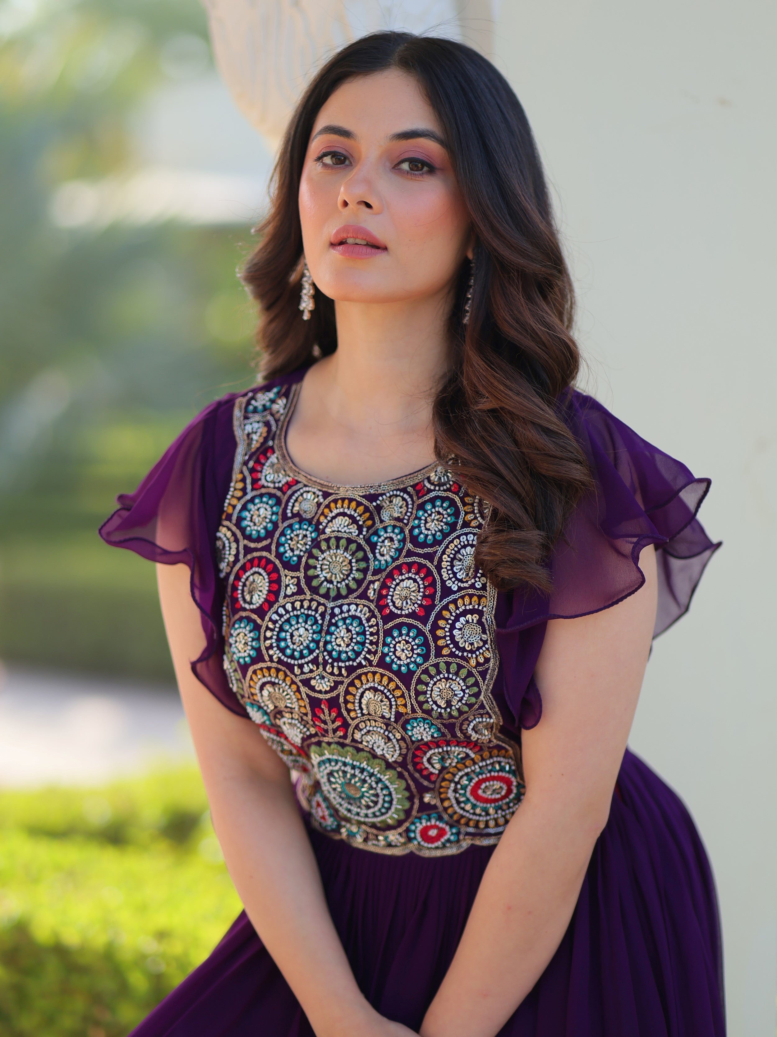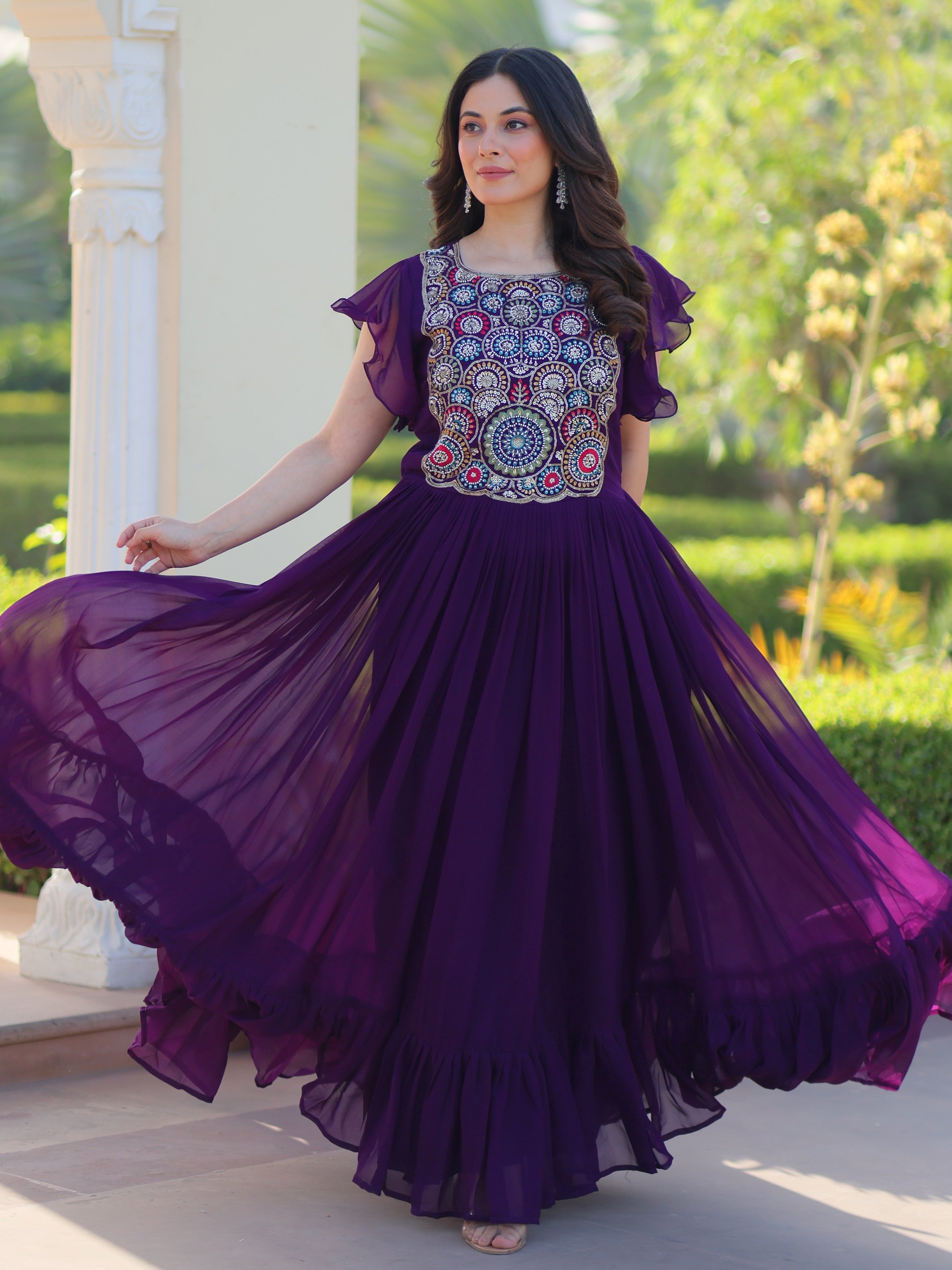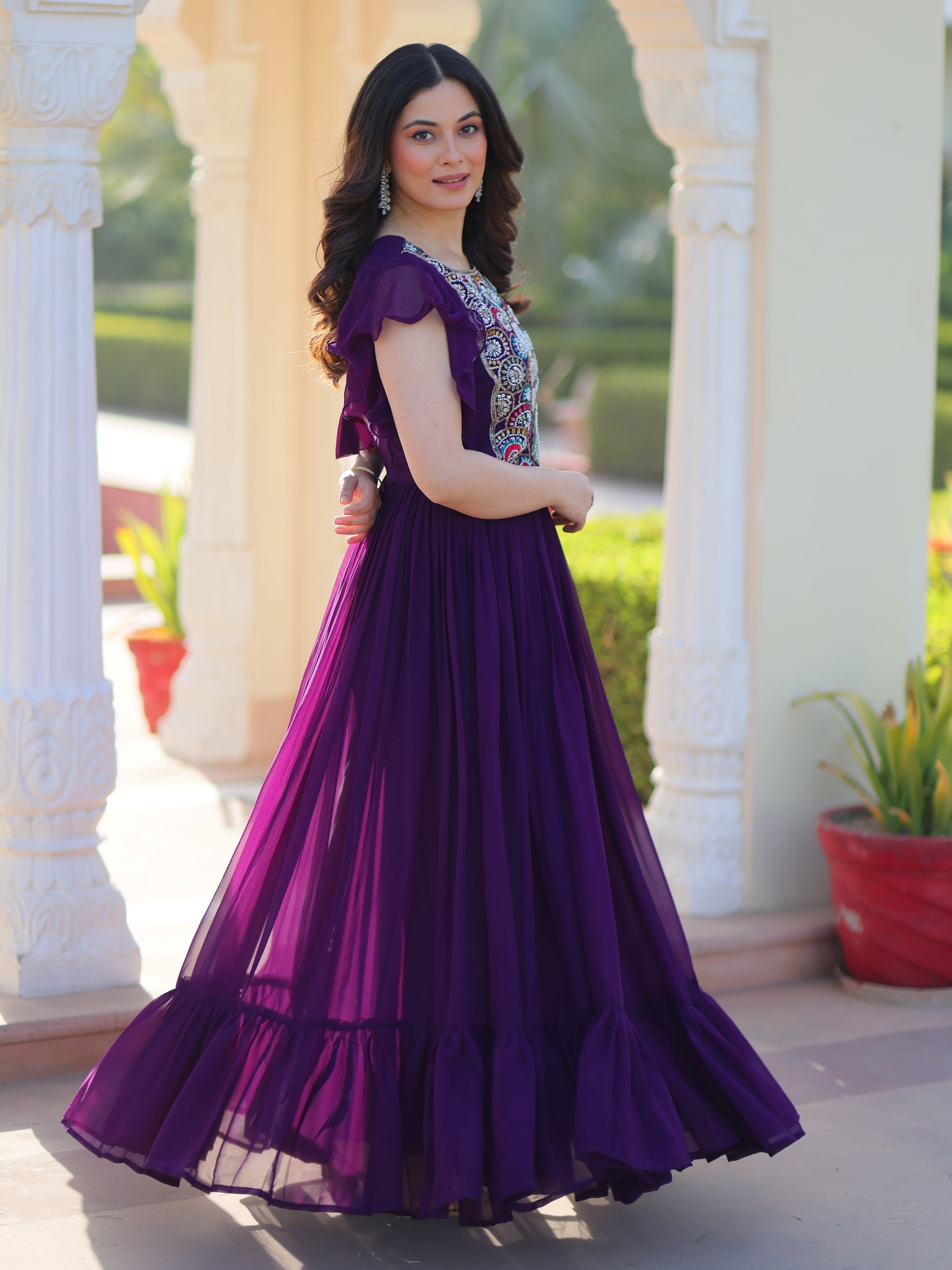 Grace meets grandeur in this Purple, beautifully designed with intricate multithread embroidery, shimmering sequins, and beadwork that lend a festive radiance to your look. Crafted for occasions that call for effortless elegance, this gown is a perfect pick for wedding functions, evening receptions, or traditional celebrations.