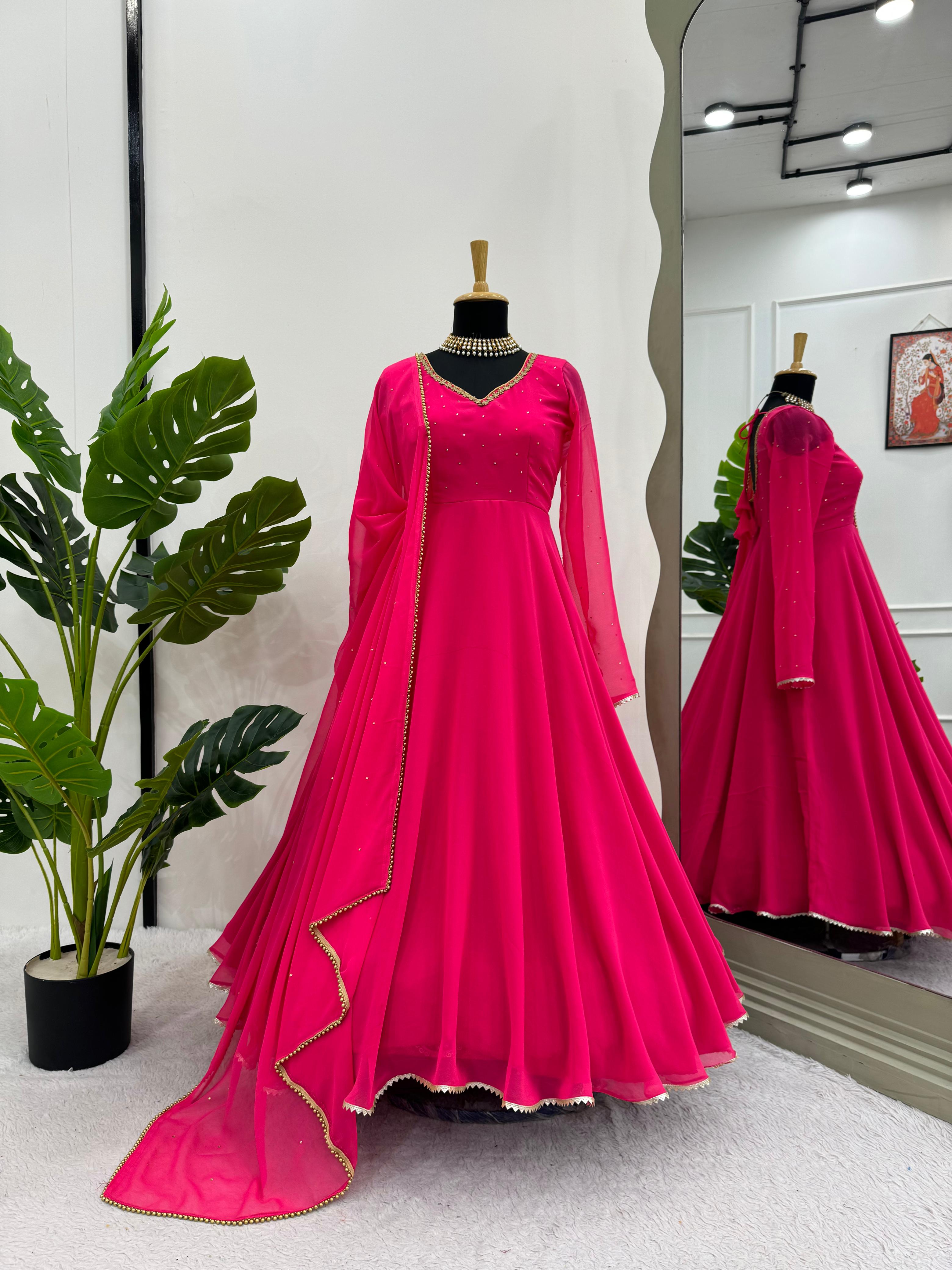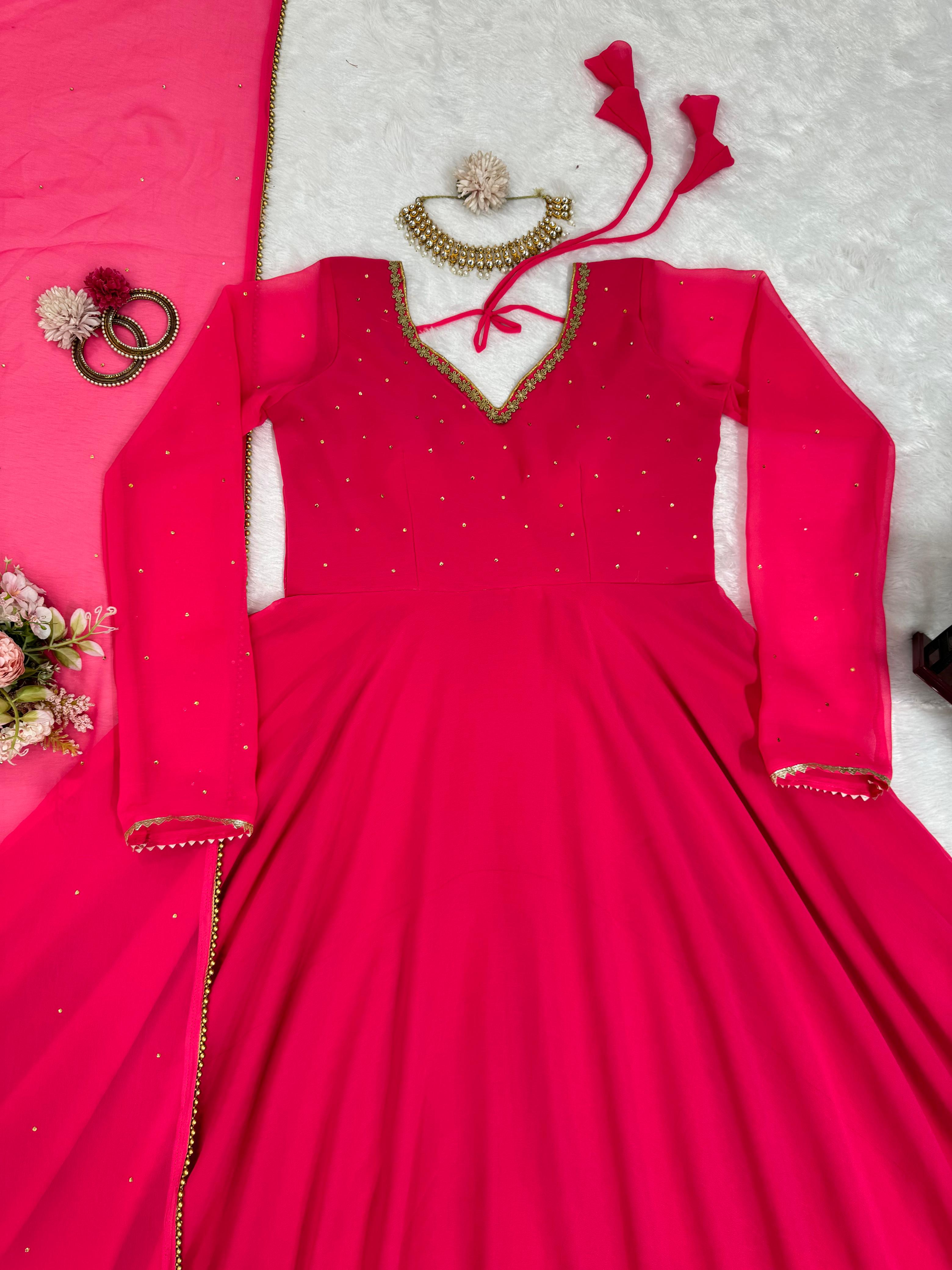 Expertly designed and adorned with intricate embroidery, our Rina Dark Pink Anarkali Suit Set exudes elegance and charm. Crafted with high-quality fabric, this suit set is comfortable to wear and showcases an exquisite traditional style. Elevate your ethnic wardrobe and make a statement with this stunning ensemble.