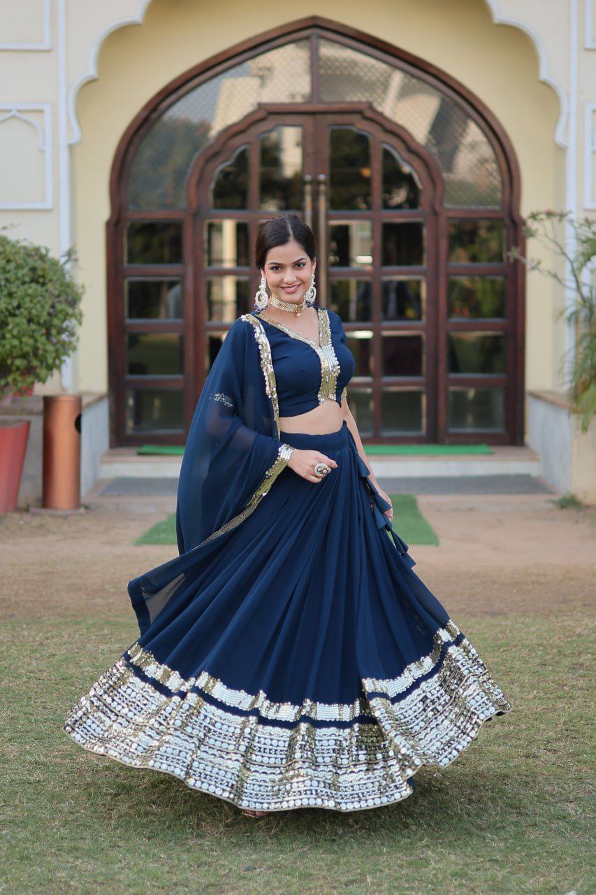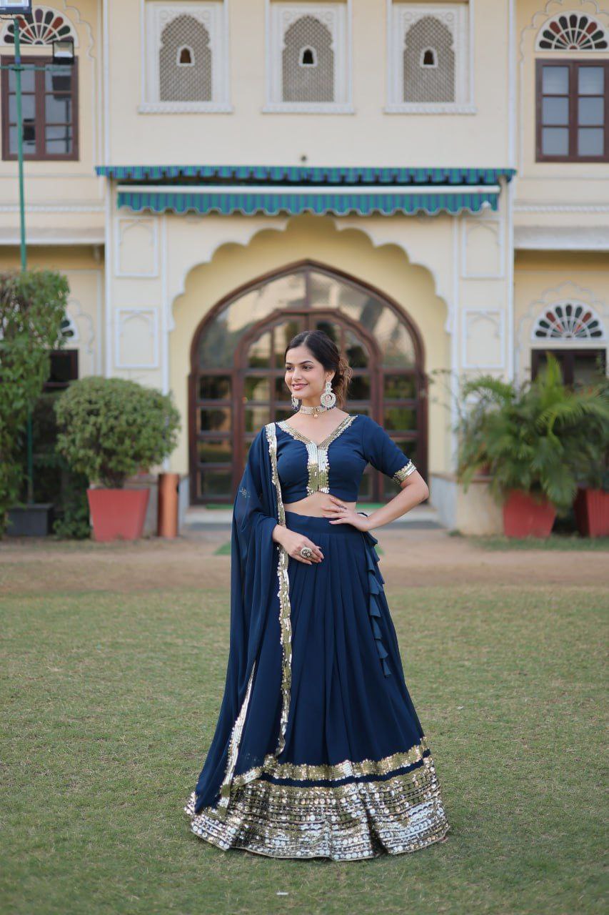 Get ready to shine in our Royal Radiance ensemble! This georgette lehenga choli is adorned with stunning sequin embellishments, adding a touch of grandeur to your look. Perfect for any special occasion, this ensemble will make you feel like royalty while turning heads!
