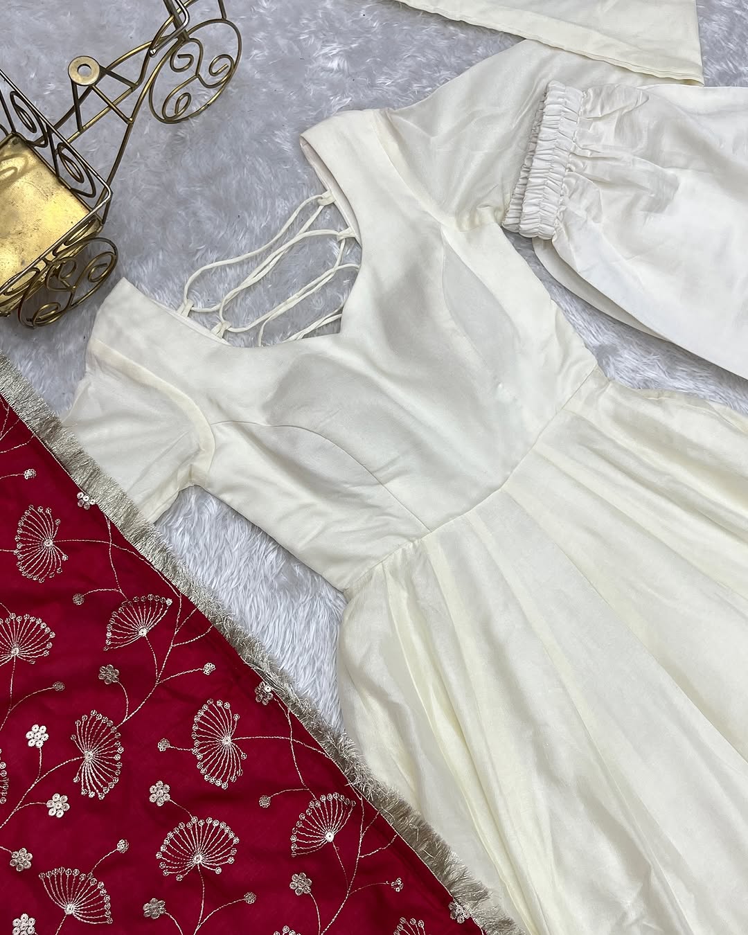 Take a risk and stand out in this Saesha White Vichitra Silk Anarkali Gown with Pink Dupatta Set. Featuring a bold and unique design, this set is perfect for those who crave adventure. Made with high-quality Vichitra silk, this gown and dupatta duo will make you feel confident and stylish. Don't blend in, dare to be different!