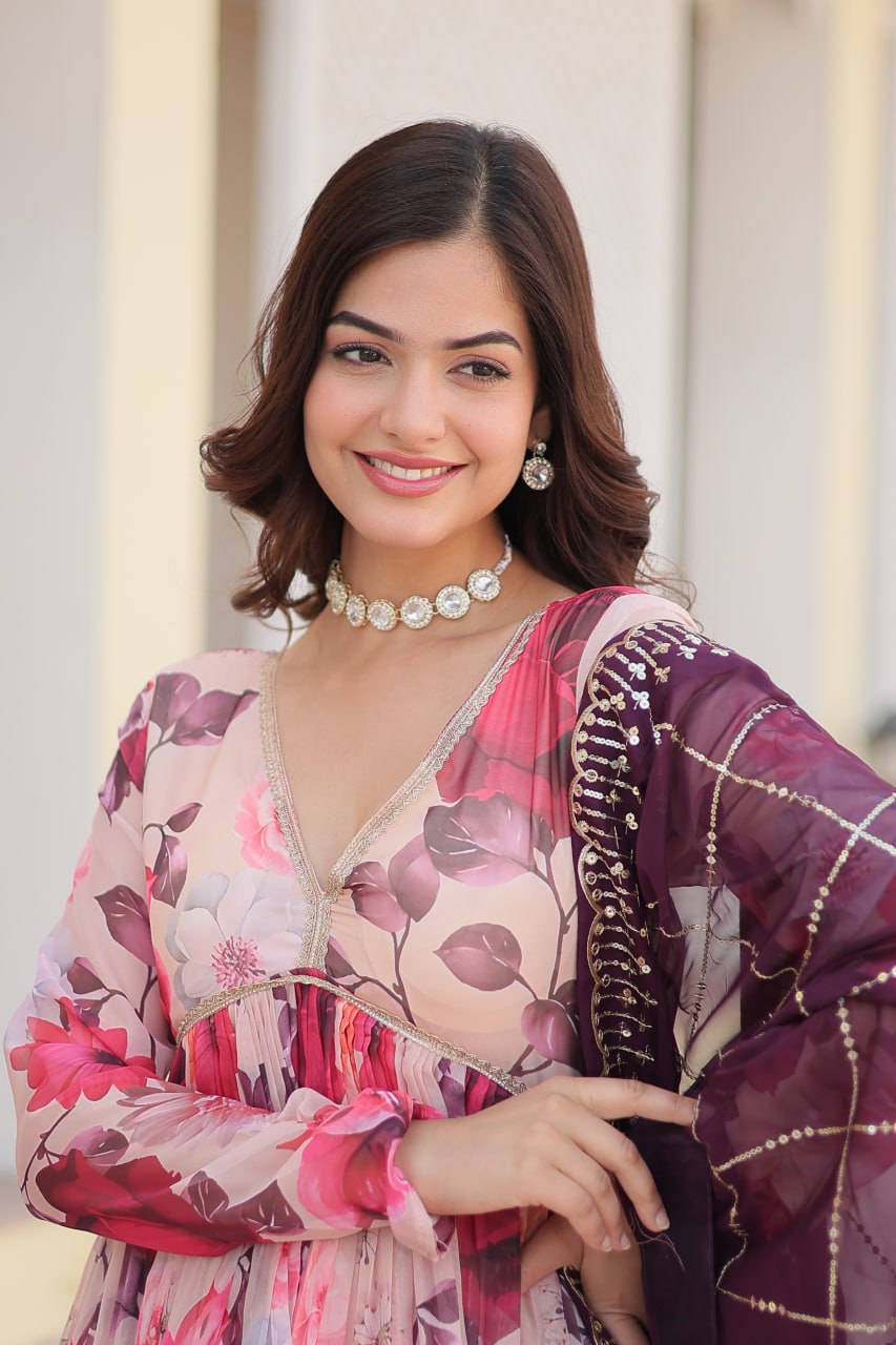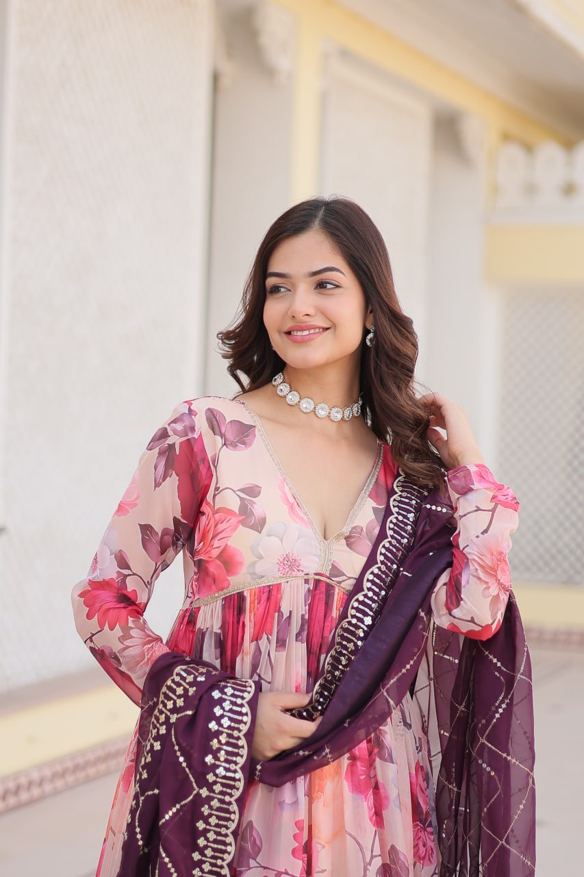 Introducing the Savitri Russian Silk Printed Alia Cut Orange Anarkali Suit Set. Made from luxurious Russian silk, this suit set features a bold, vibrant orange color with delicate printed designs. The Alia cut style adds a touch of modernity while the soft silk fabric provides maximum comfort. Perfect for any occasion.