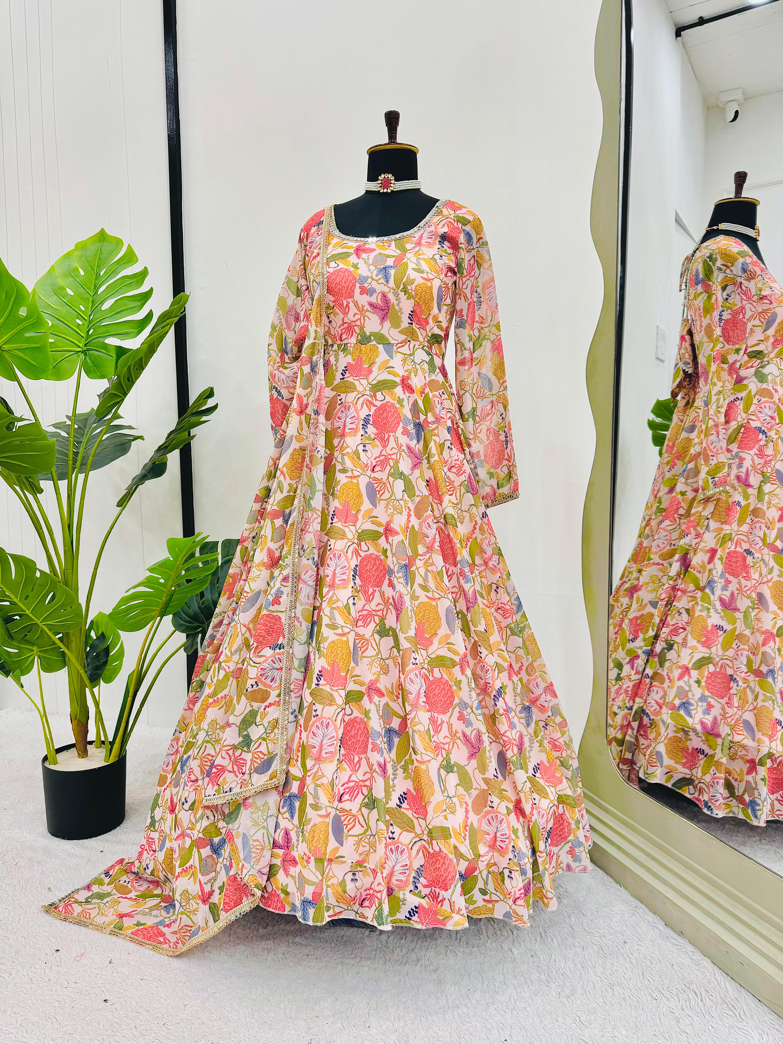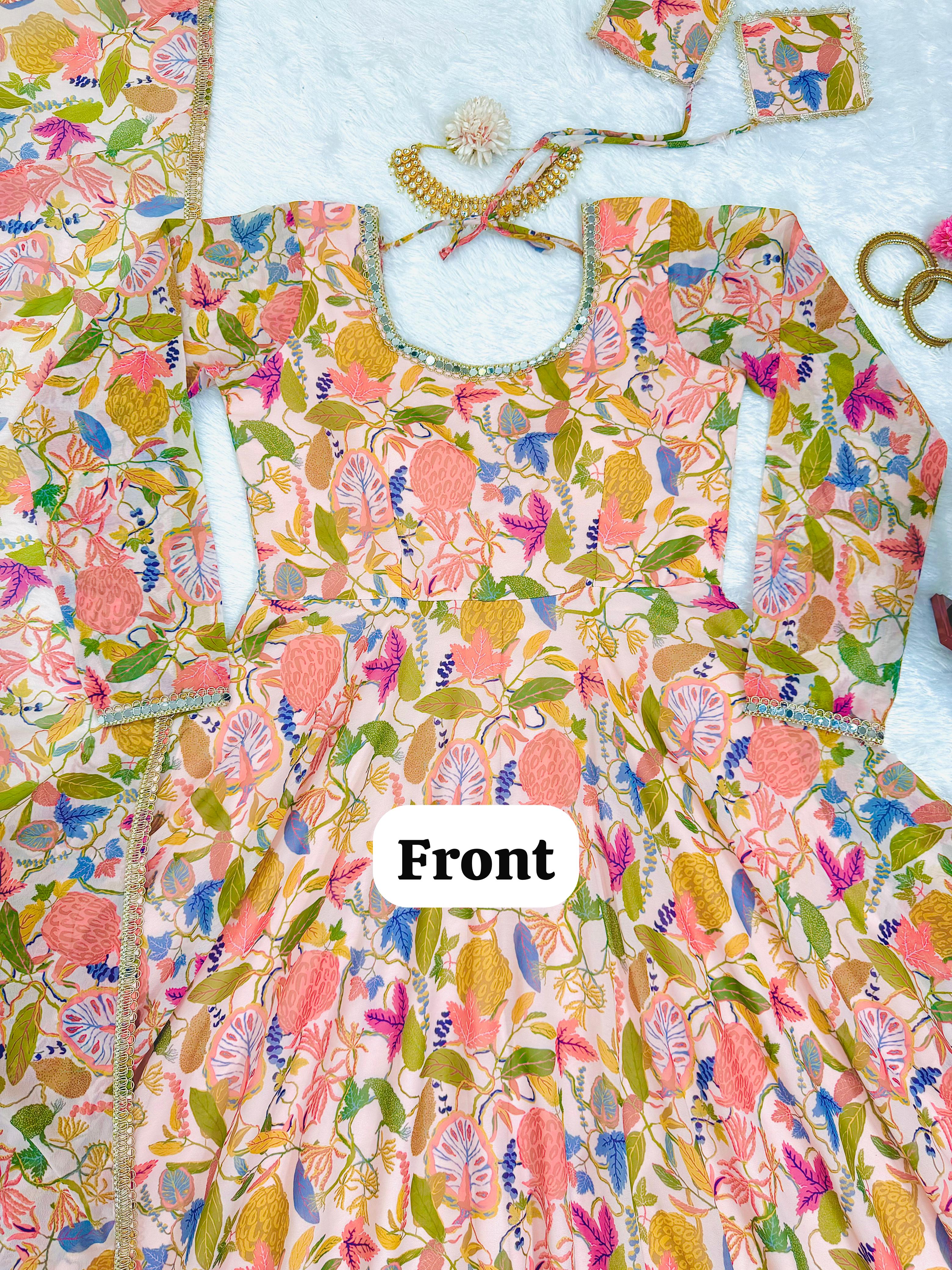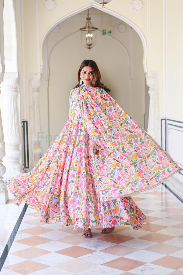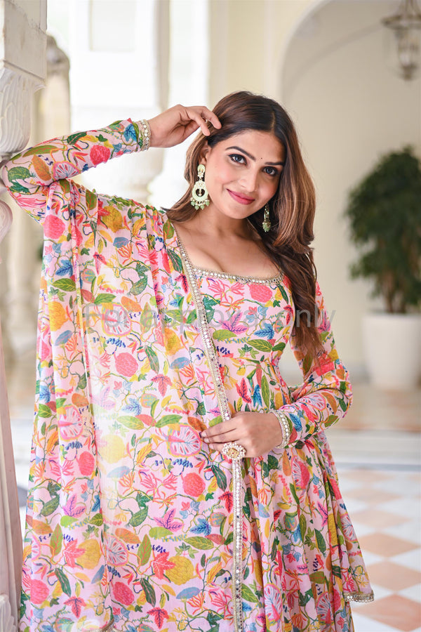 This Vedhika Pink Georgette Anrakali Gown Set features stunning printed and mirror work detailing that adds a touch of elegance to any occasion. Crafted from high-quality georgette fabric, this set is perfect for those looking for a unique and stylish outfit. Make a statement with this beautiful and versatile set.