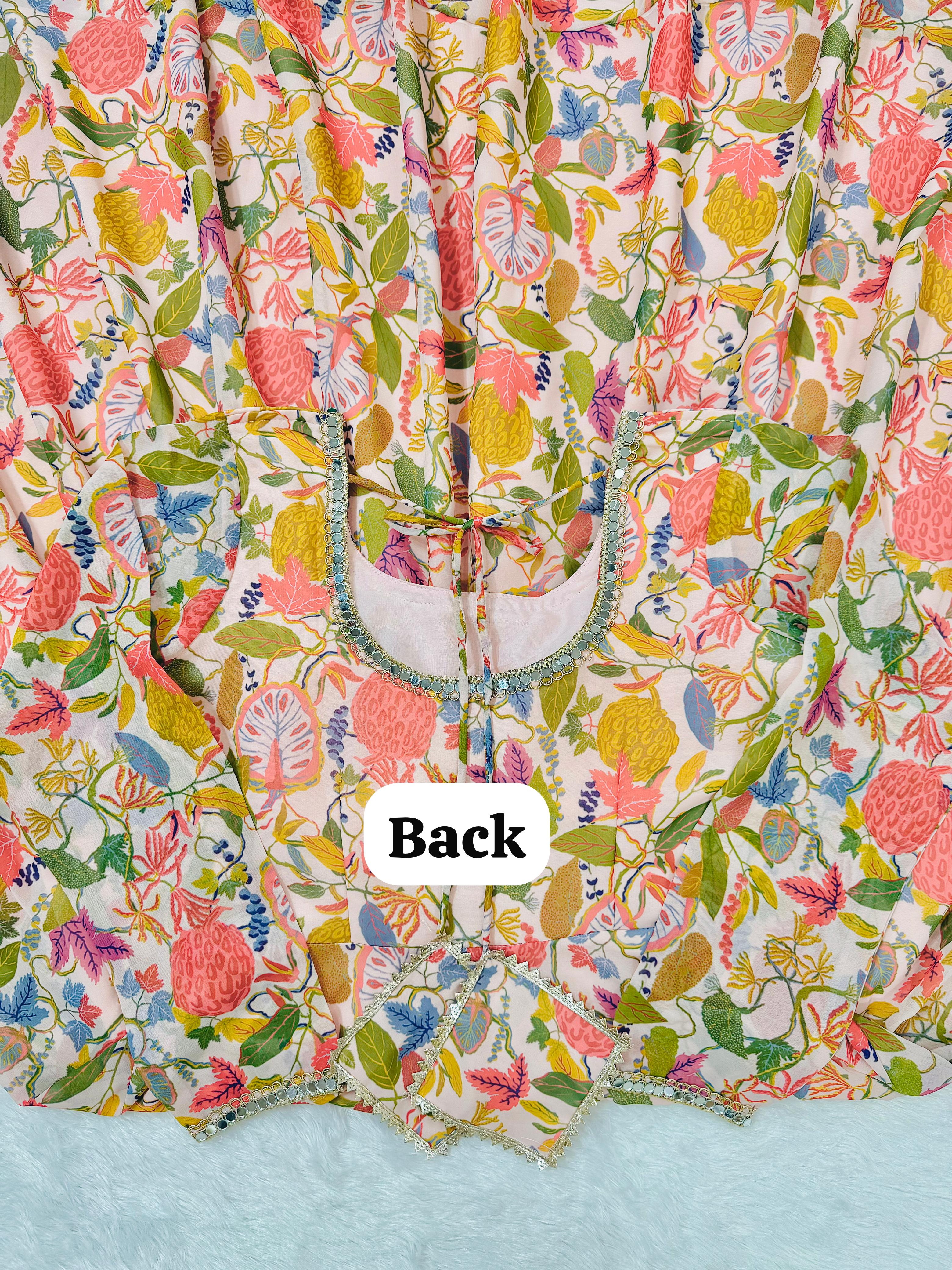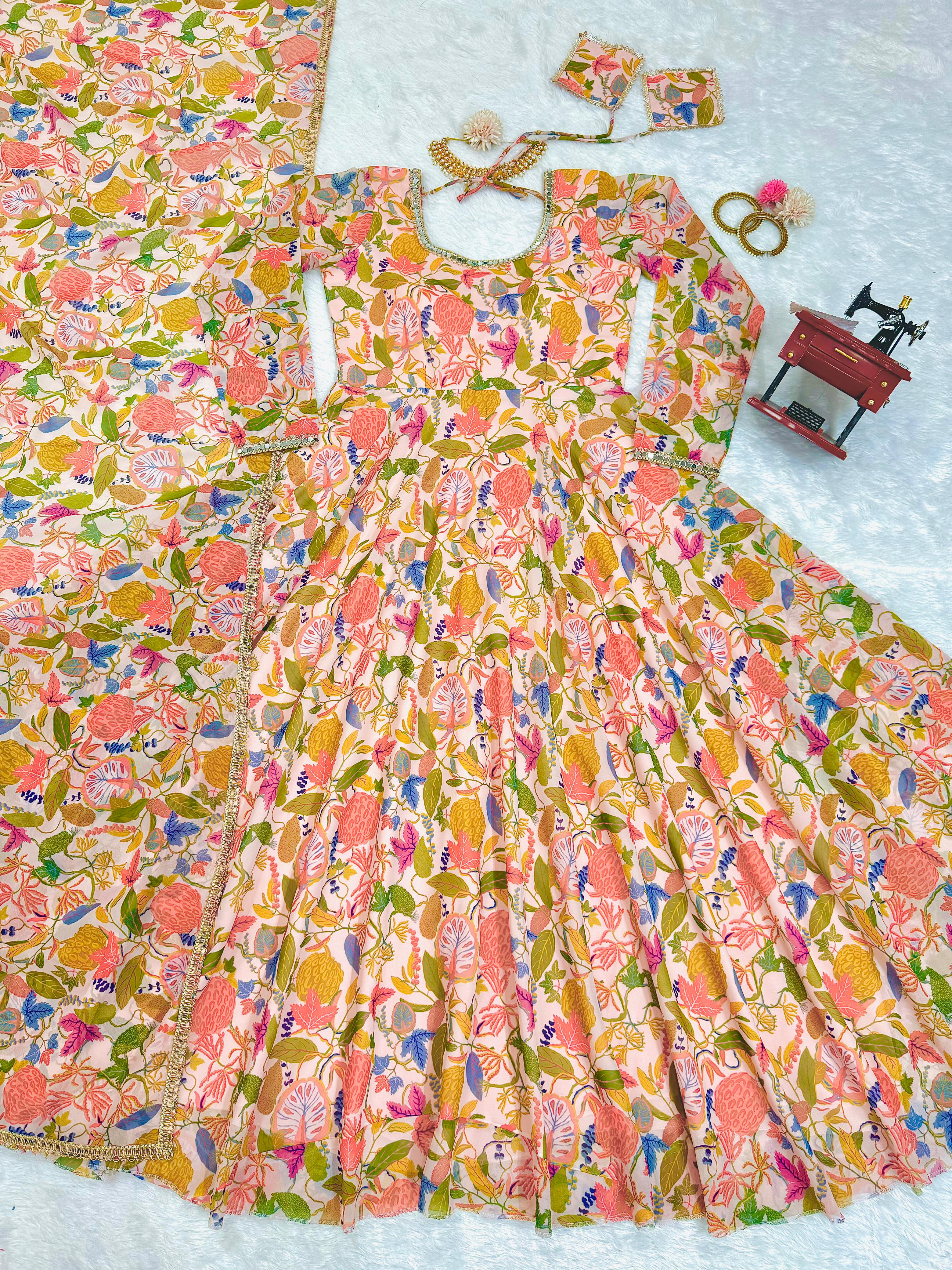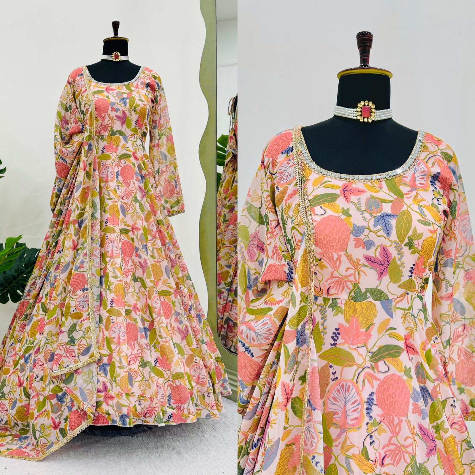 This Vedhika Pink Georgette Anrakali Gown Set features stunning printed and mirror work detailing that adds a touch of elegance to any occasion. Crafted from high-quality georgette fabric, this set is perfect for those looking for a unique and stylish outfit. Make a statement with this beautiful and versatile set.