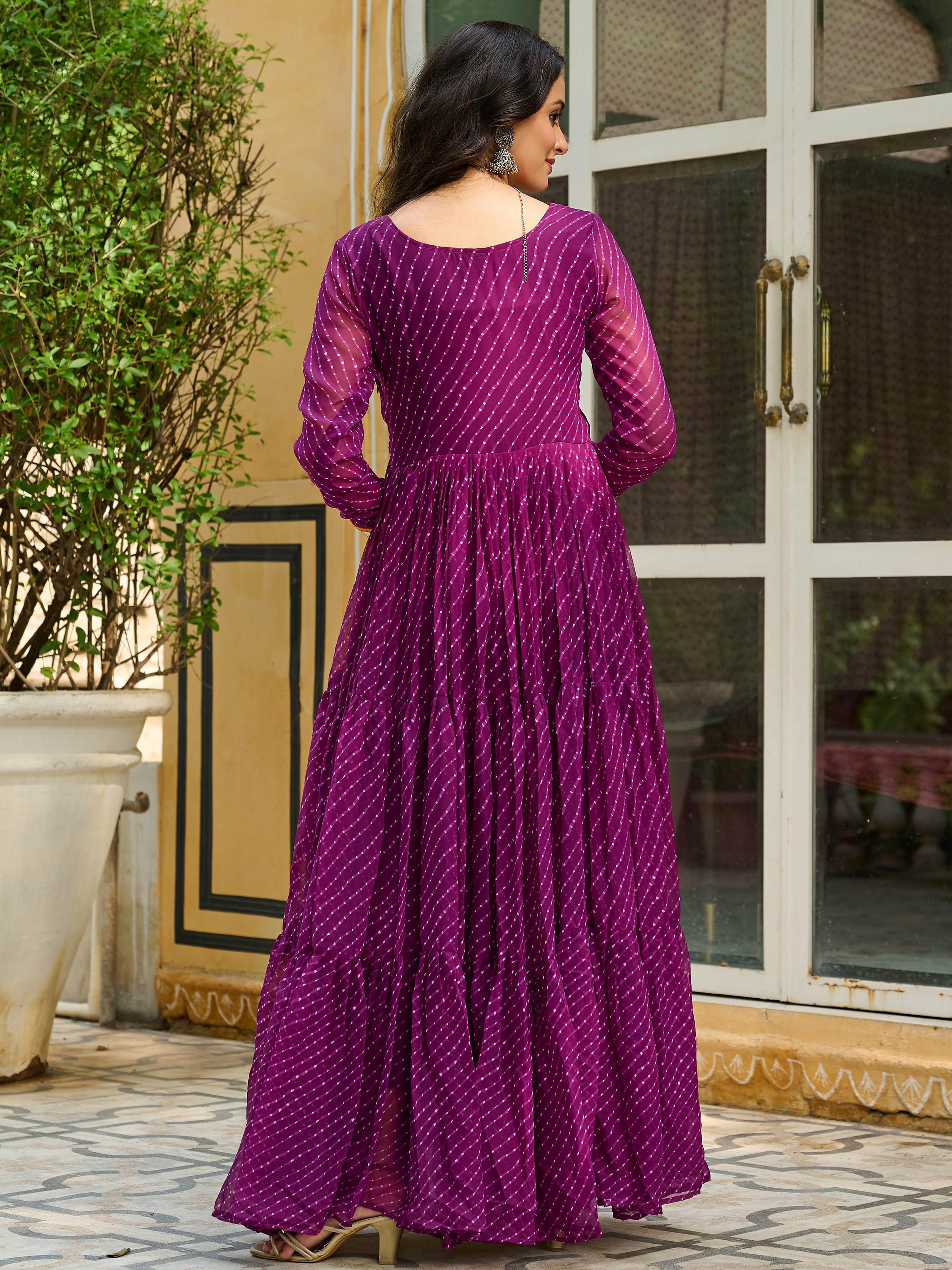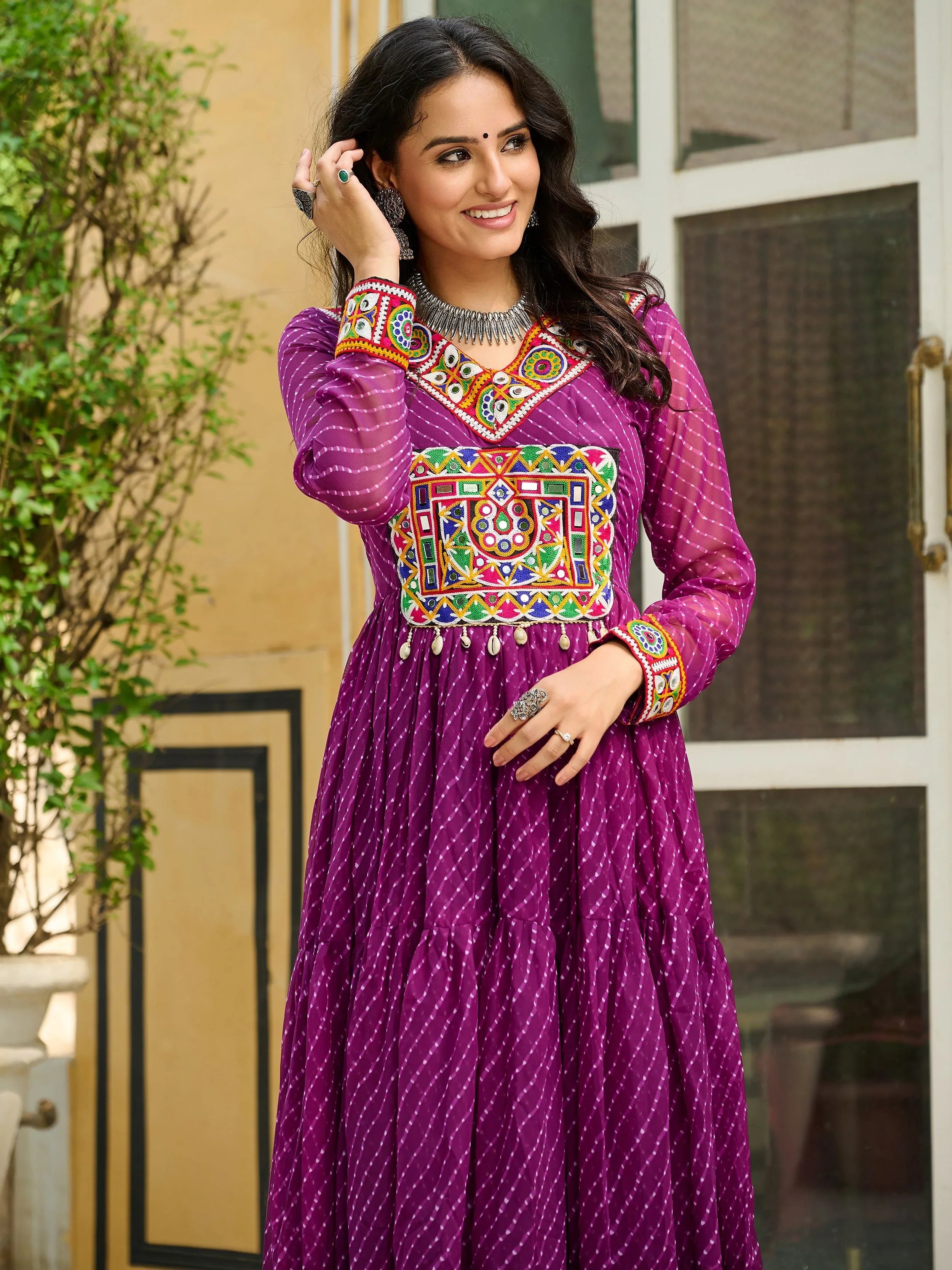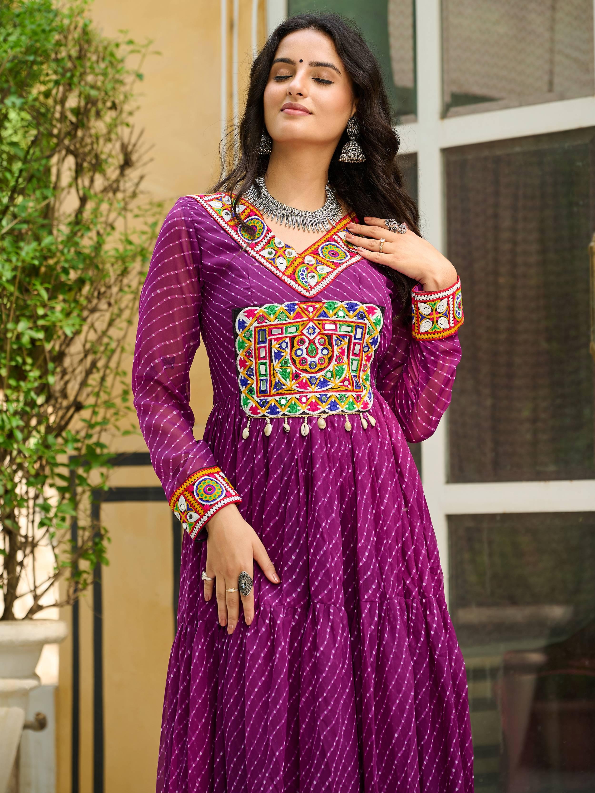 Step into the festive rhythm with this exquisite Wine Laheriya Print Gown, beautifully crafted in lightweight faux georgette and adorned with traditional Kutchi patchwork. With its graceful flow and vibrant detailing, this gown is a perfect pick for Navratri Garba nights, festive sangeet, or ethnic parties.